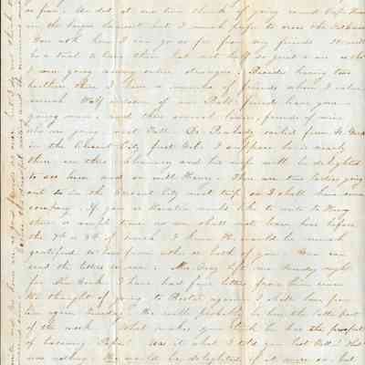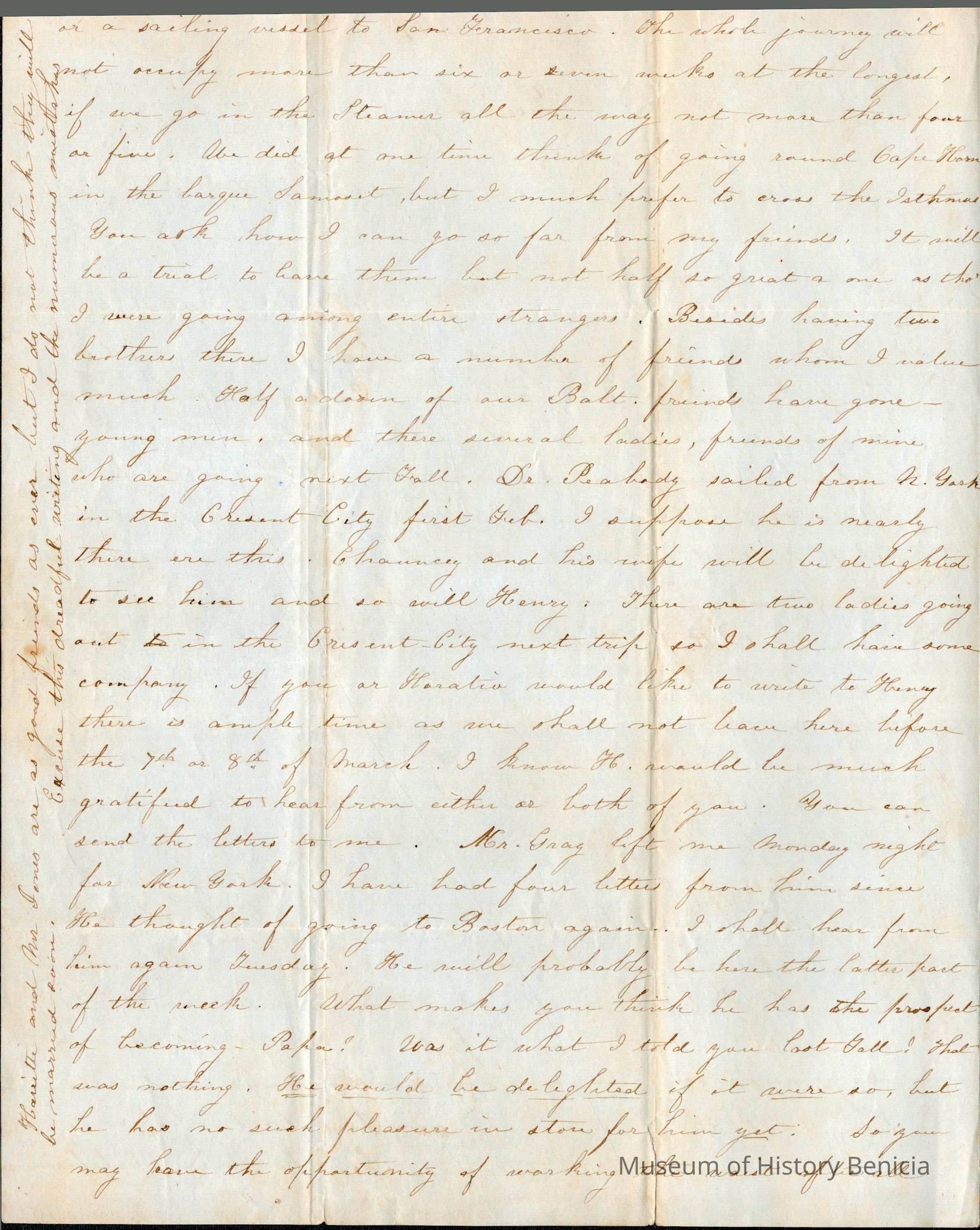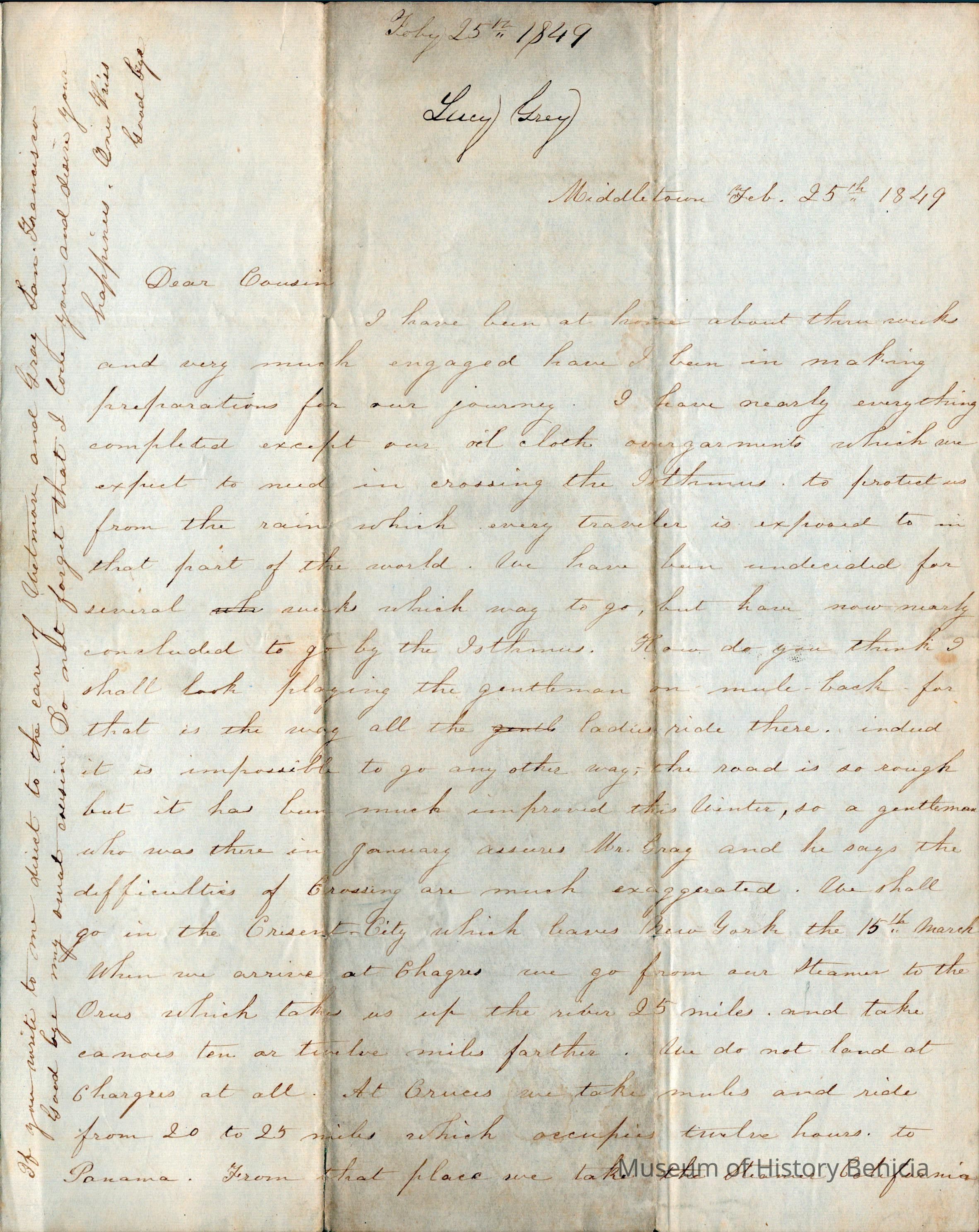 This is a letter from Lucy Wetmore Gray to her cousin Elizabeth A Hayden. It is from Middletown and dated 02/25/1849. (This is prior to Samuel and Lucy leaving for California.) Lucy describes their planned trip across the Isthmus of Panama as: sail on the Crescent City from NY to Chagres / take the Orus up the river 25 miles / canoes for another 10-12 miles / mules for about 20 - 25 miles / to Panama where they wait for the steamer California.