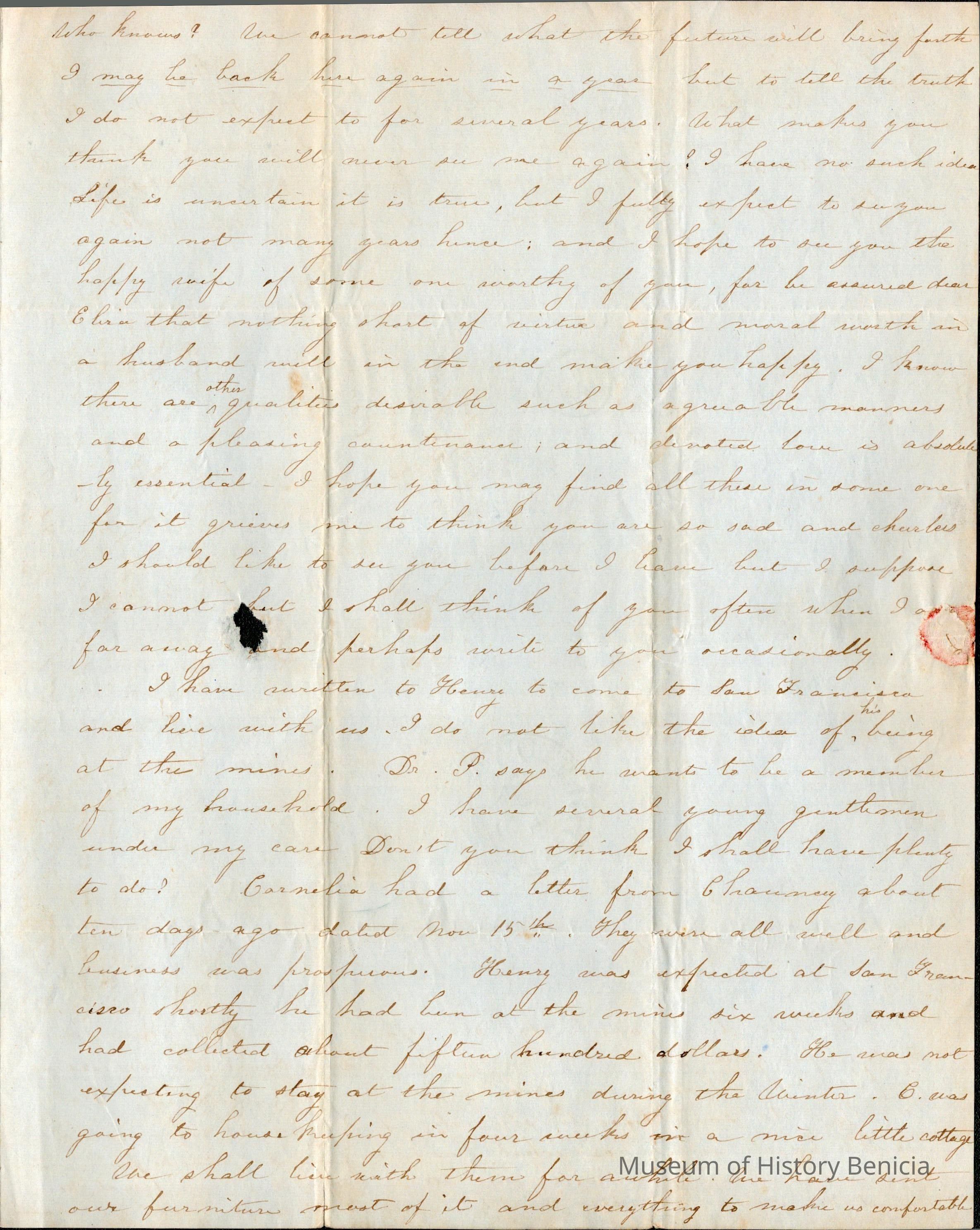 Lucy talks of their living arrangements in San Francisco and hopes that Henry does not stay at the mines but rather stays with them in San Francisco.