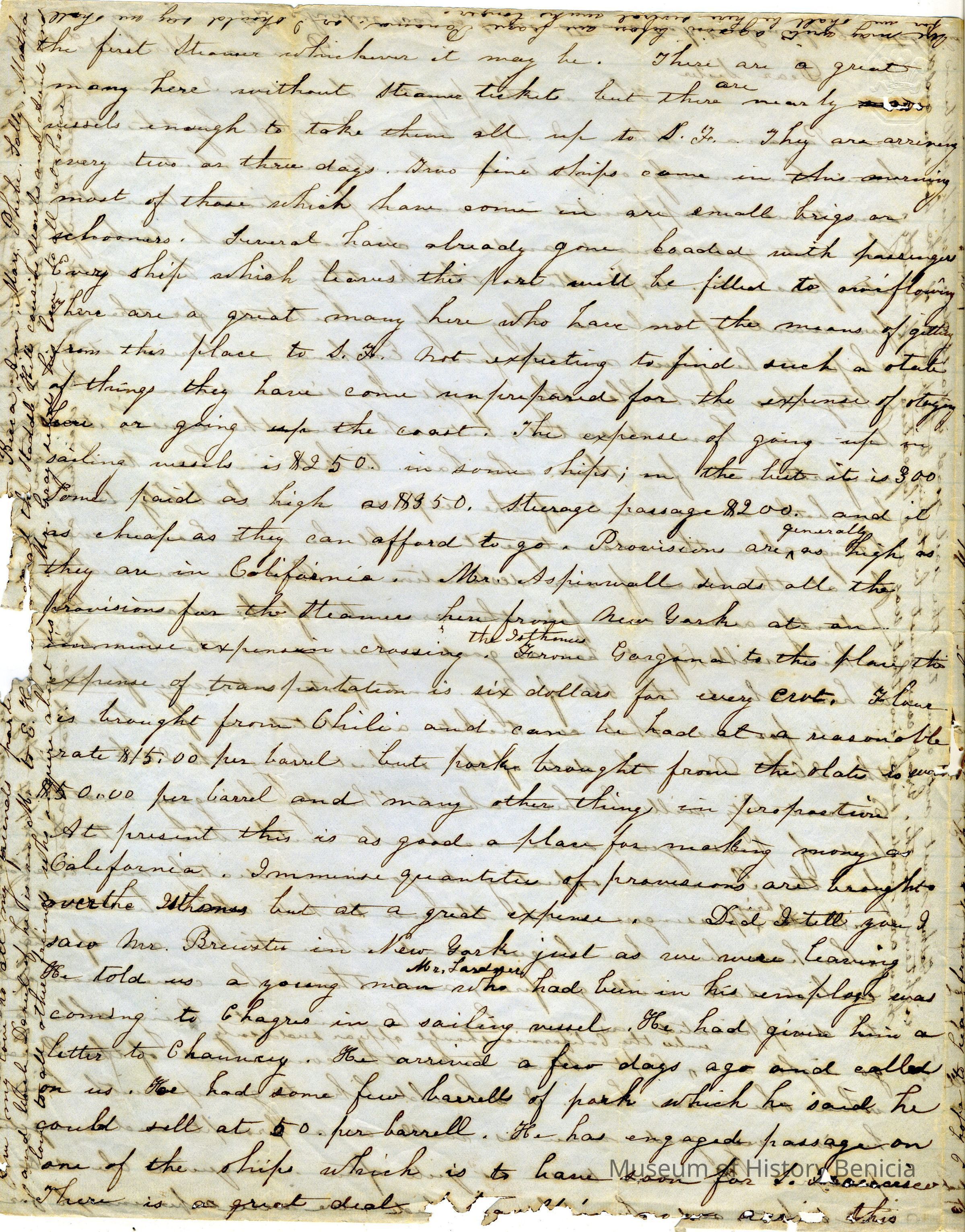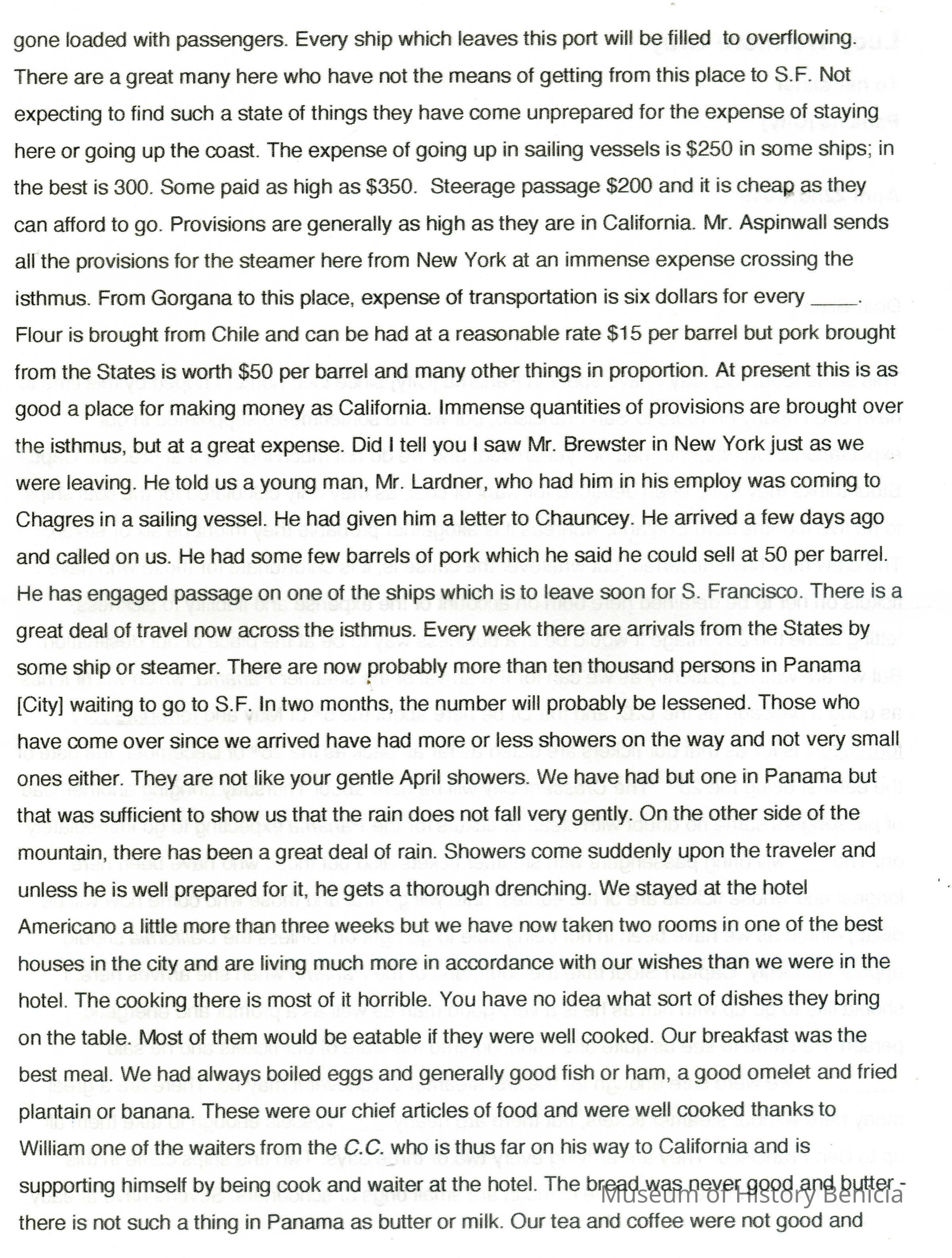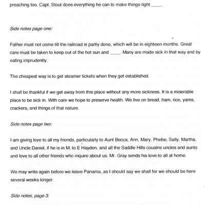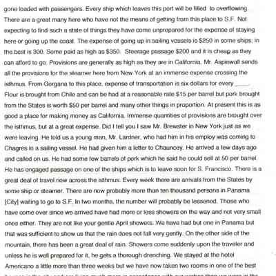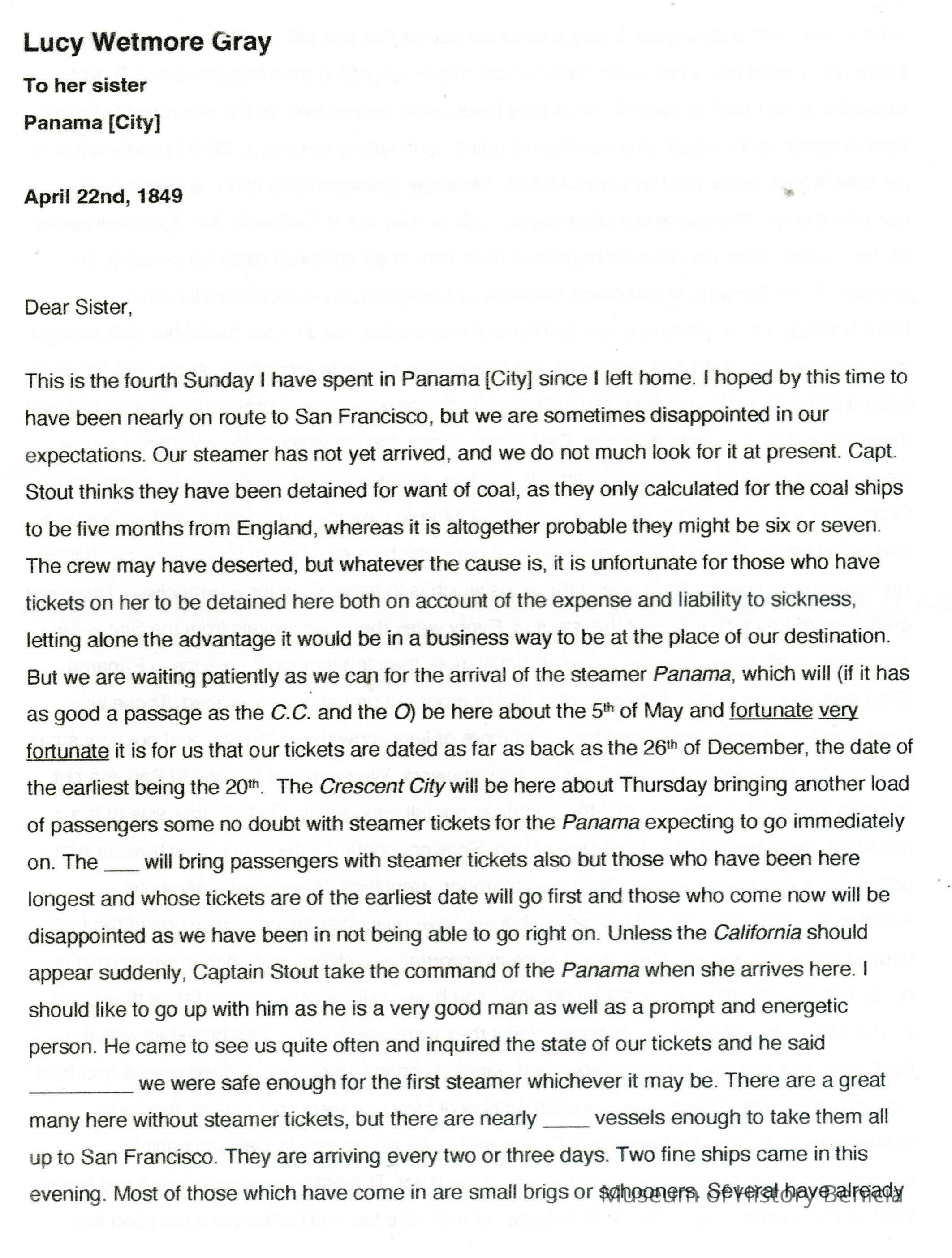 This is a letter from Lucy Wetmore Gray to her sister describing the trip across the Isthmus of Panama to California in 1849.Collection