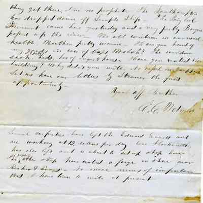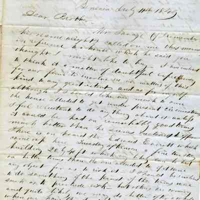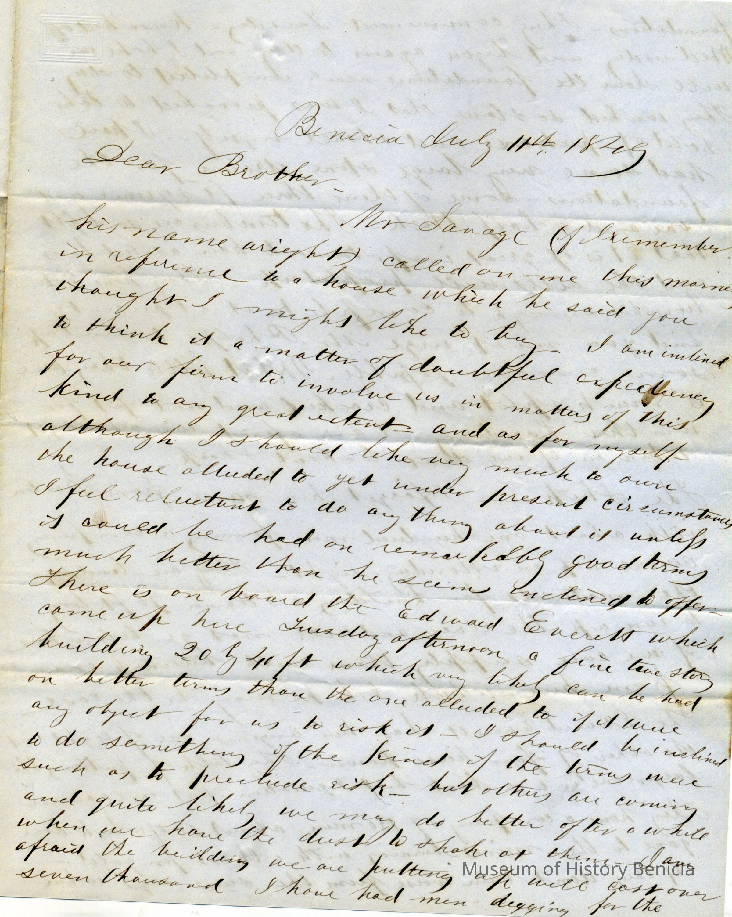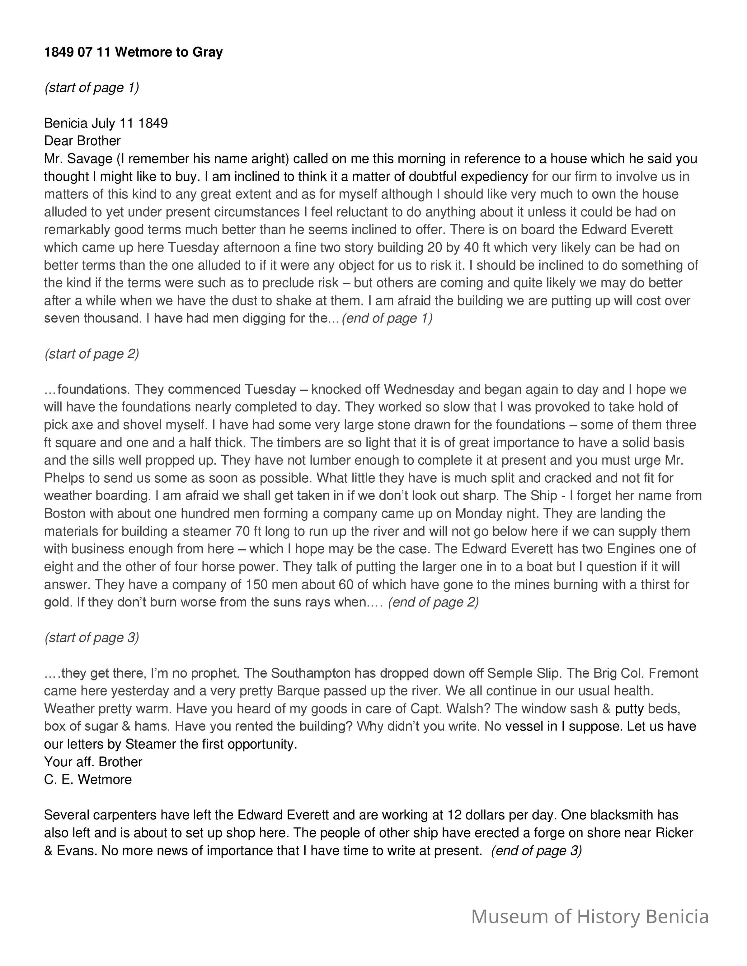 The letter, dated July 11, 1849, is from C.E. Wetmore to a brother-in-law, discussing the potential purchase of a house with Mr. Savage, expressing doubts about its expedience under current circumstances. Wetmore mentions the Edward Everett ship, with details about construction materials and labor, emphasizing challenges in acquiring adequate timber and stone for building. The letter touches on the prospect of business opportunities with ships like the Southampton and the Brig Col. Fremont.