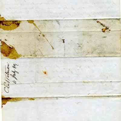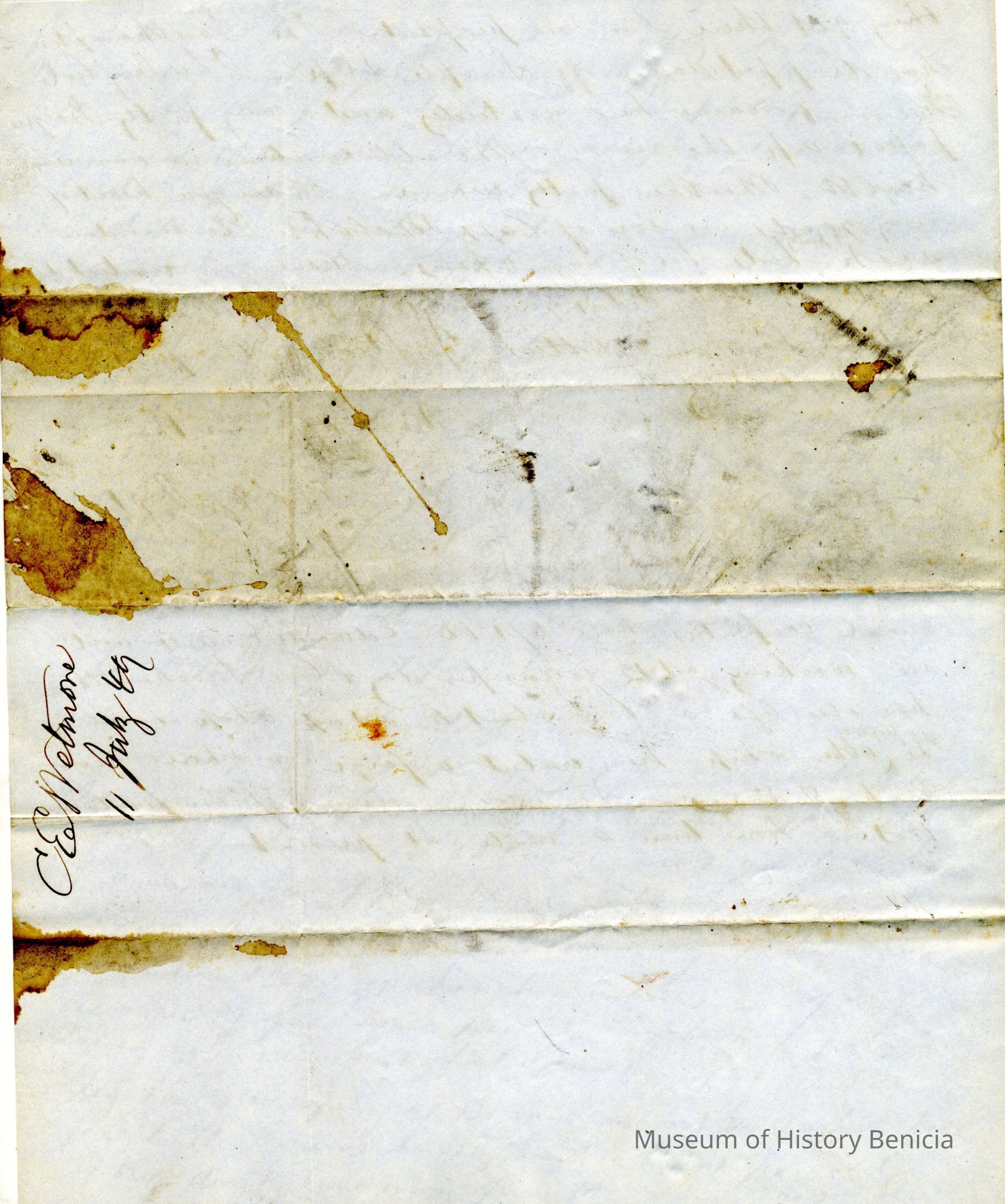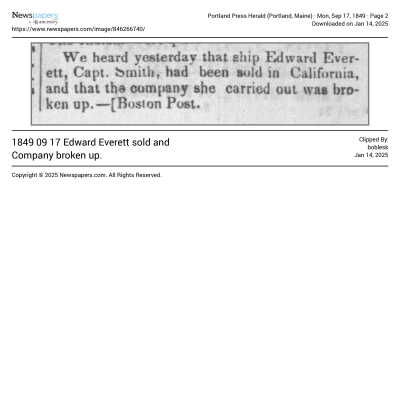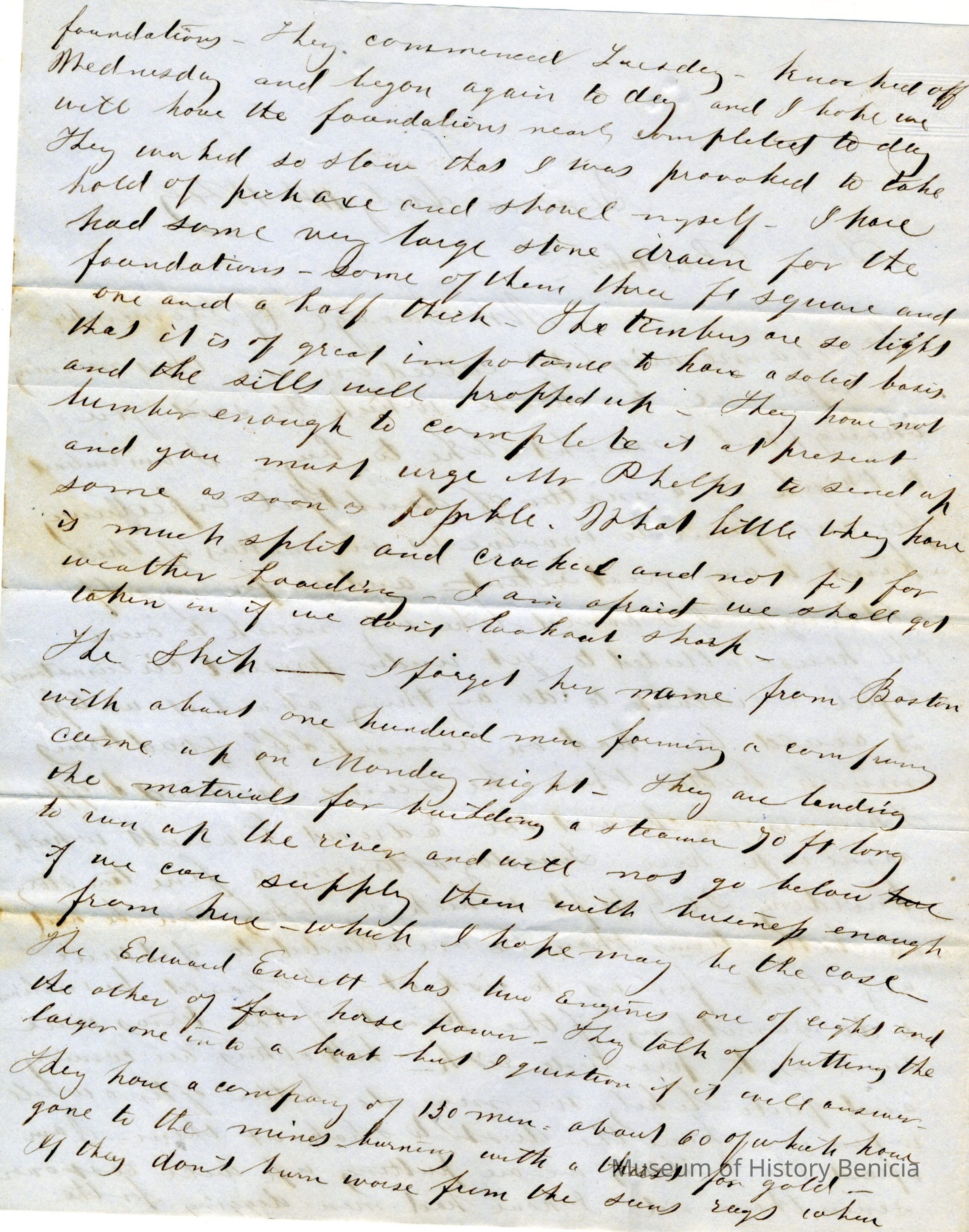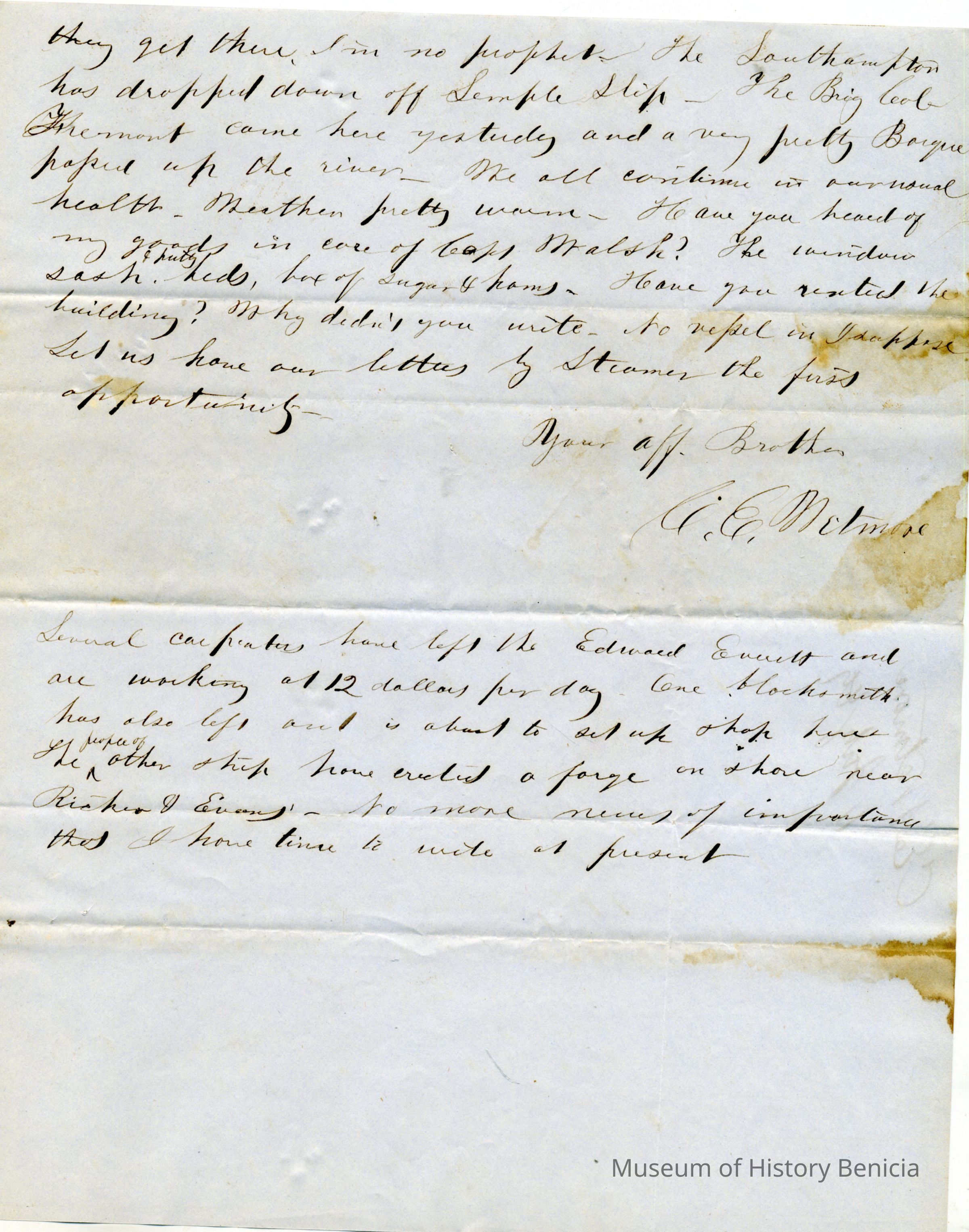 The letter, dated July 11, 1849, is from C.E. Wetmore to a brother-in-law, discussing the potential purchase of a house with Mr. Savage, expressing doubts about its expedience under current circumstances. Wetmore mentions the Edward Everett ship, with details about construction materials and labor, emphasizing challenges in acquiring adequate timber and stone for building. The letter touches on the prospect of business opportunities with ships like the Southampton and the Brig Col. Fremont.