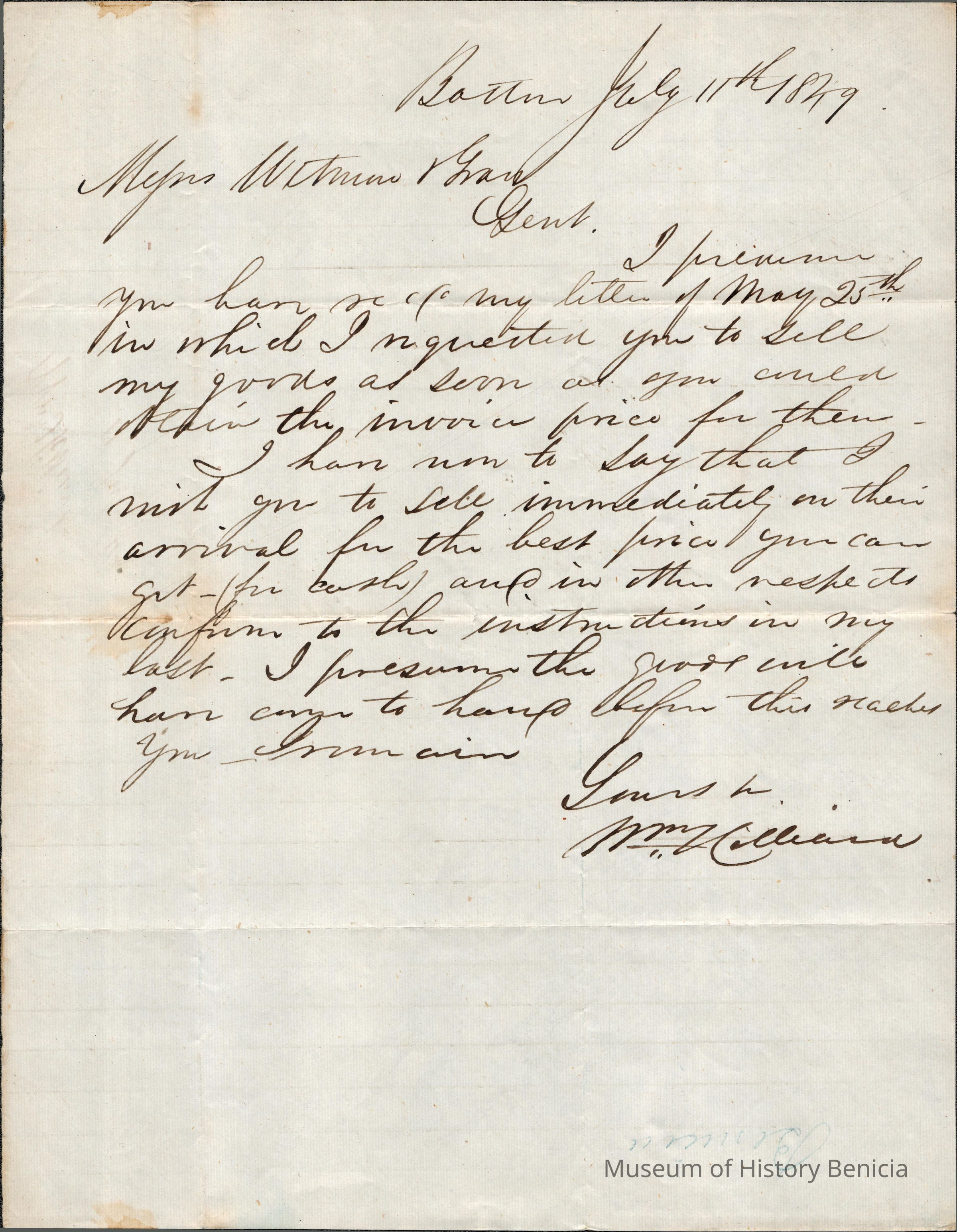 The image displays a letter dated July 11, 1849, from William Hilliard, addressed to Messrs. Wetmore & Gray, requesting the prompt sale of his goods. In the letter, Hilliard emphasizes the need to sell the goods immediately upon arrival at the best possible price, referencing prior instructions. The letter is written in elegant cursive on aged paper, showing historical context and formal business communication typical of the early 19th century. The signature of William Hilliard is prominently visible at the end of the letter.
