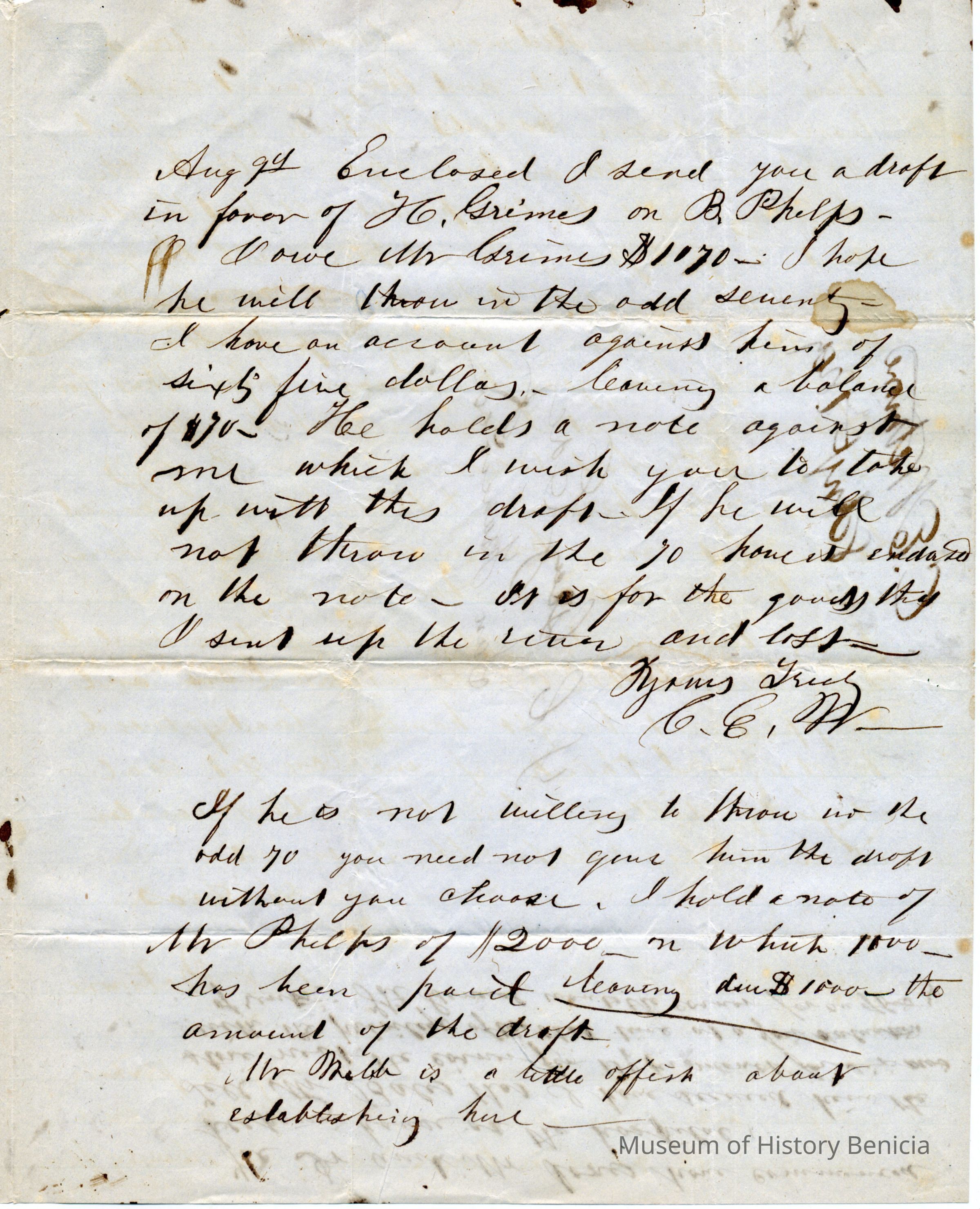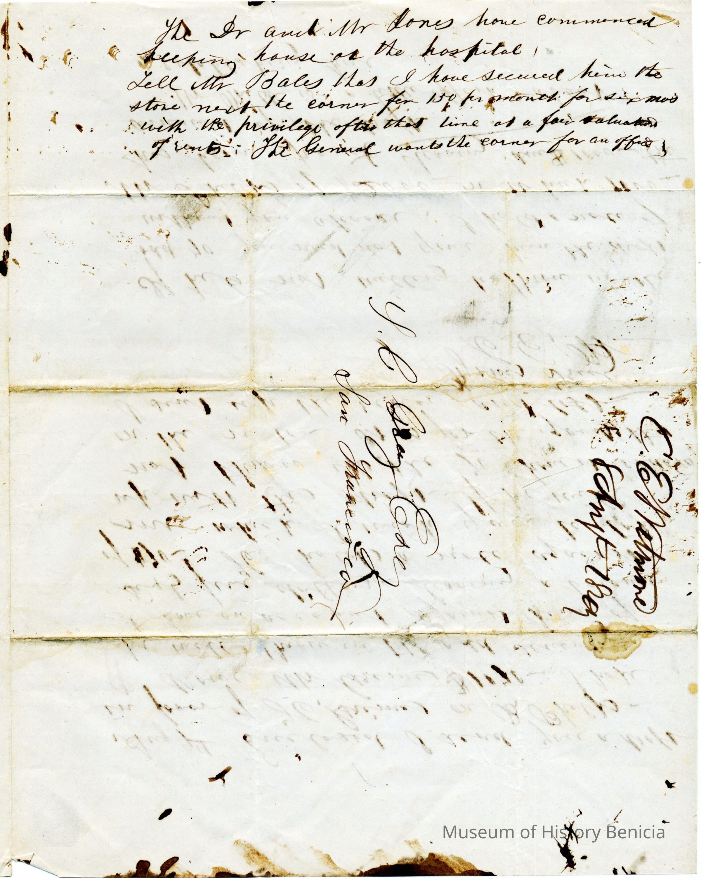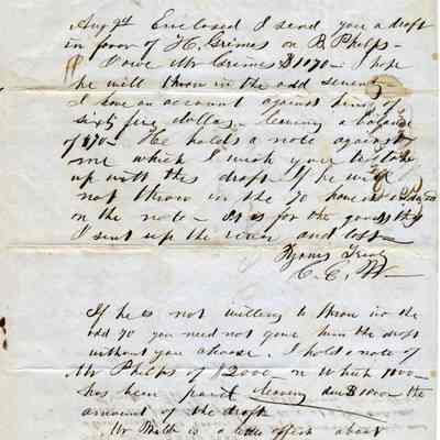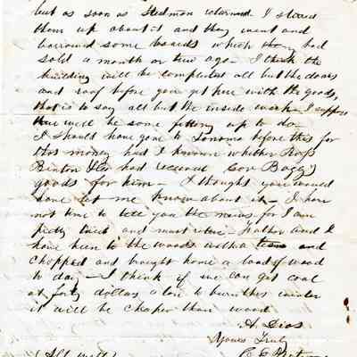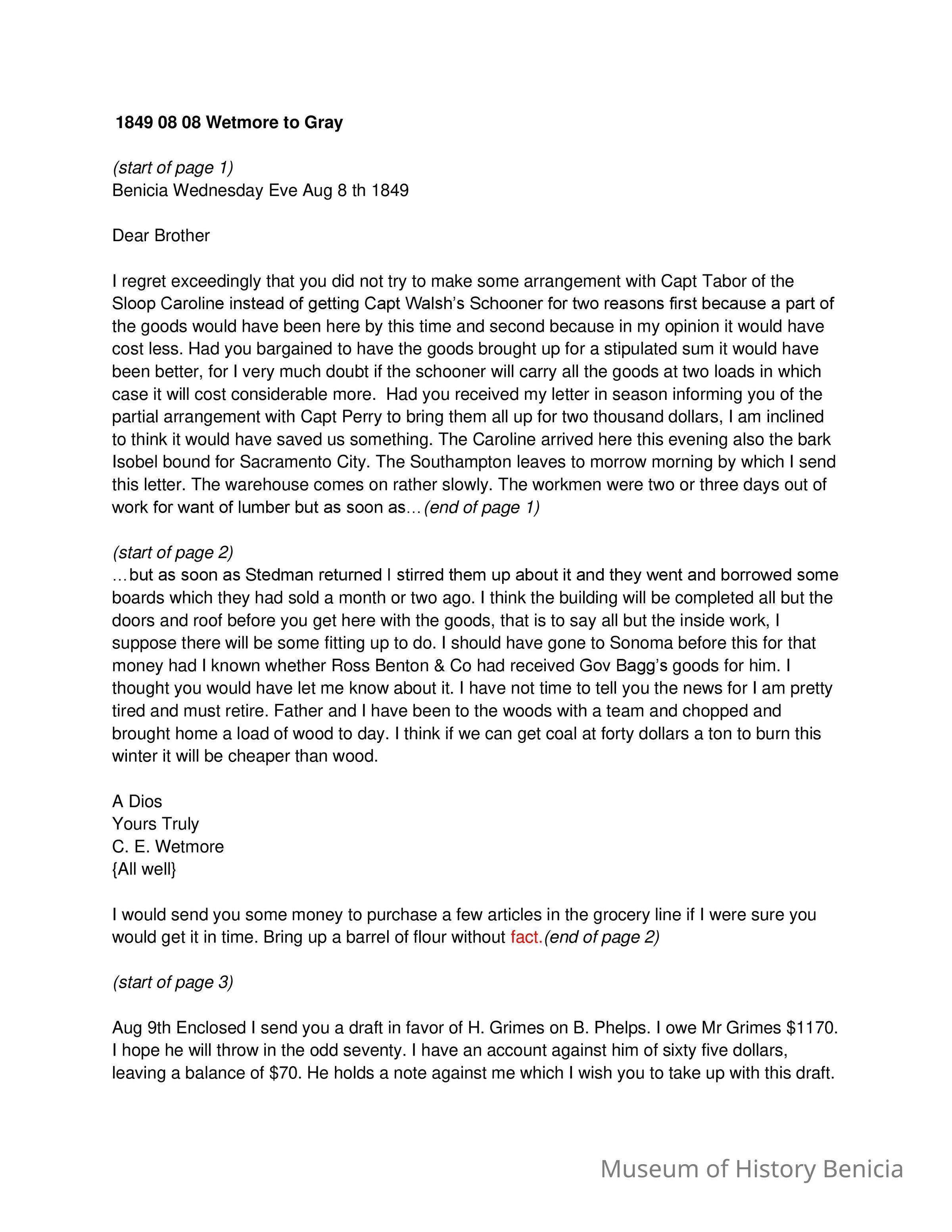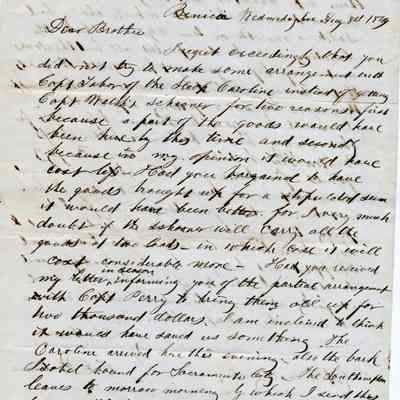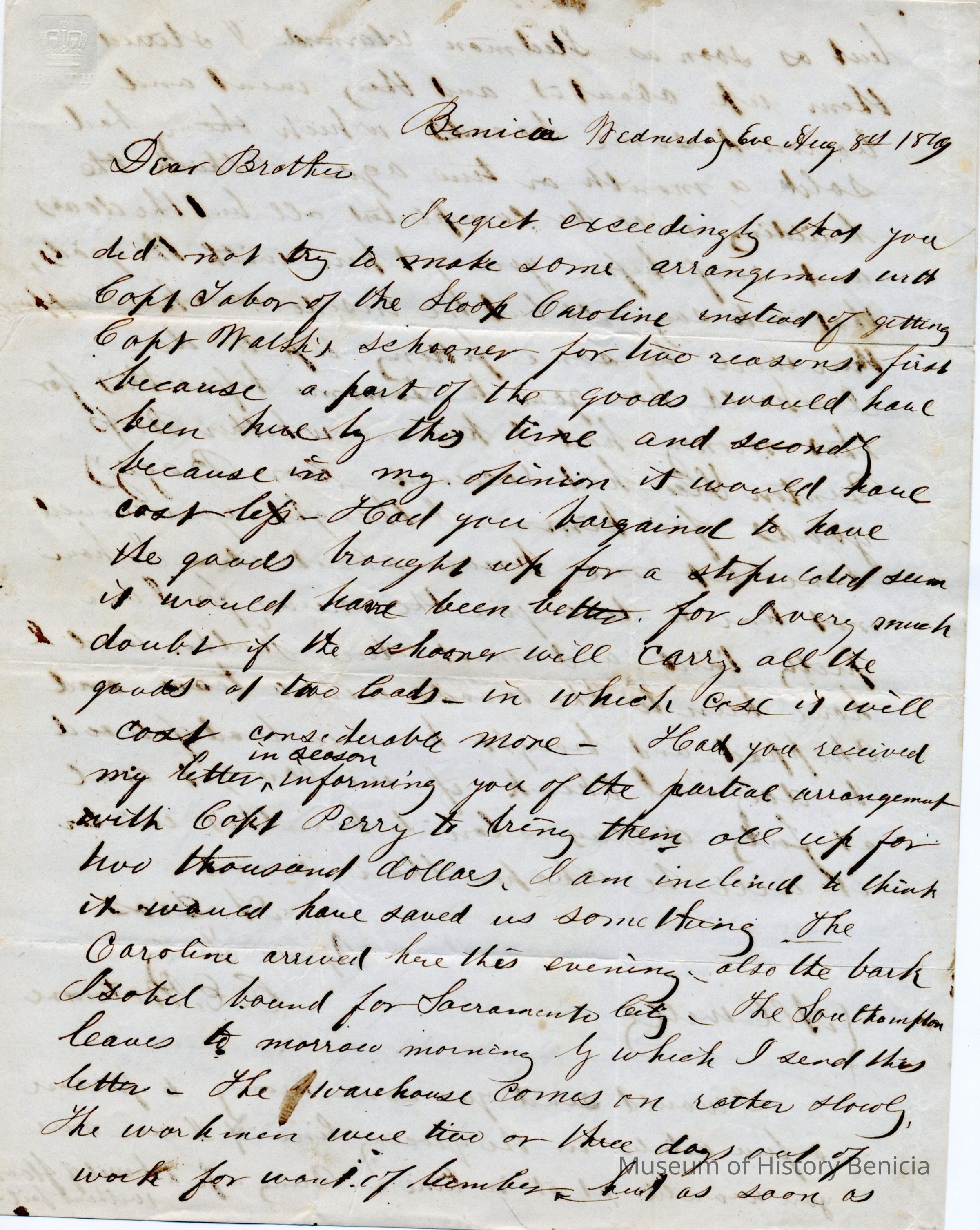 This is a letter from Chauncy Wetmore in Benicia to his brother-in-law regarding the shipping of merchandise. In a previous letter he had arranged to have some goods sent via the ship Caroline in an arrangement with Capt. Perry for $2,000. Samuel Gray had them shipped via another ship and Mr. Wetmore is not pleased. He also talks about a warehouse they are having constructed and delays encountered.Collection