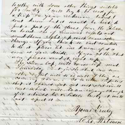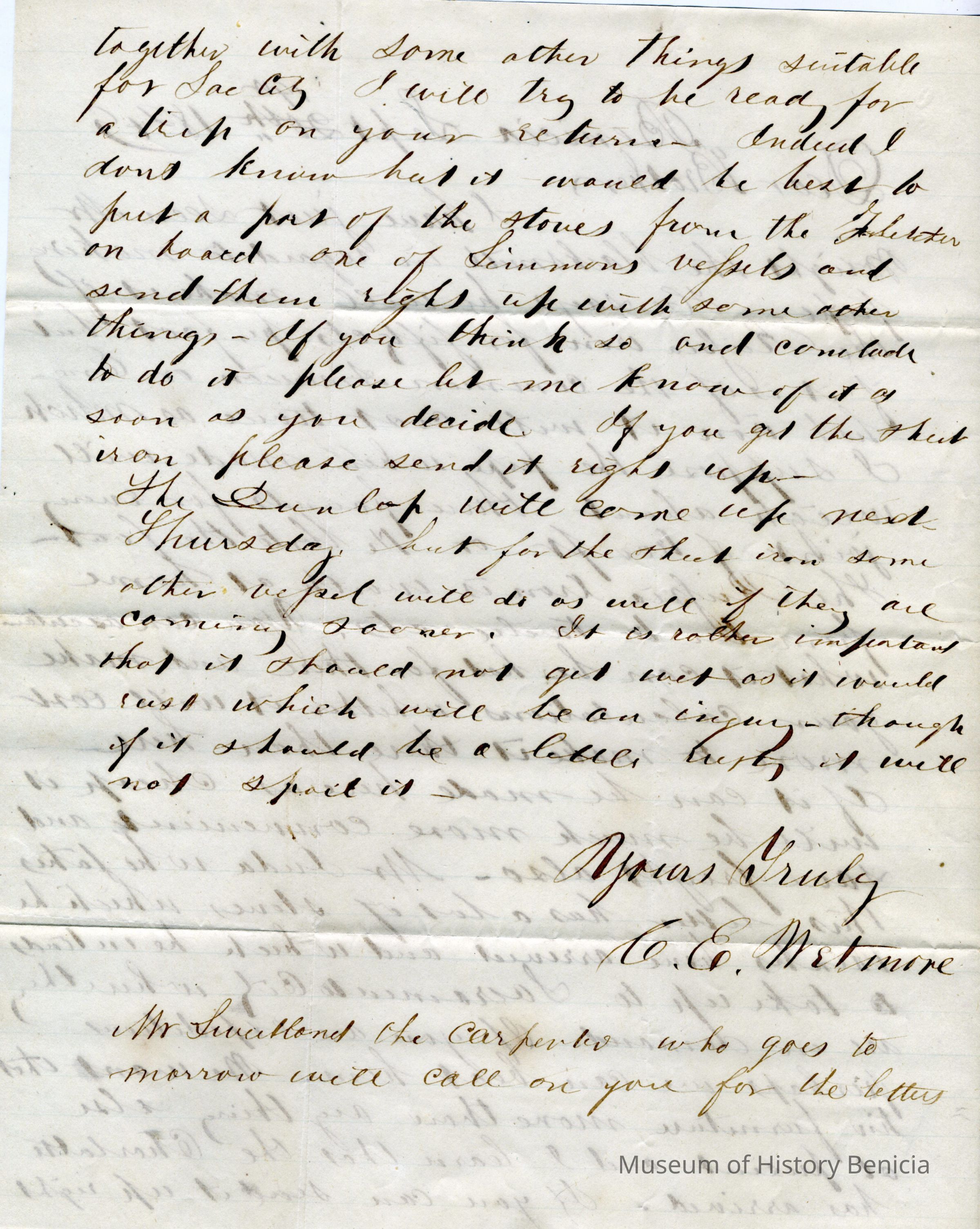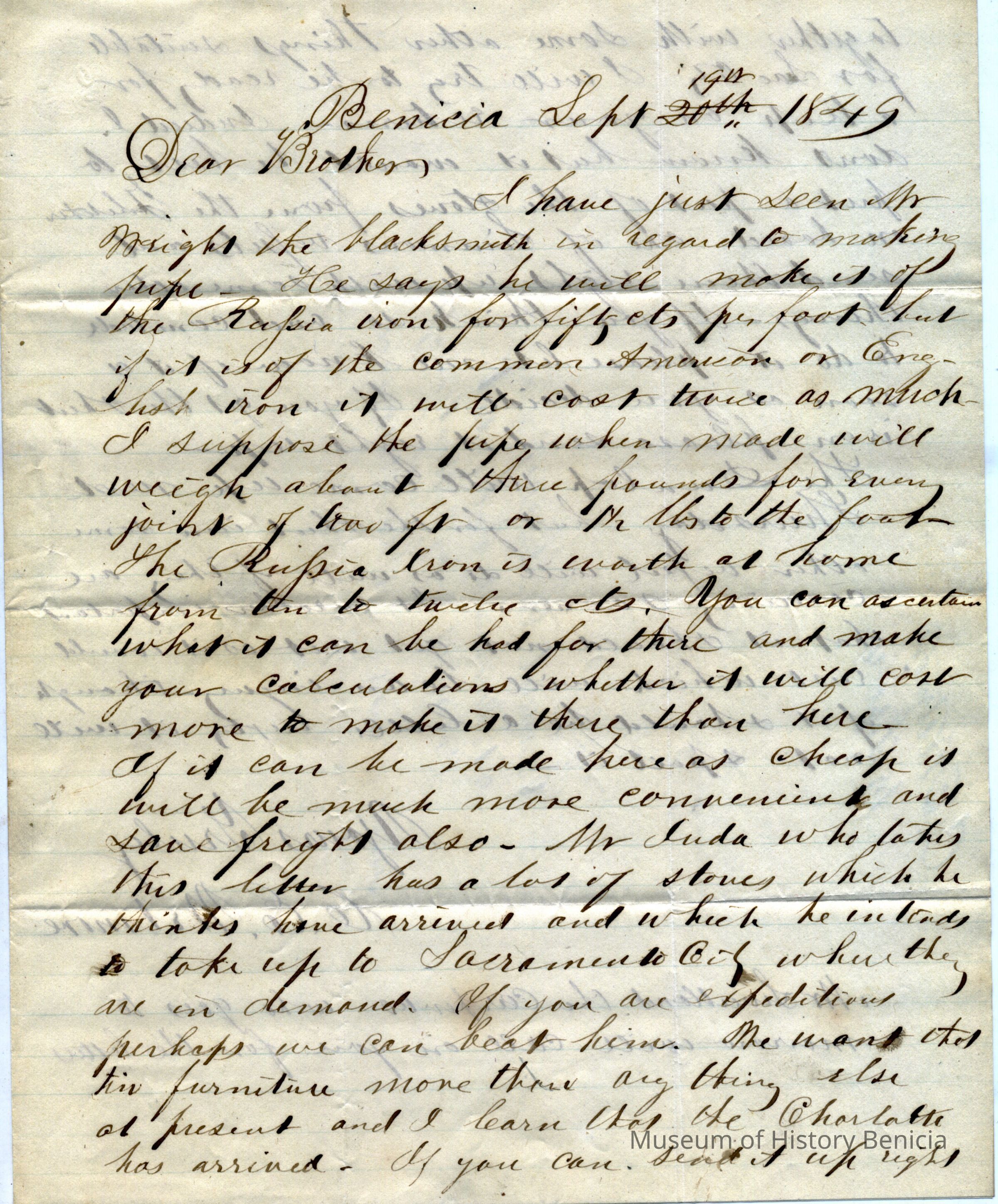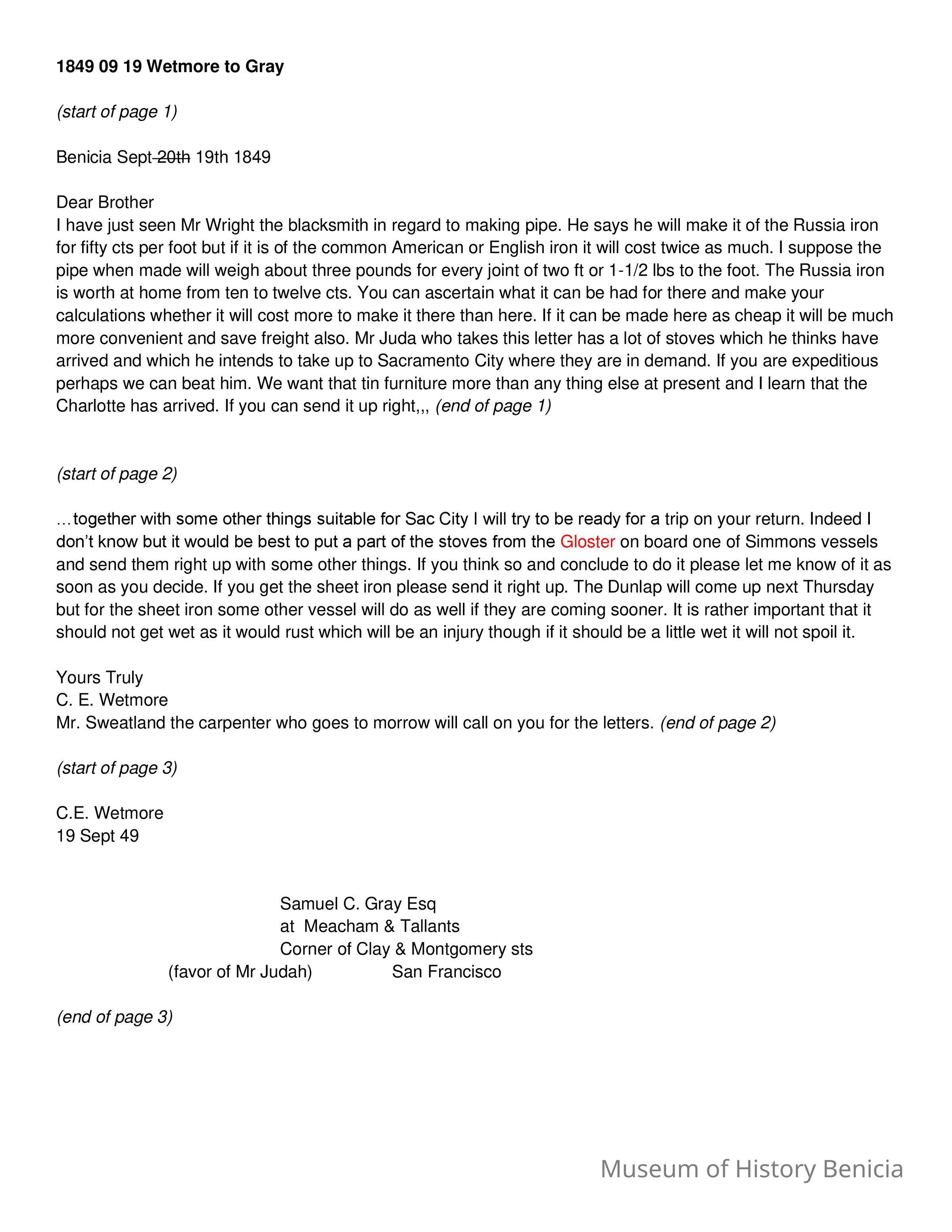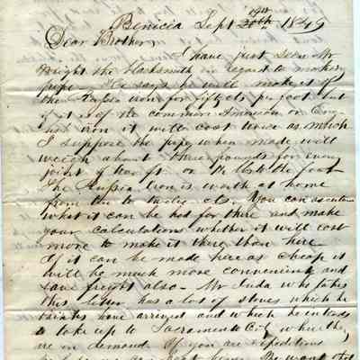 This is a letter from Chauncy Wetmore in Benicia to his brother-in-law regarding the sale of stoves they have in their inventory. He discusses the advantages of Russian, American and English sheet iron for making the stove pipes. He also talks about taking some stoves to Sacrament ahead of the competition.Collection