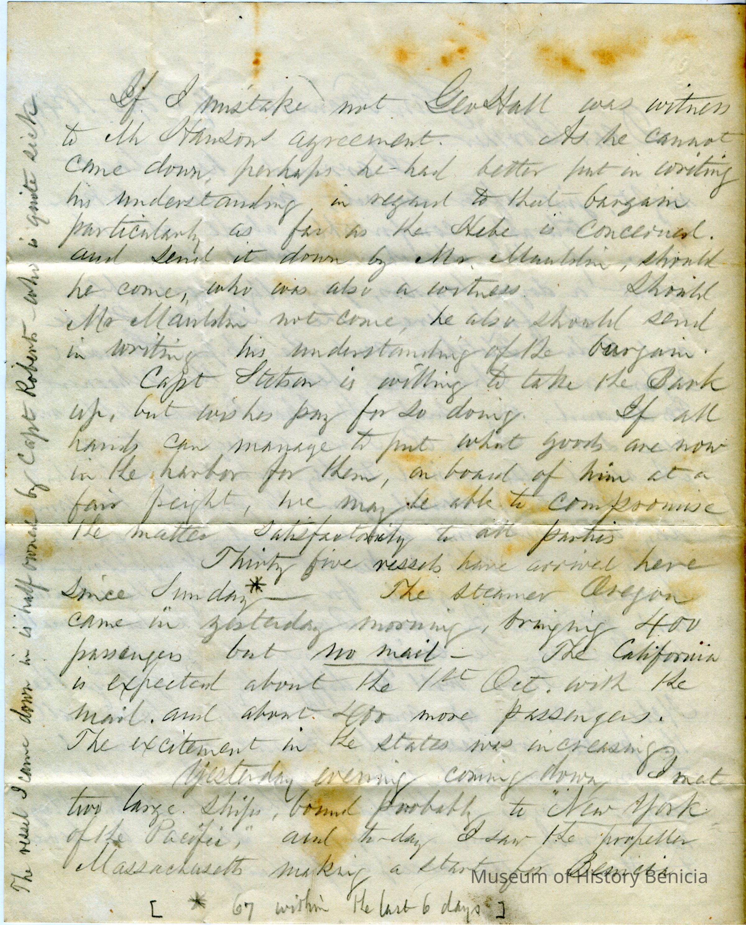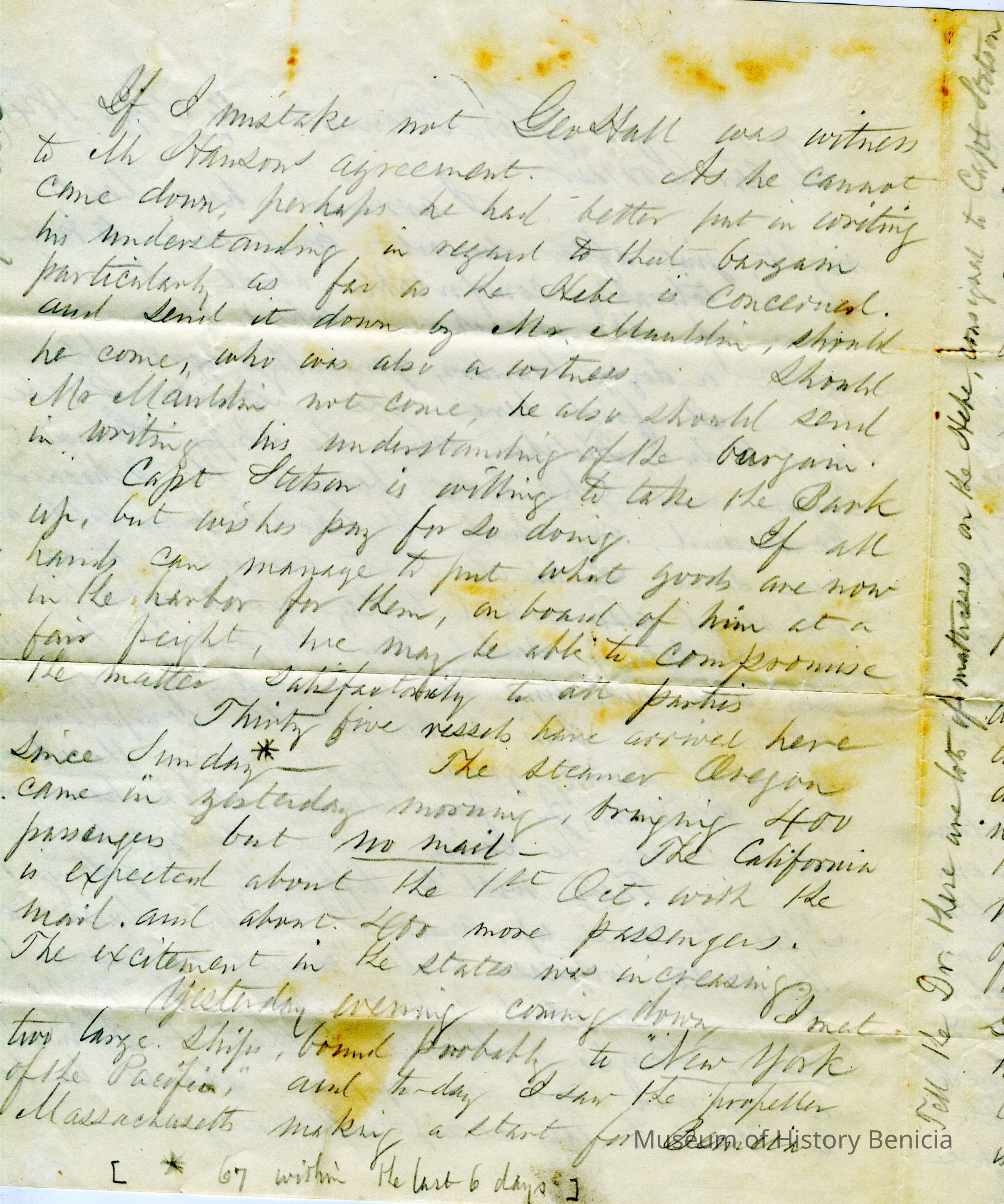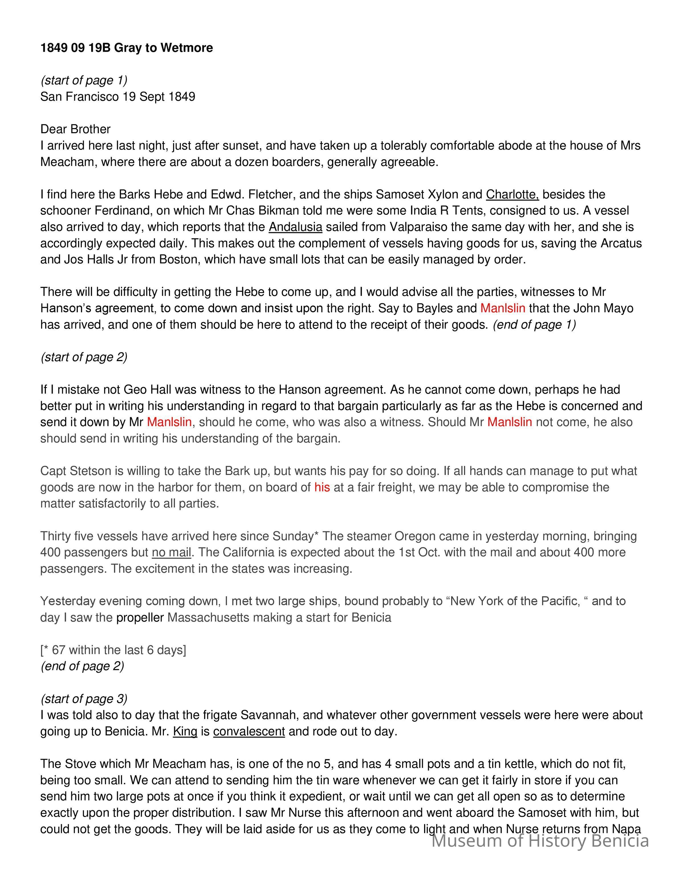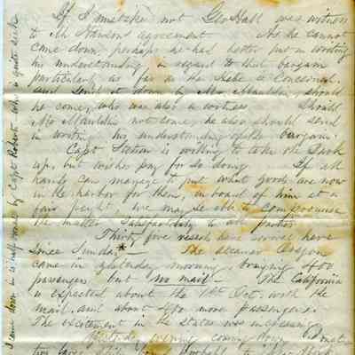 This is a letter from Samuel Gray in San Francisco to his brother-in-law Chauncey Wetmore in Benicia regarding the movement of their goods on various ships. They are having trouble getting them brought up to Benicia but Mr Gray says there was an agreement with Mr Hanson that they should enforce.Collection