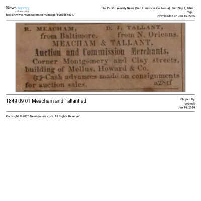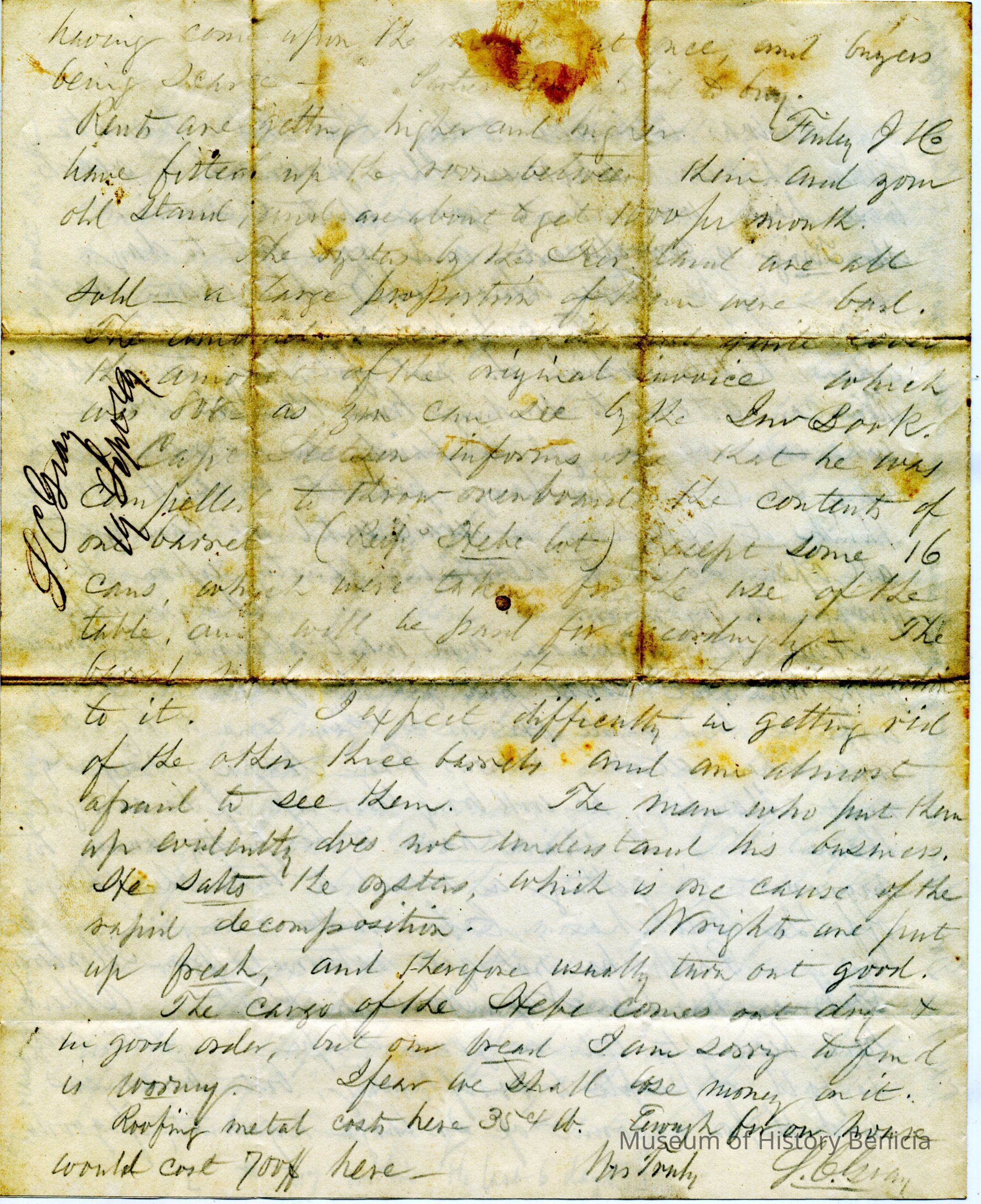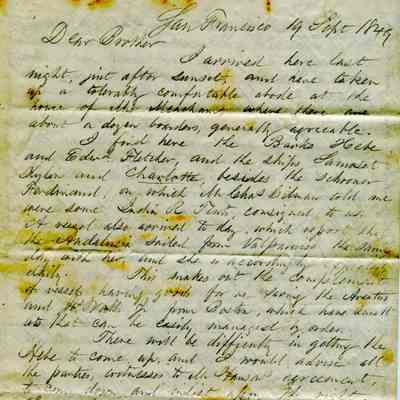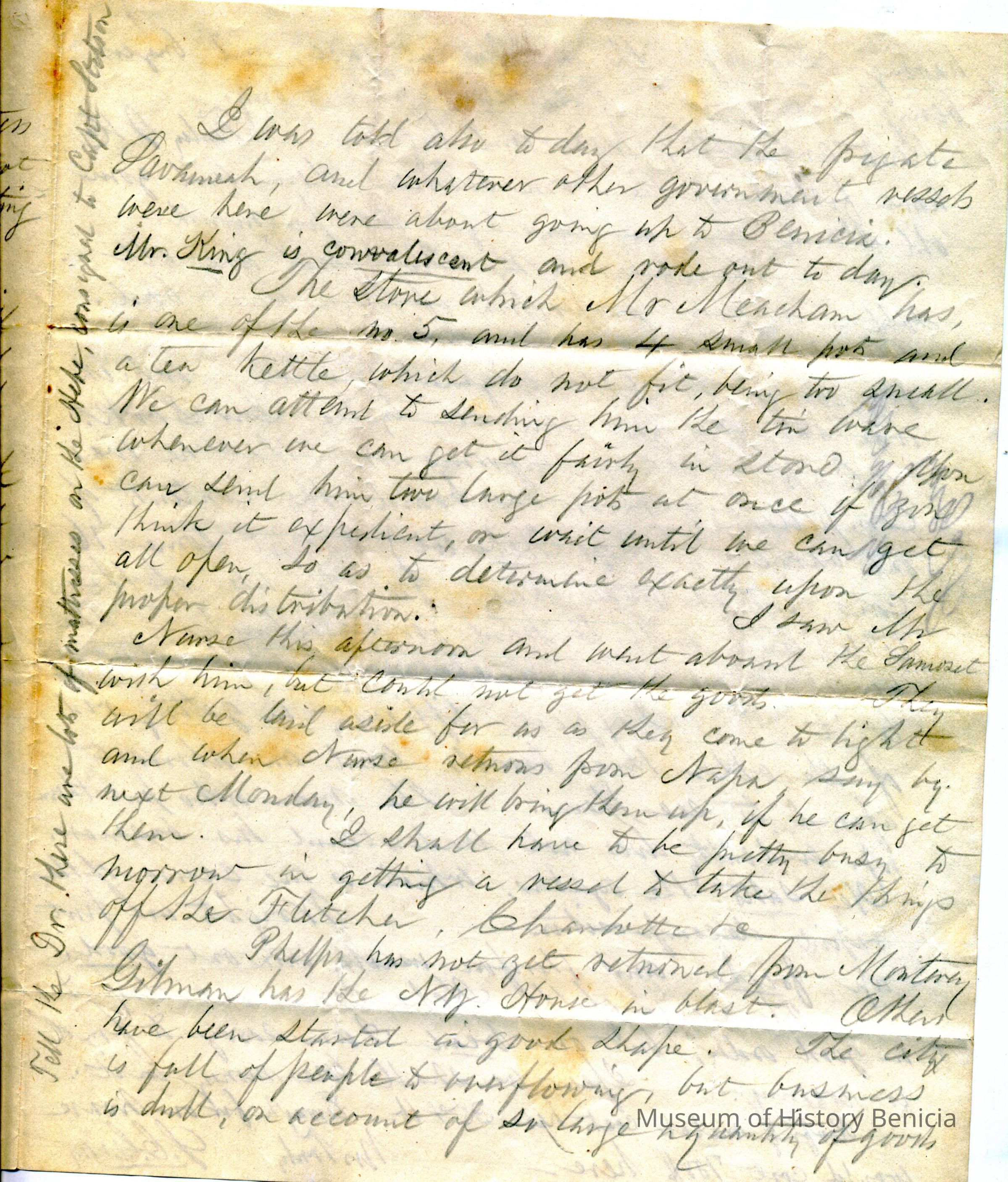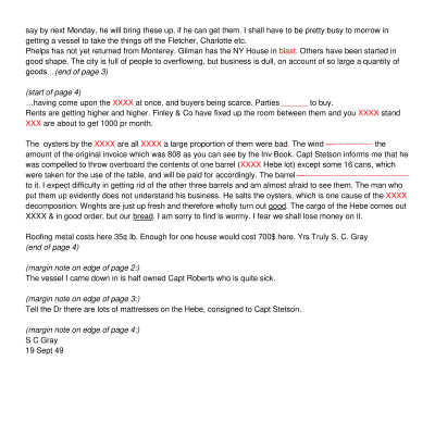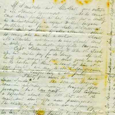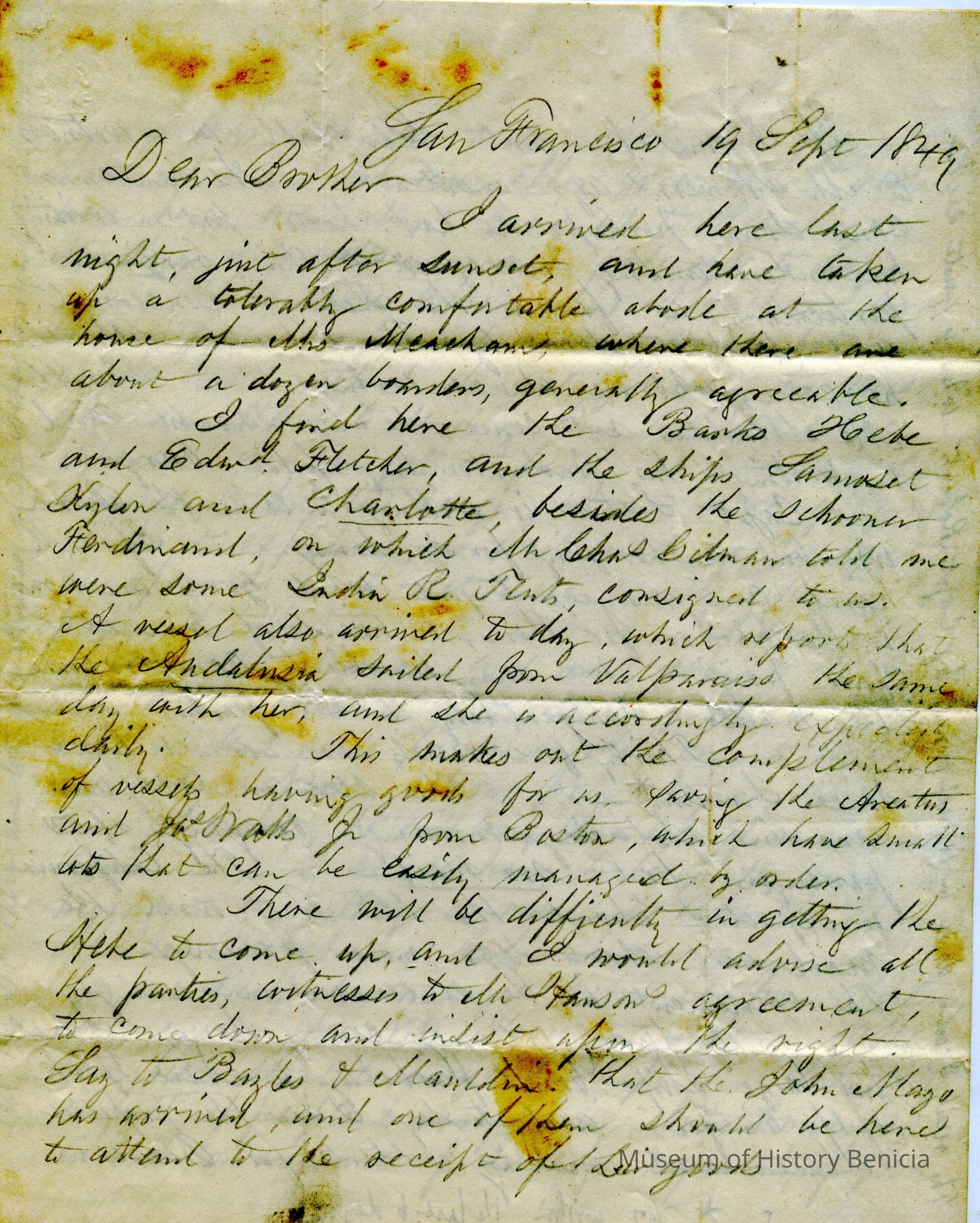 This is a letter from Samuel Gray in San Francisco to his brother-in-law Chauncey Wetmore in Benicia regarding the movement of their goods on various ships. They are having trouble getting them brought up to Benicia but Mr Gray says there was an agreement with Mr Hanson that they should enforce.Collection