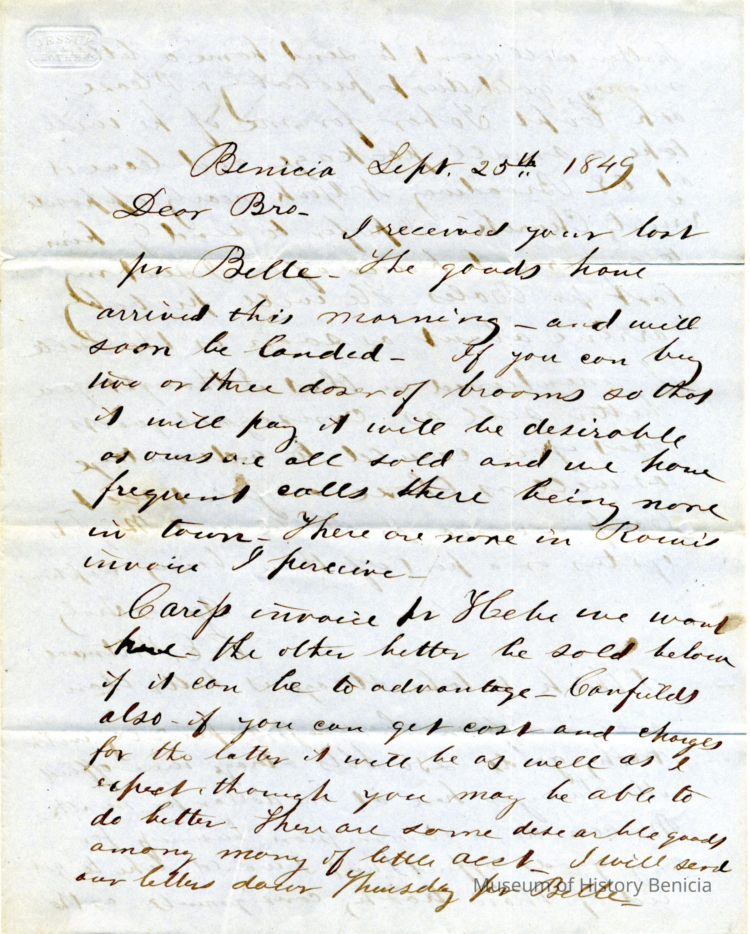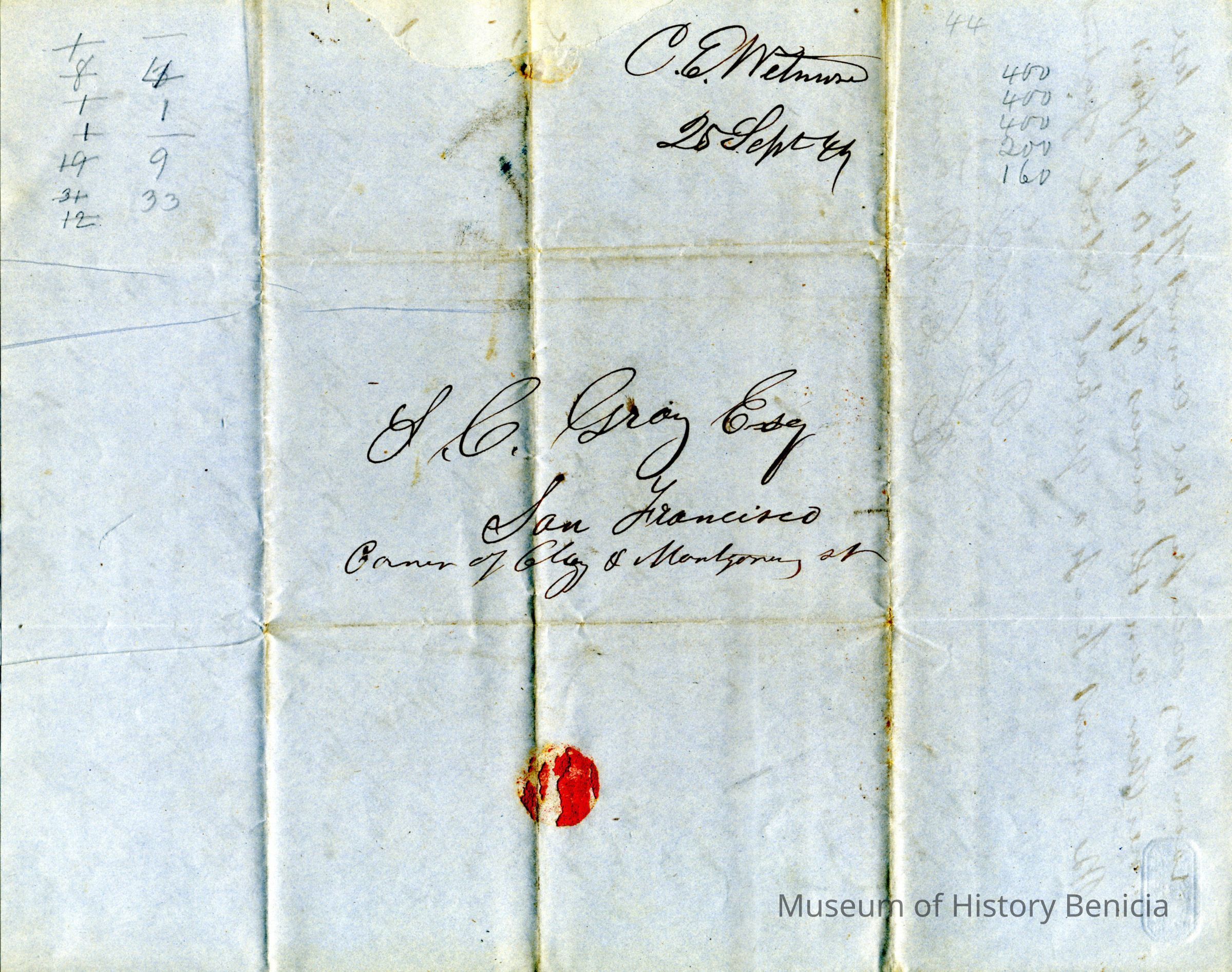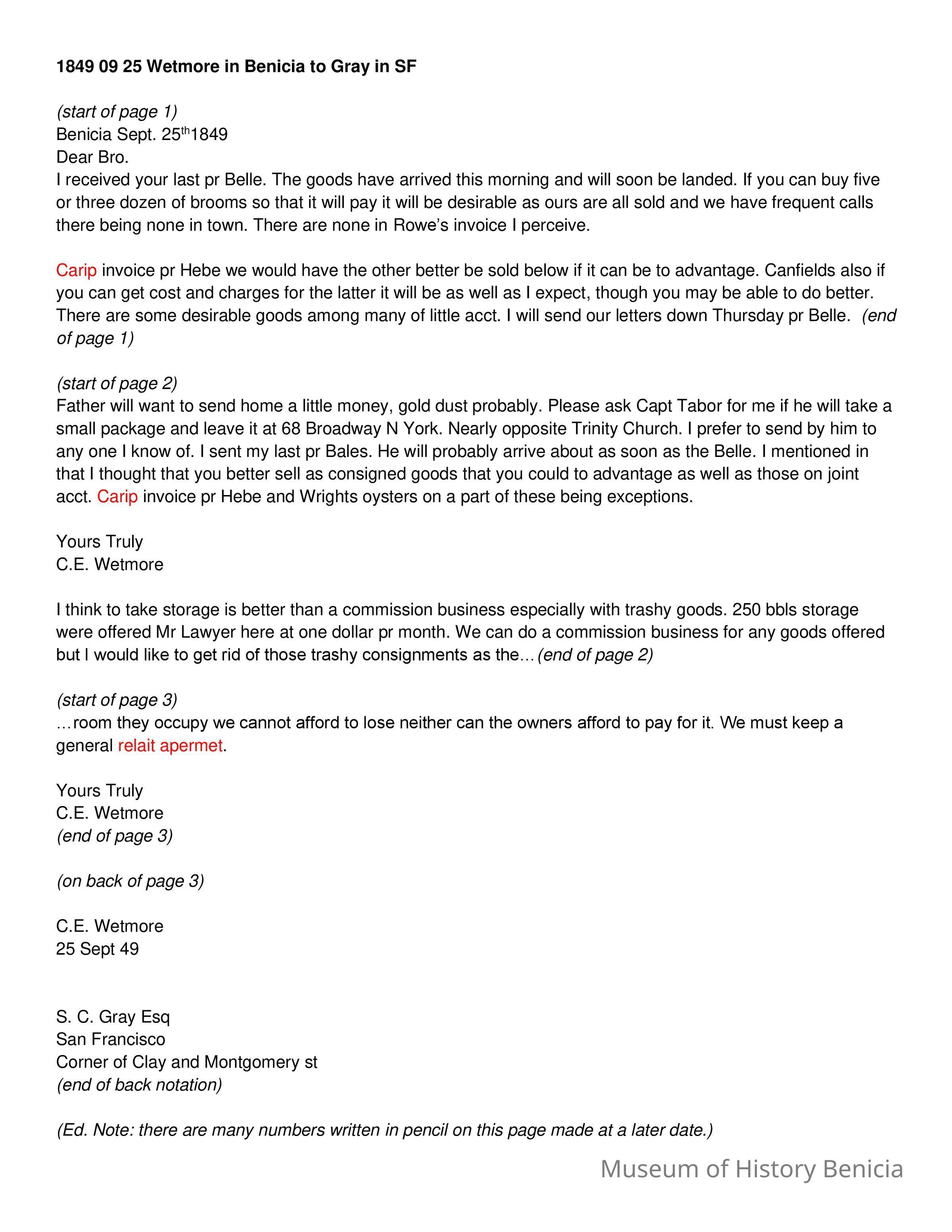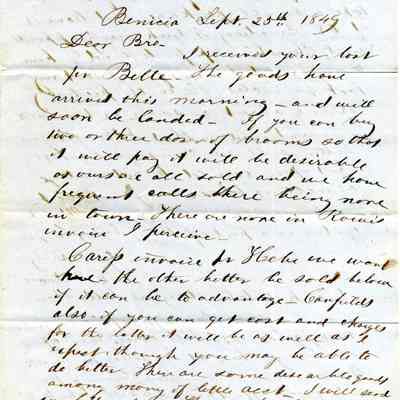 This is a letter to Samuel Gray in S.F., from Chauncey Wetmore in Benicia dated 09/25/1849. It talks about various business matters related to their partnership. It also asks about sending some gold dust home for Chauncey Wetmore's father (Chauncey Wetmore Sr.).