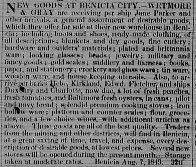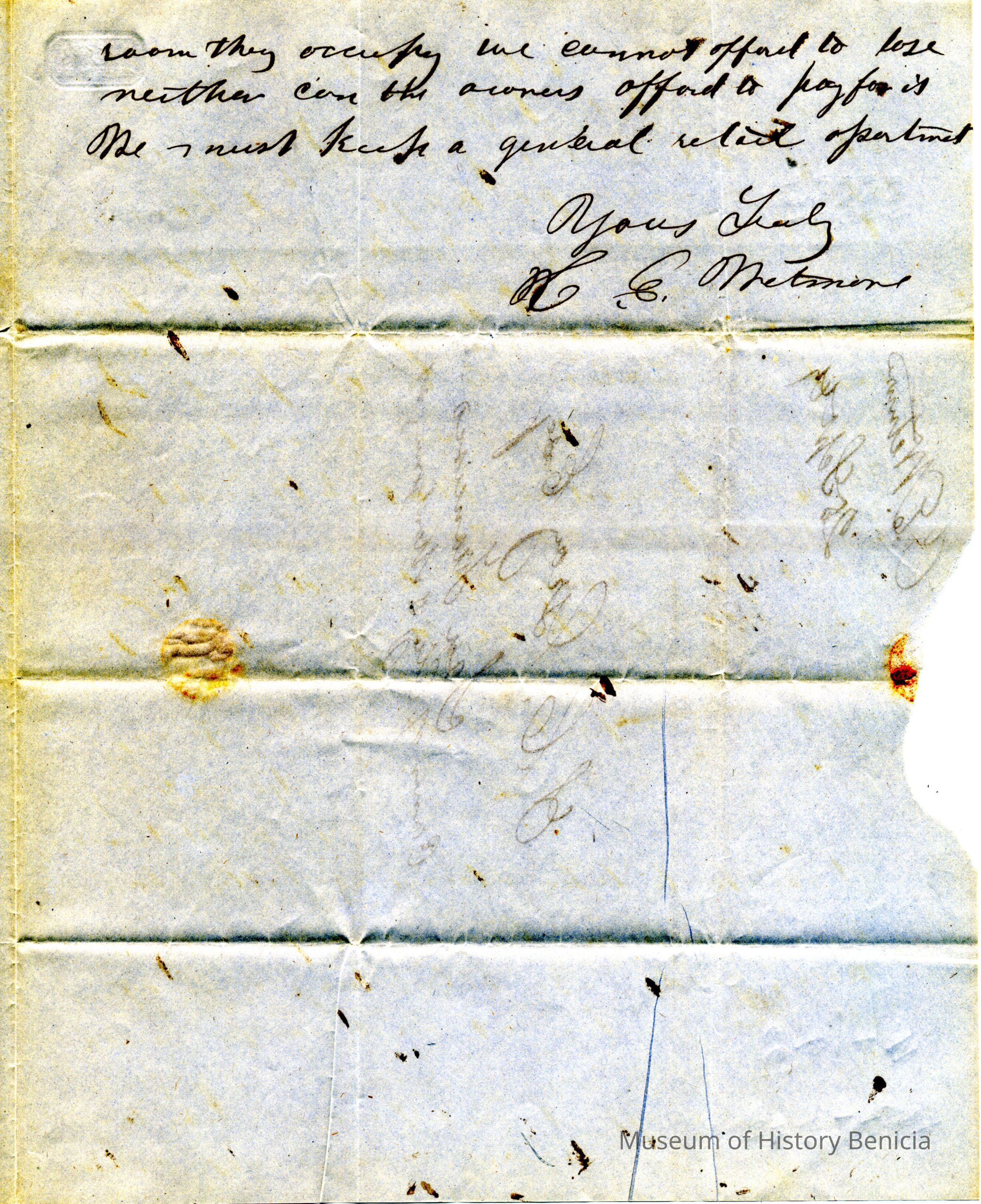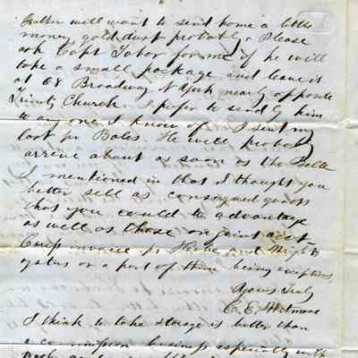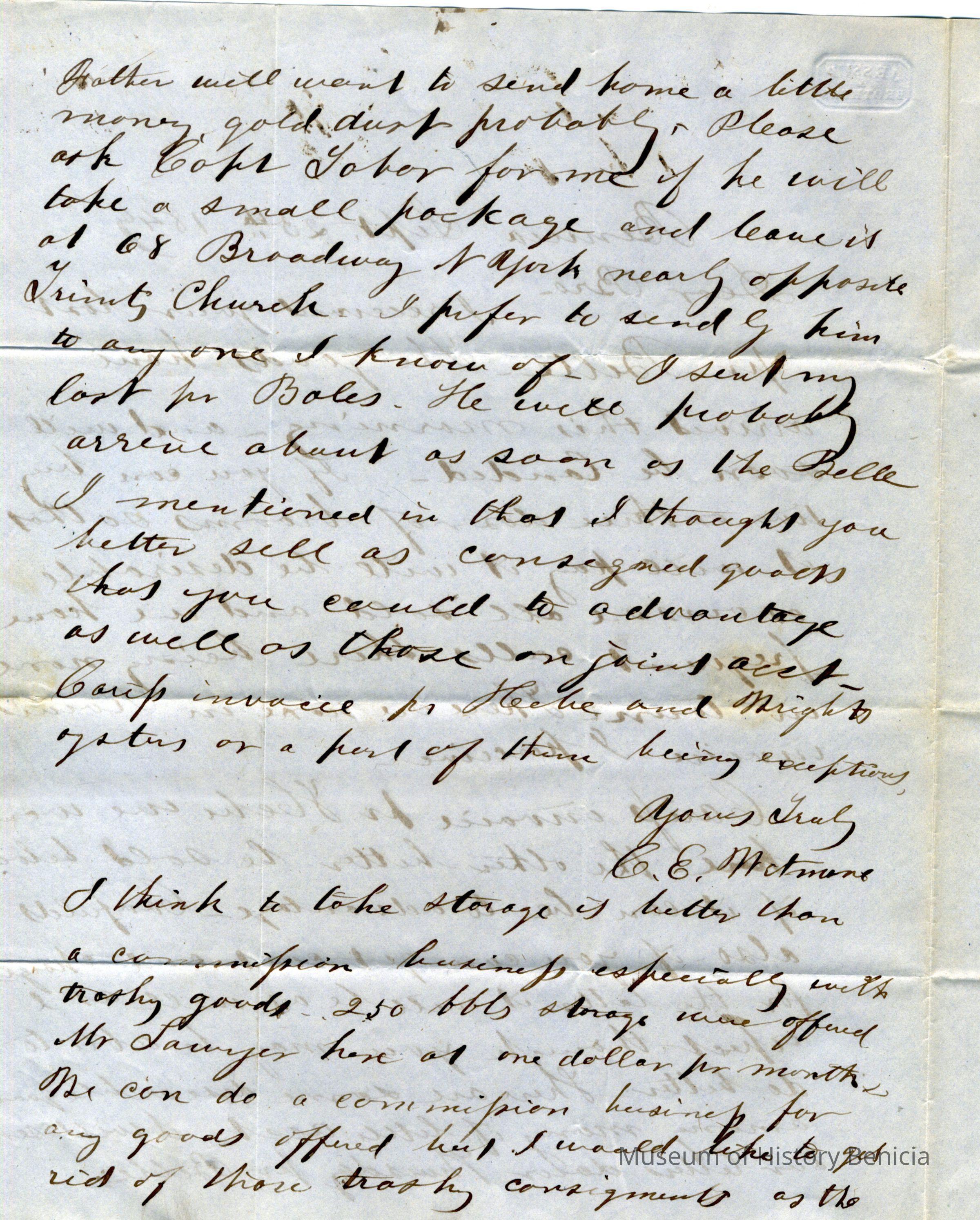 This is a letter to Samuel Gray in S.F., from Chauncey Wetmore in Benicia dated 09/25/1849. It talks about various business matters related to their partnership. It also asks about sending some gold dust home for Chauncey Wetmore's father (Chauncey Wetmore Sr.).