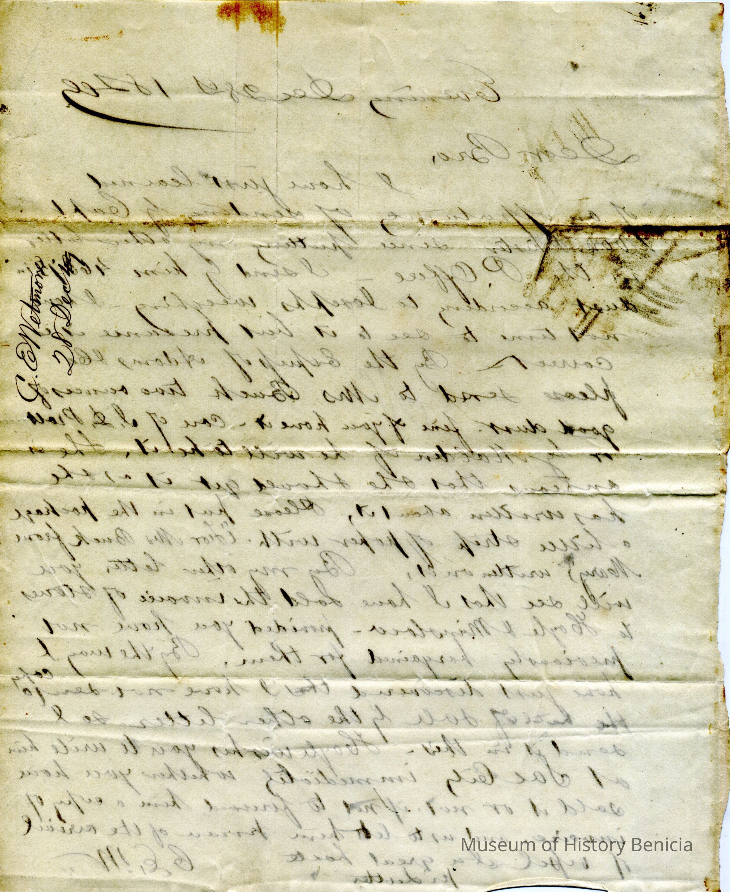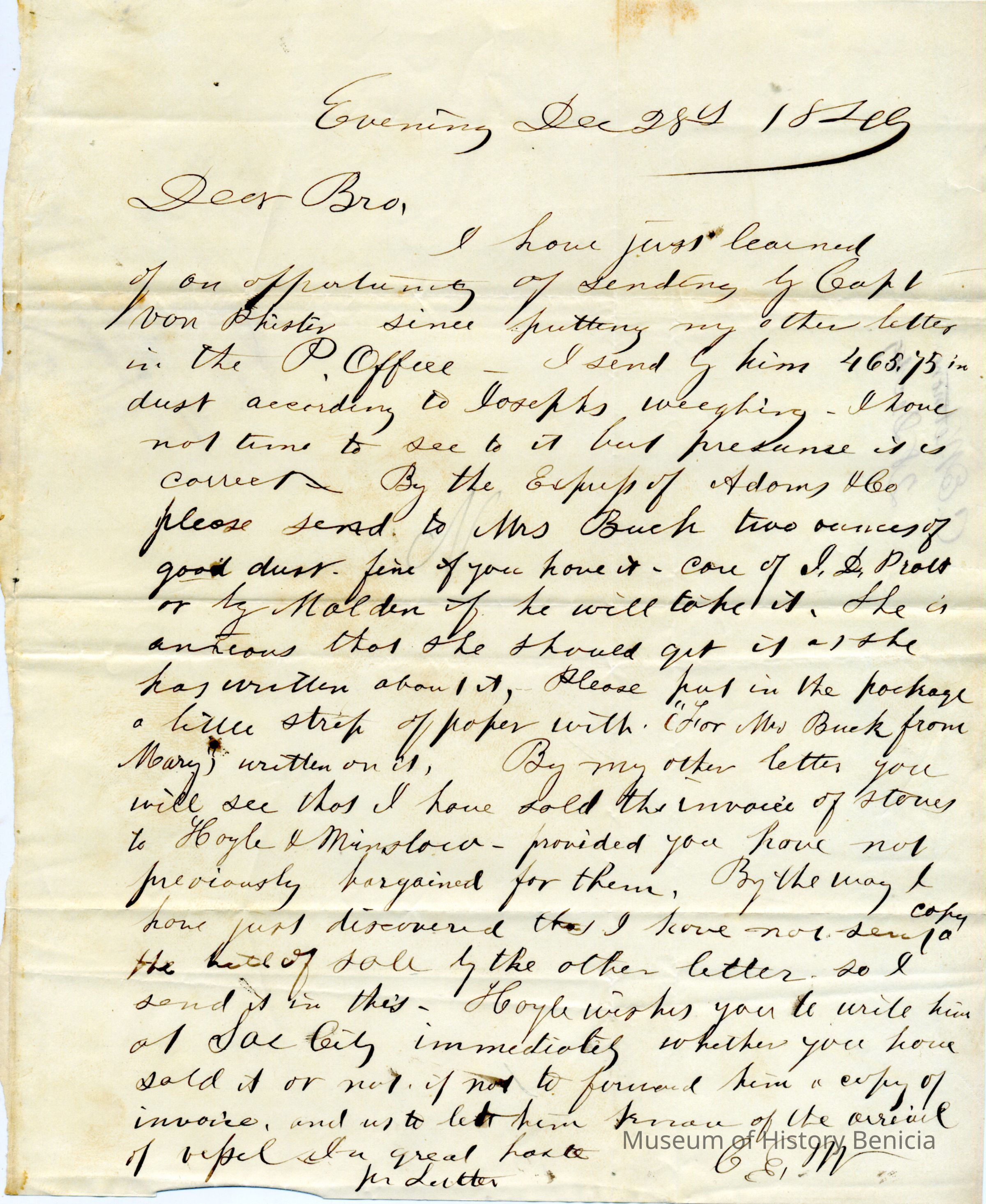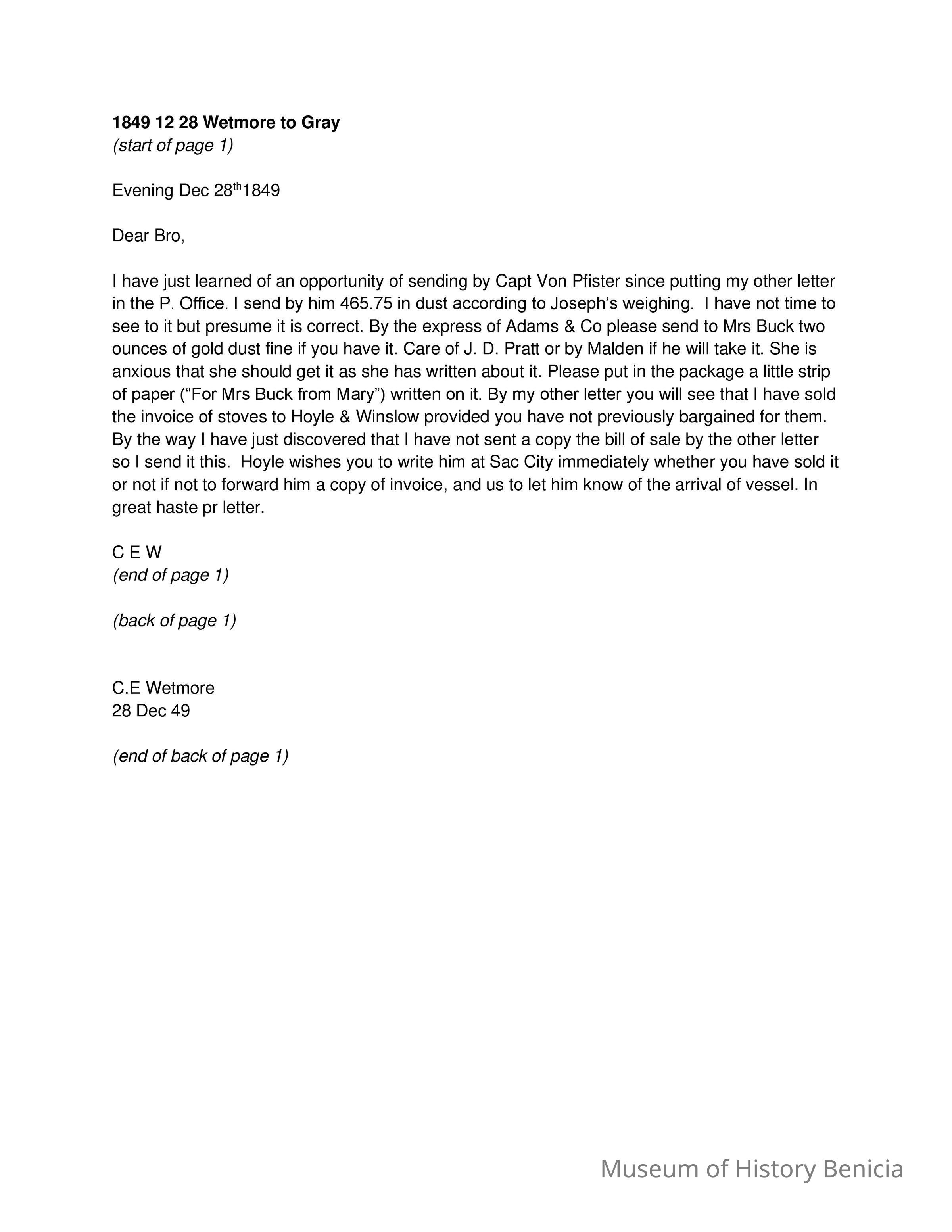 This is a letter to Samuel Gray in S.F., from Chauncey Wetmore in Benicia dated 12/28/1849. It talks about various business matters related to their partnership. It also says he will send 465.75 of gold dust by Capt. Von Pfister and asks Mr Gray to give Mrs. Buck 2 ounces of gold dust with a note that says it is from Mary (Wetmore).