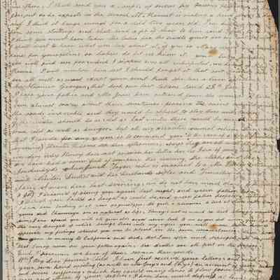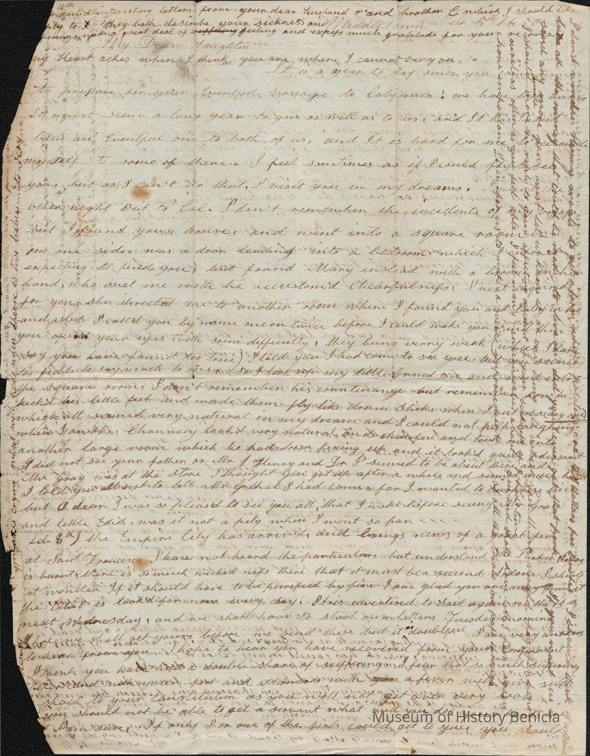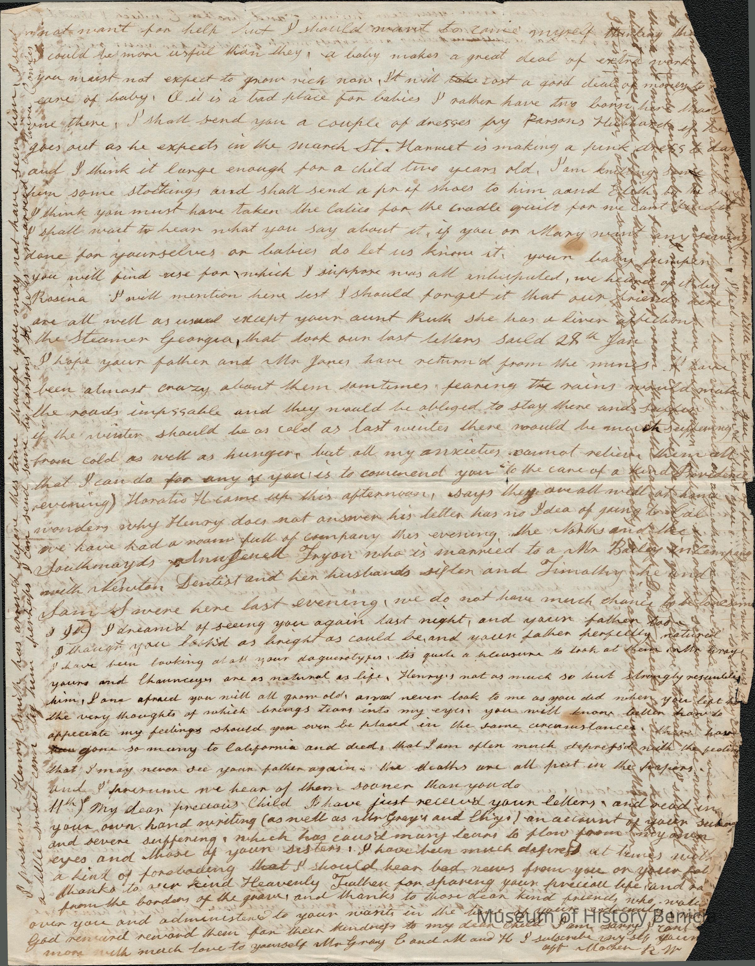 The image depicts a handwritten letter from Rebecca Hubbard Wetmore to her daughter, Lucy Gray. The document displays a timeworn appearance, typical of aged paper, with an overall yellowish tint and signs of creases and wear. The writing is dense, spanning both horizontally across the page's main body and perpendicularly in the margins, suggesting limited space. The script is in cursive, with variations indicative of the writer's personal style. Some areas contain noticeable ink blots or minor stains, contributing to the historical artifact's authenticity. The text covers family matters and emotional expressions, conveying a personal narrative.