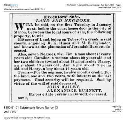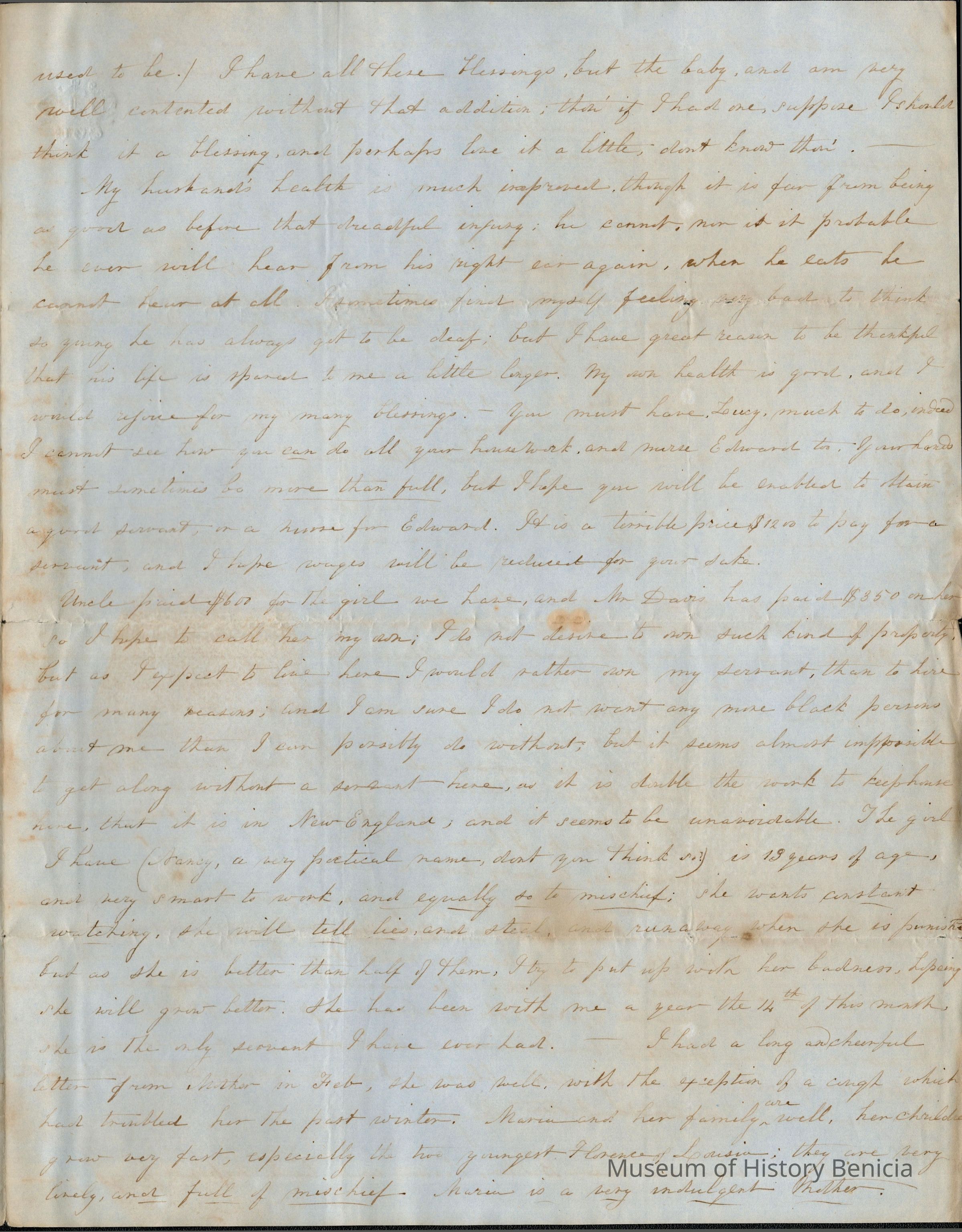 "I do not desire to own such property, but as I expect to live here I would rather own my servant, than to hire for many reasons; and I am sure I do not want any more black persons about me than I can possibly do without; but it seems almost impossible to get along without a servant here, as it is double the work to keep house here, than it is in New England, and it seems to be unavoidable. The girl I have (Nancy, a very practical name, don't you think so?) is 13 years of age, and very smart to work, and equally so to mischief; she wants constant watching, she will tell lies, and steal and runaway when she is punished but as she is better than half of them, I try to put up with her badness, hoping she will grow better. She has been with me a year the 14th of this month. She is the only servant I have ever had."