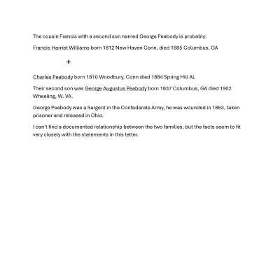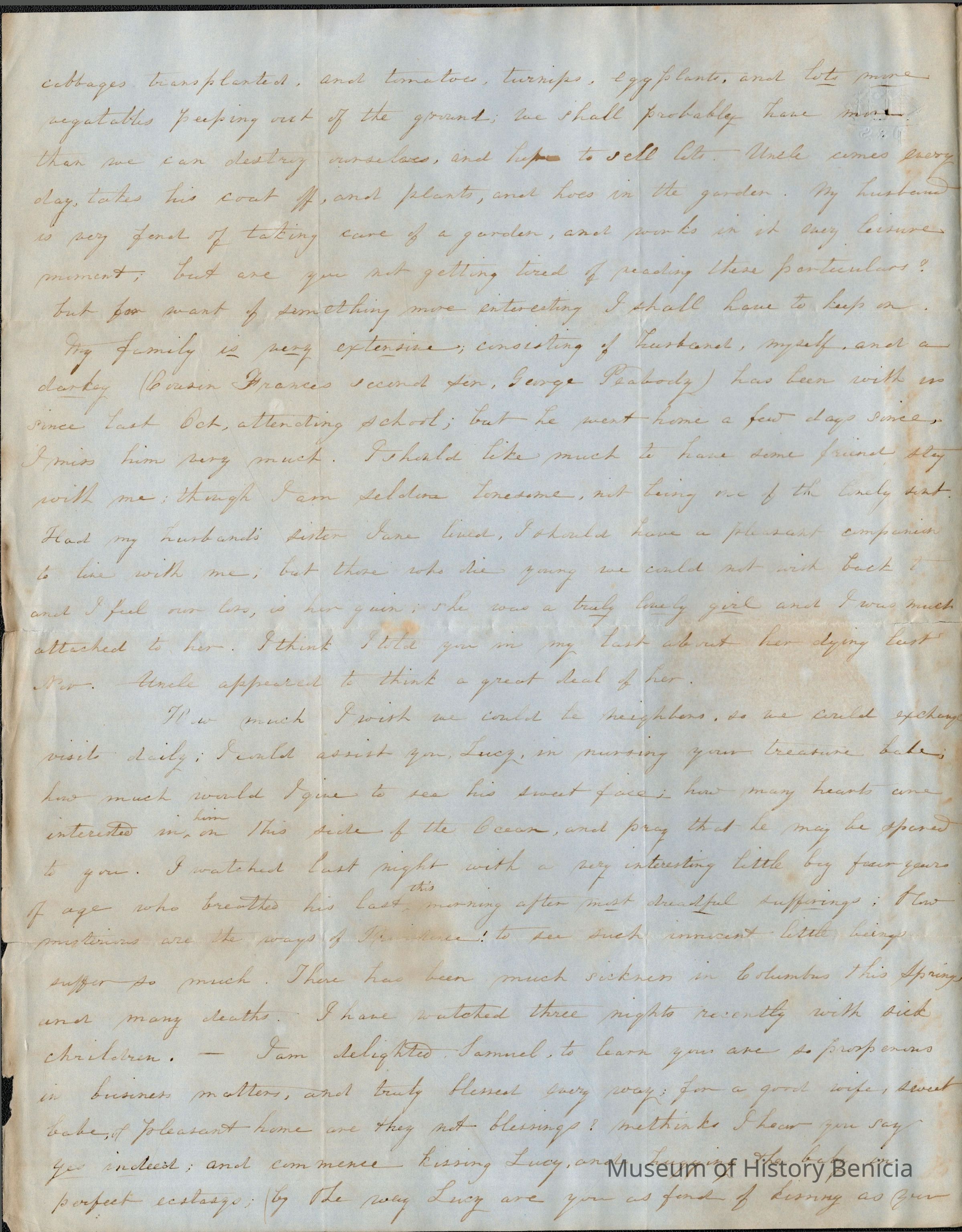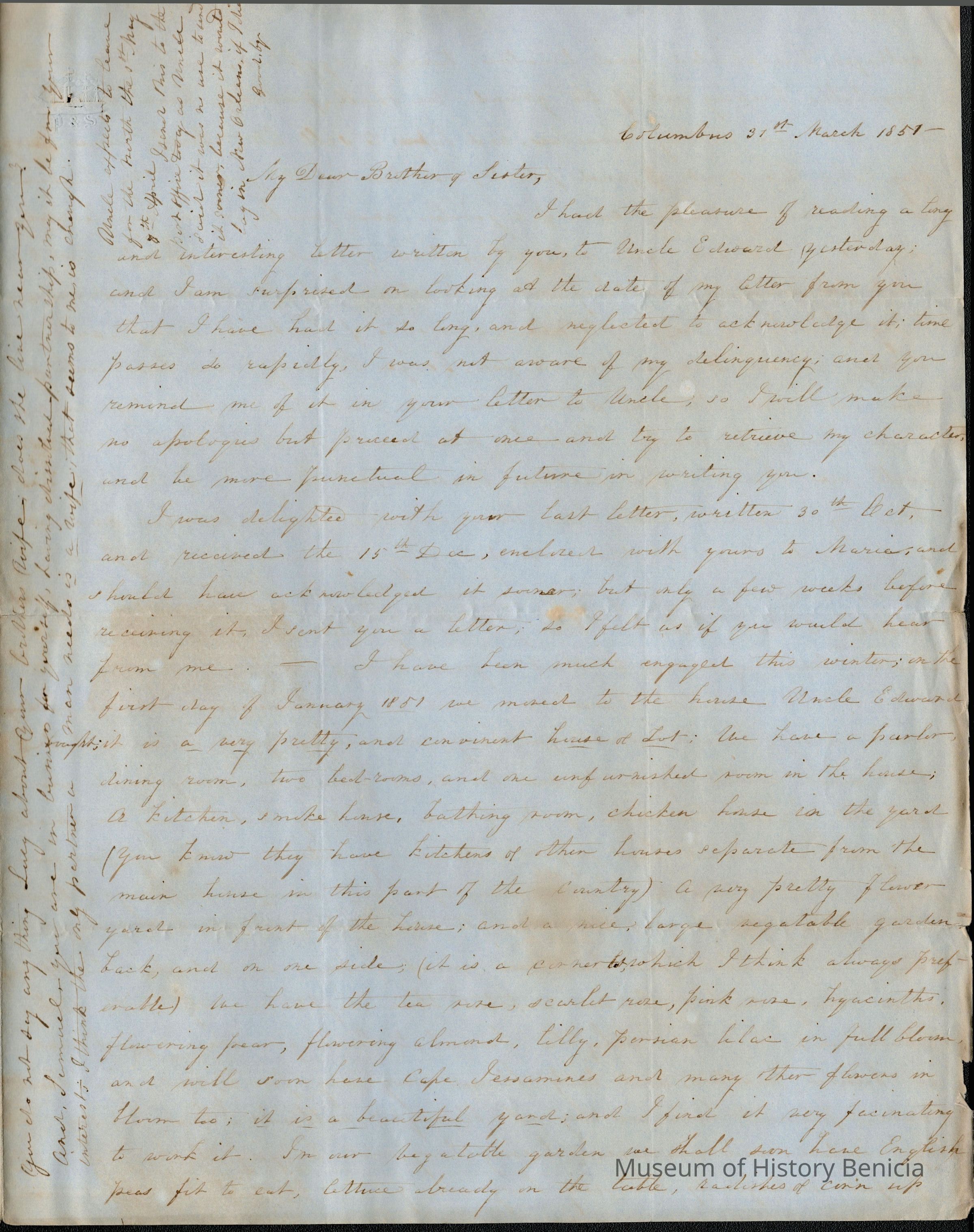 This is a letter dated 03/31/1851 from Samuel Gray's sister Mary Joanna to her sister-in-law Lucy Gray and her brother Samuel Gray regarding family matters. She talks about the new house they have moved into that was purchased by her Uncle Edward. She describes it in detail. At one point she lists the members of her family; husband, wife, "darkie" and temporarily, the second son of their cousin Frances, George Peabody.