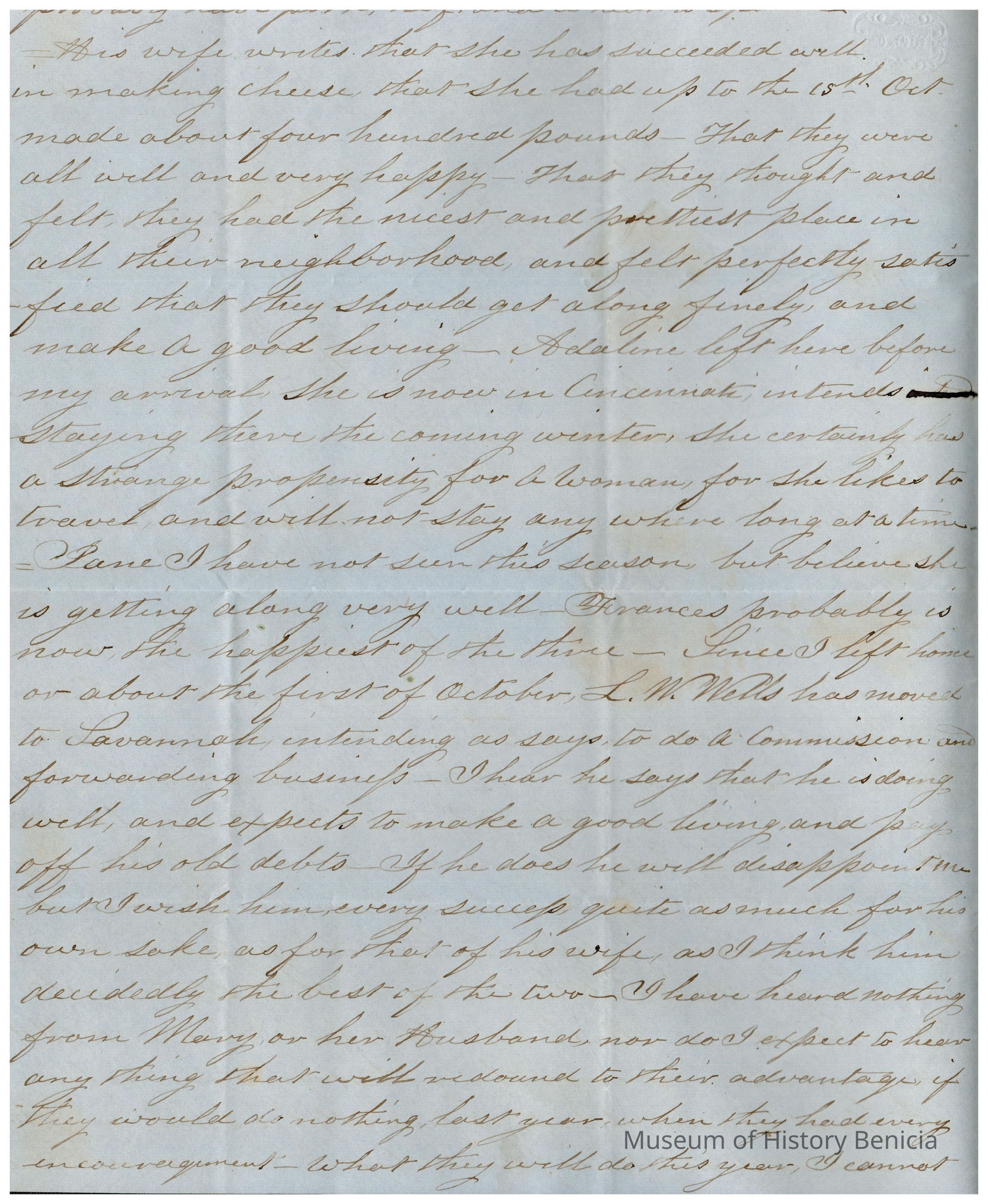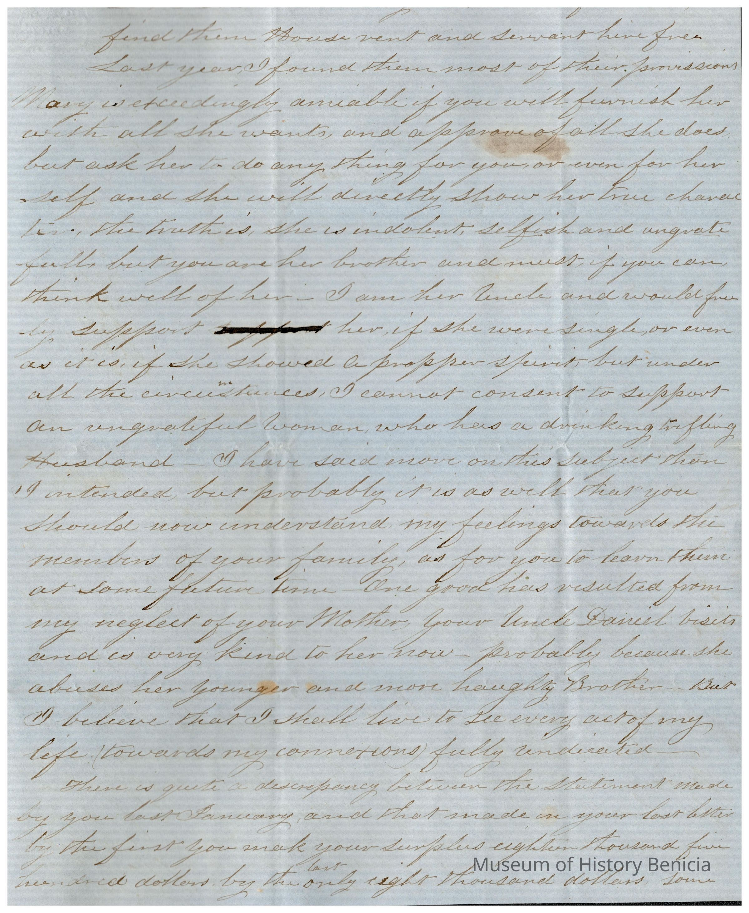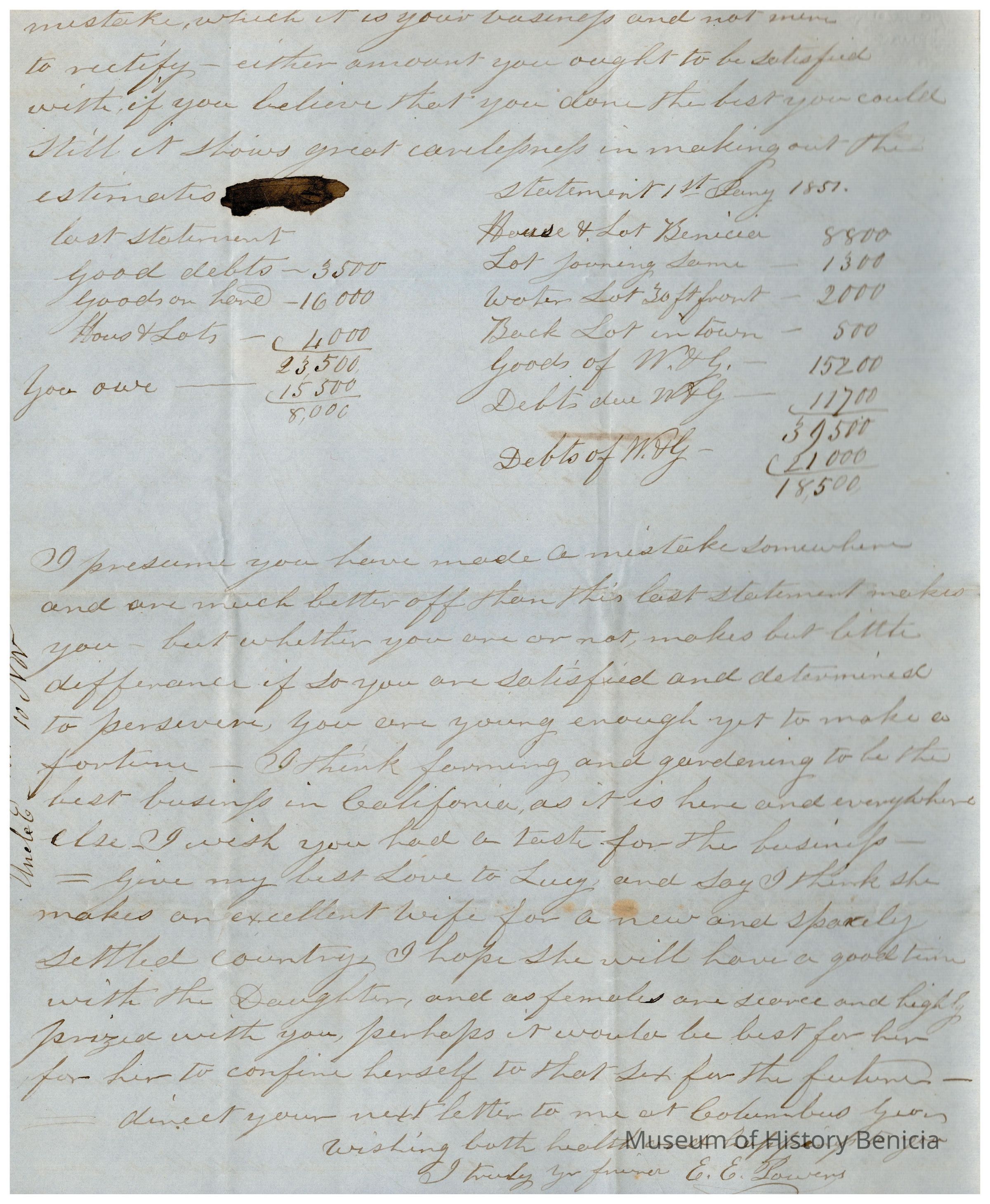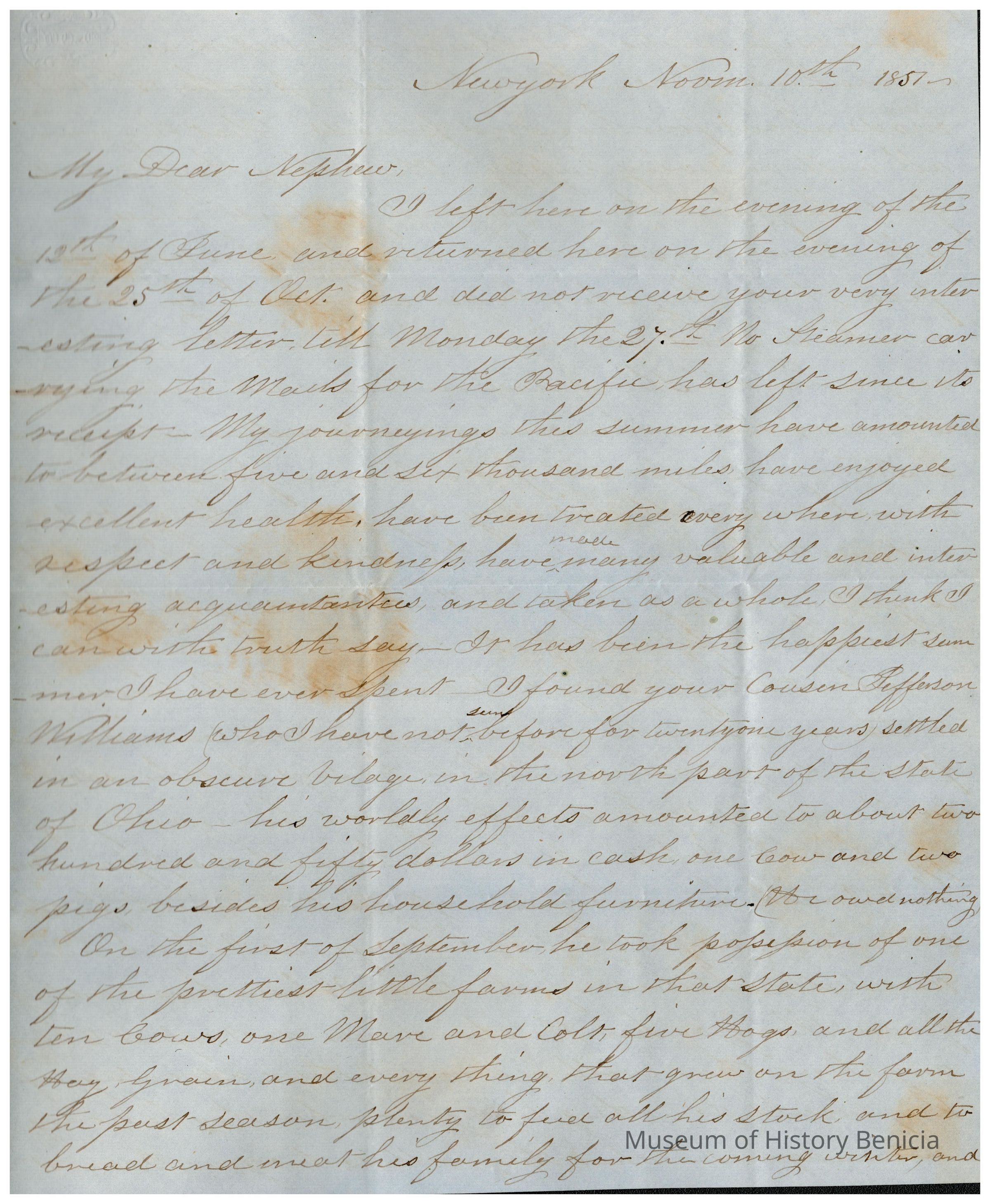 This is a letter to Samuel C Gray from his uncle on his Mother's side, Edward Powers. The letter is written while he is in New York, NY. Mr. Powers talks of his travels the past year and says that this summer has been the happiest time of his life. He tells of visiting Samuel's cousin, Jefferson Williams, in Ohio where he has a small farm. Mr. Powers has said in other letters that he would like to help Jefferson. He offers his opinion of other members of the family and isn't so kind to them. He finds Samuel's sister Mary to be lazy and Mr. Wells seems to not please him either. He congratulates Lucy, Samuel's wife, on having a daughter and suggests that she continue to have daughters as they are a scarce commodity in California. He then lists two different accountings that Samuel has sent him in the past showing what he thinks is an error in his accounts.Collection