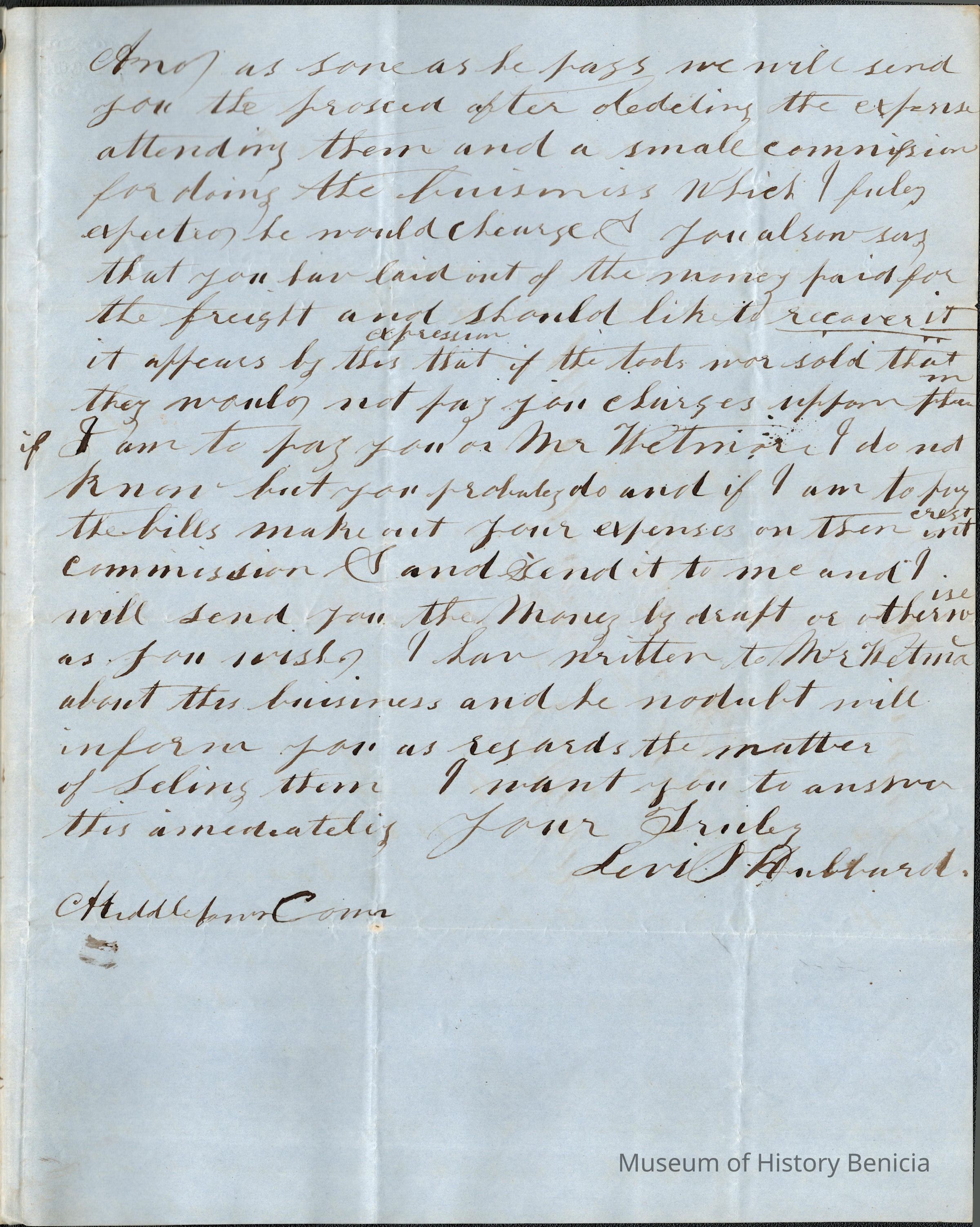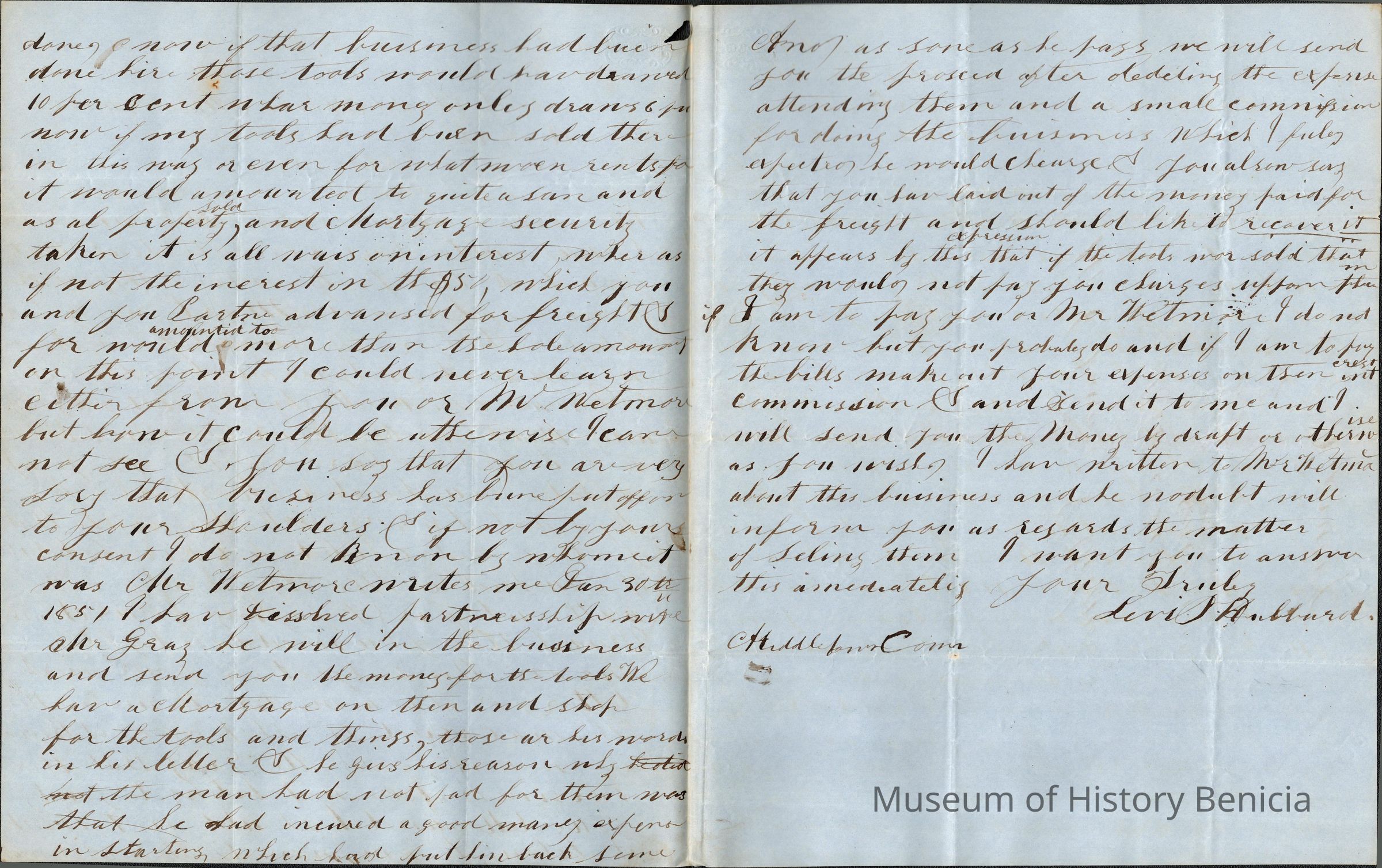 The image features a historical document dated March 19, 1853, from Middleboro, Connecticut. It is a handwritten letter from Levi Hubbard to Samuel Gray, expressing surprise upon learning that Gray had tools and possibly a shop sold with an outstanding mortgage. Hubbard appears concerned that the shop was mortgaged without prior notice and requests clarification on the subject. The letter's tone suggests a misunderstanding or oversight regarding the sale and financial obligations, prompting Hubbard to seek resolution or explanation about the ownership and ensuing responsibilities. The old-fashioned cursive writing is typical of the mid-19th century.
