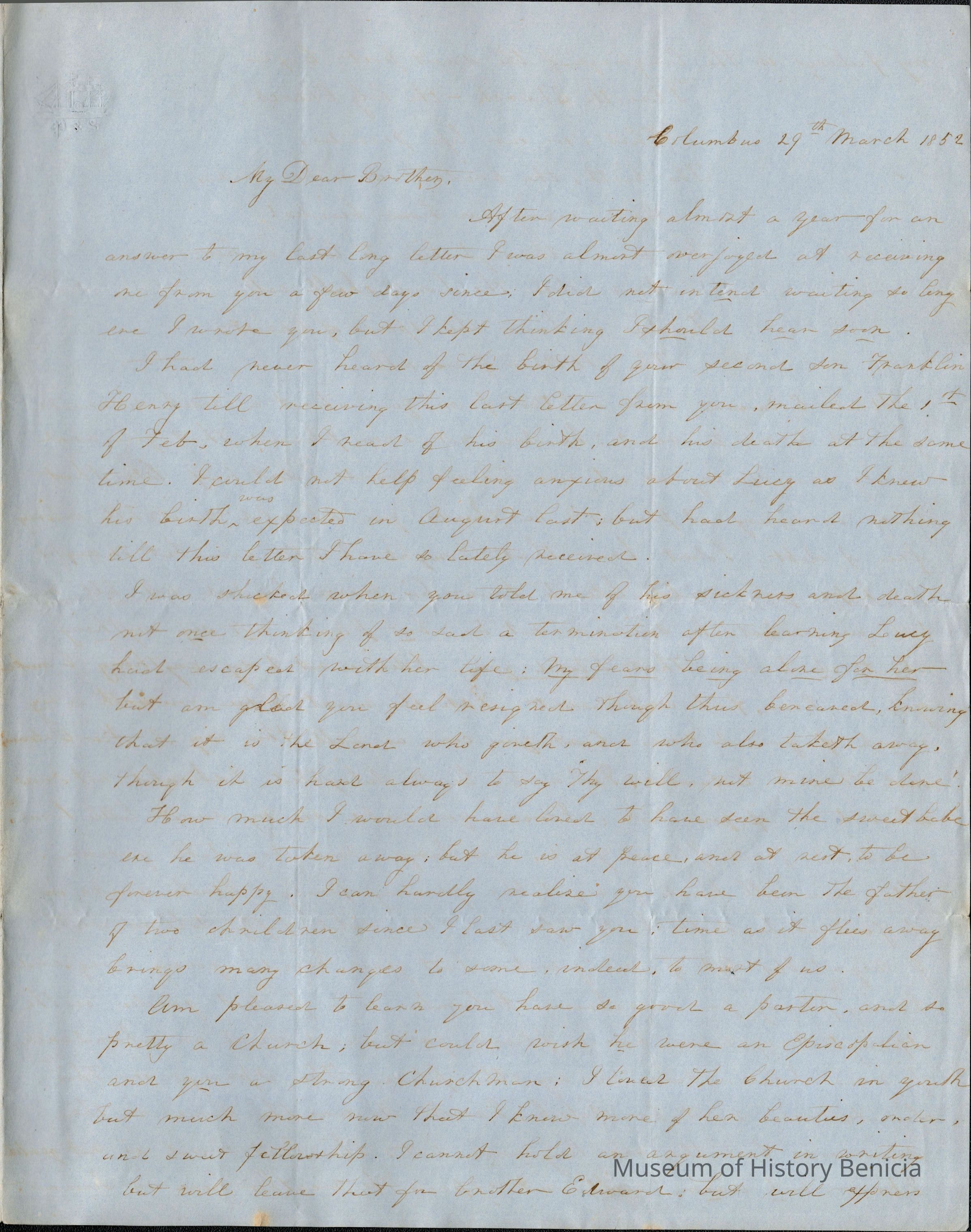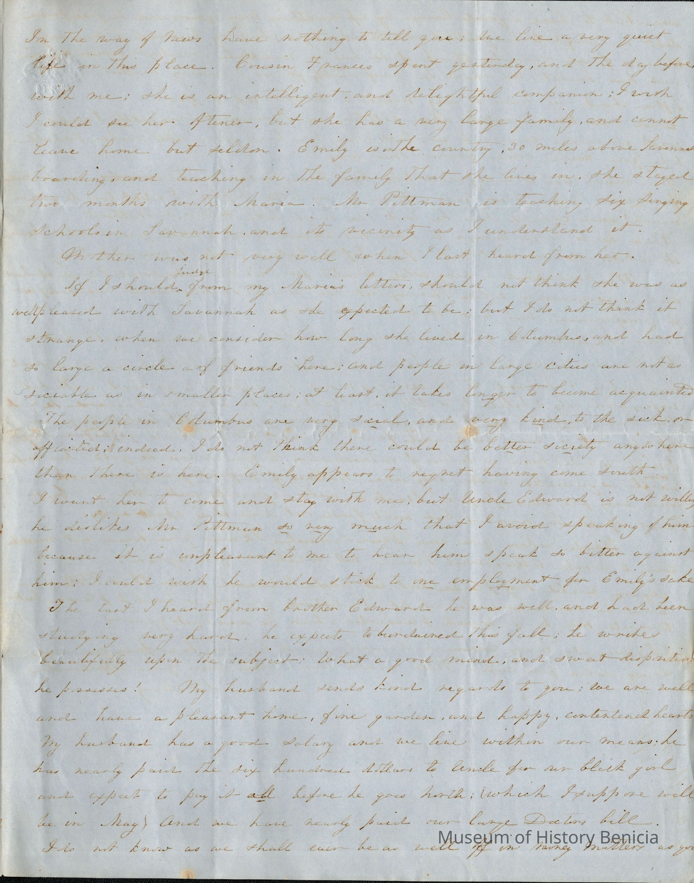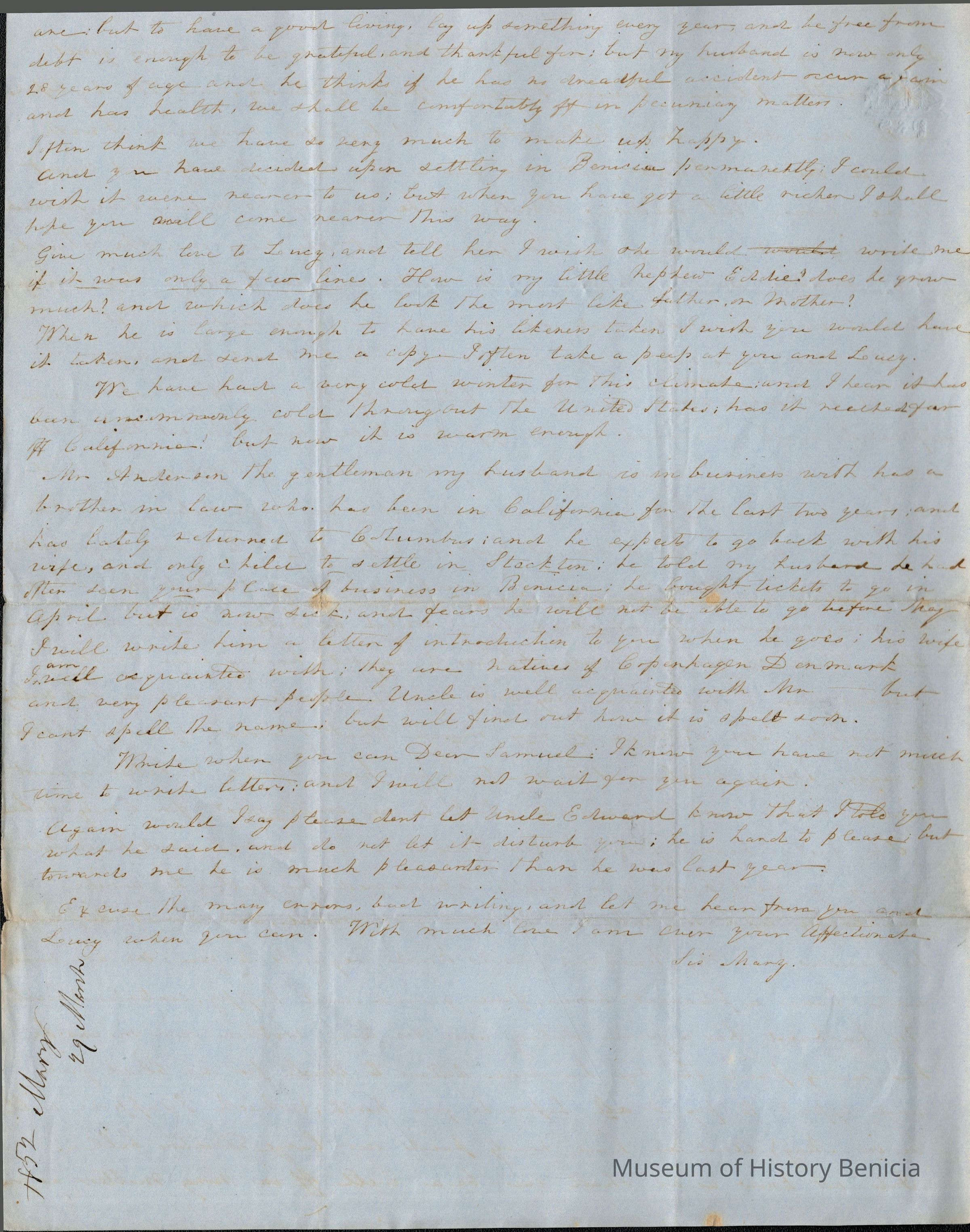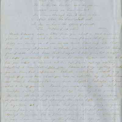 She says she is glad that Samuel has a good pastor and church to attend. (At this time Samuel is attending Woodbridge's church in Benicia.) She goes on to wish it were an Episcopalian church and sends a poem to Samuel regarding religion.
