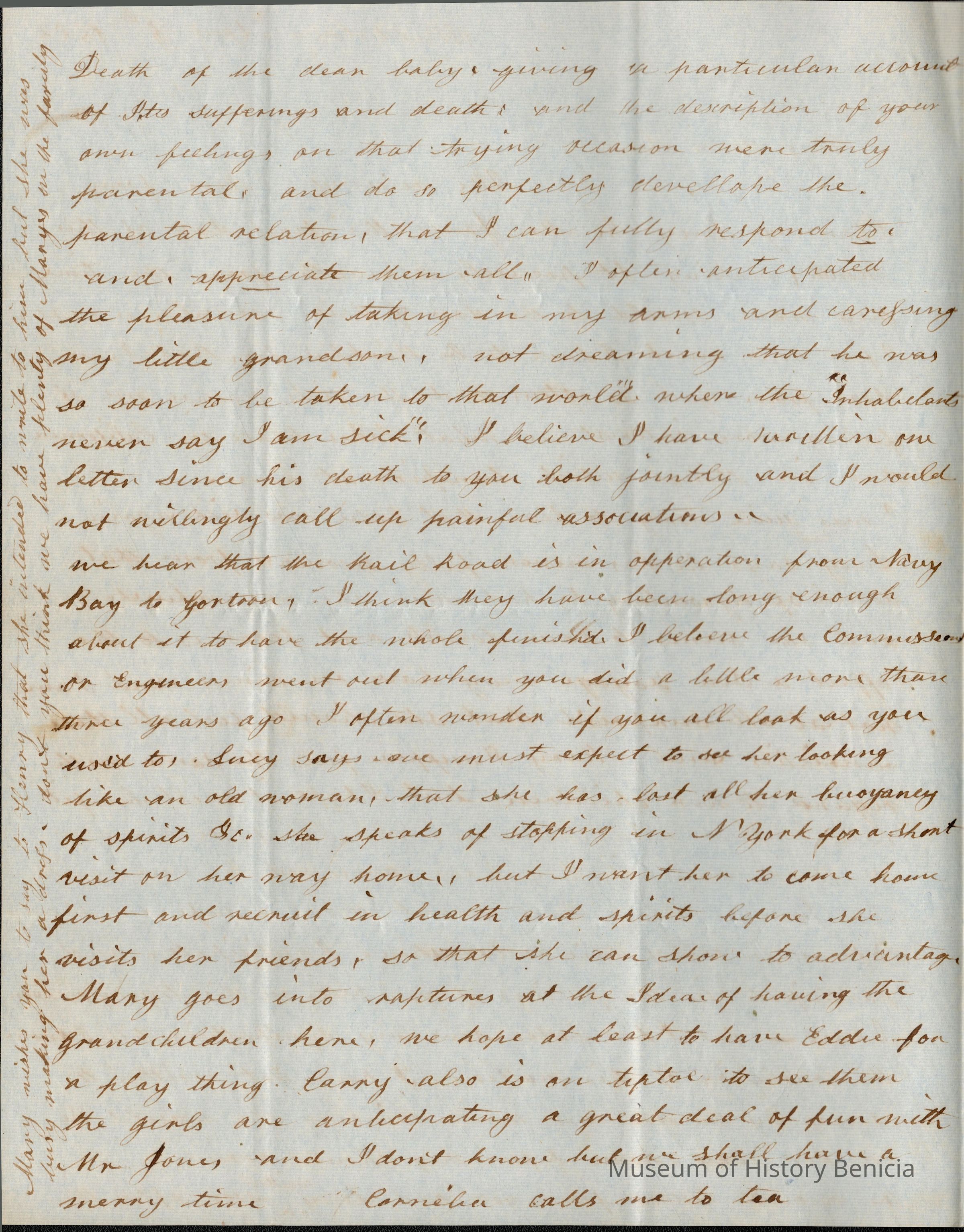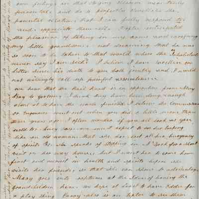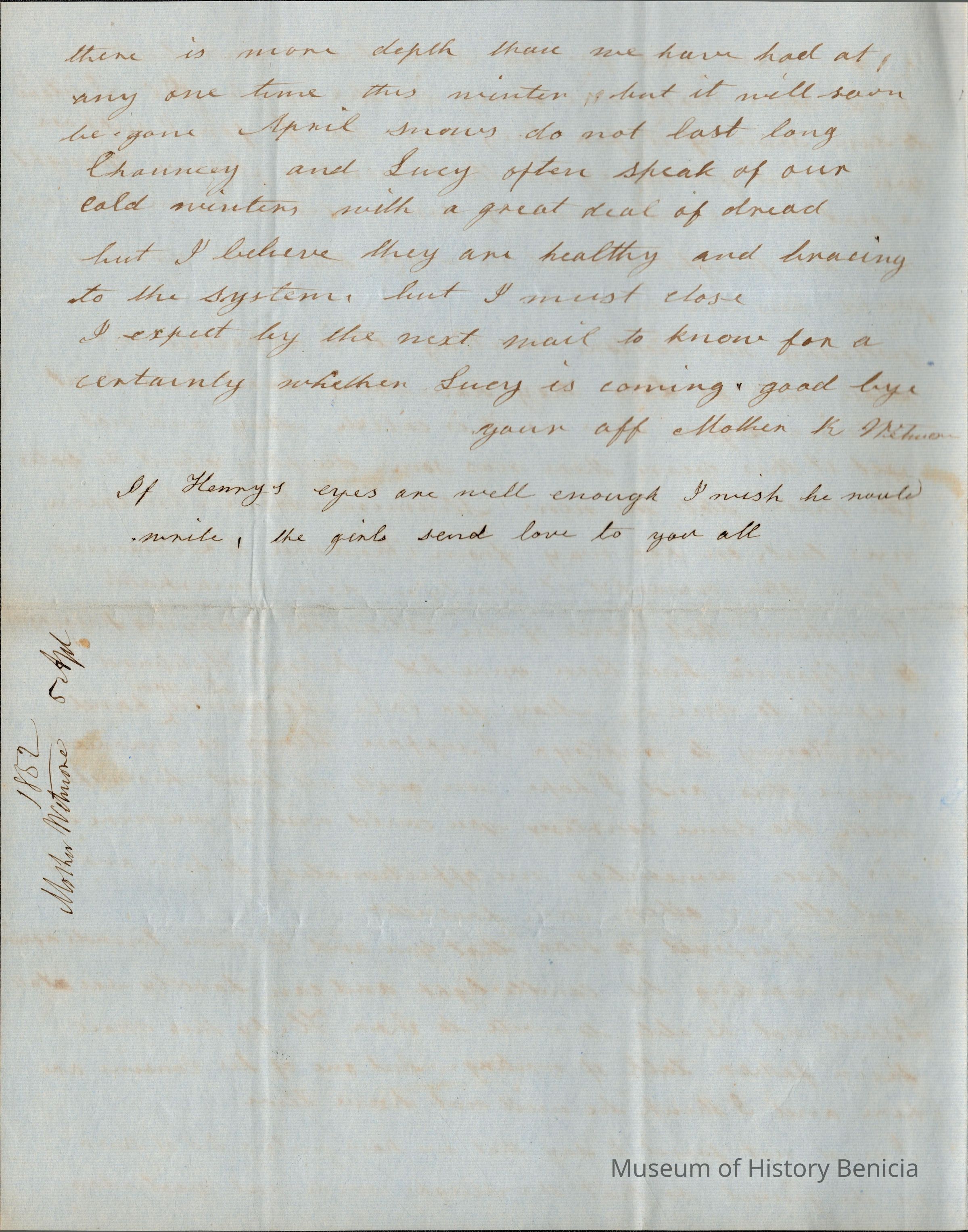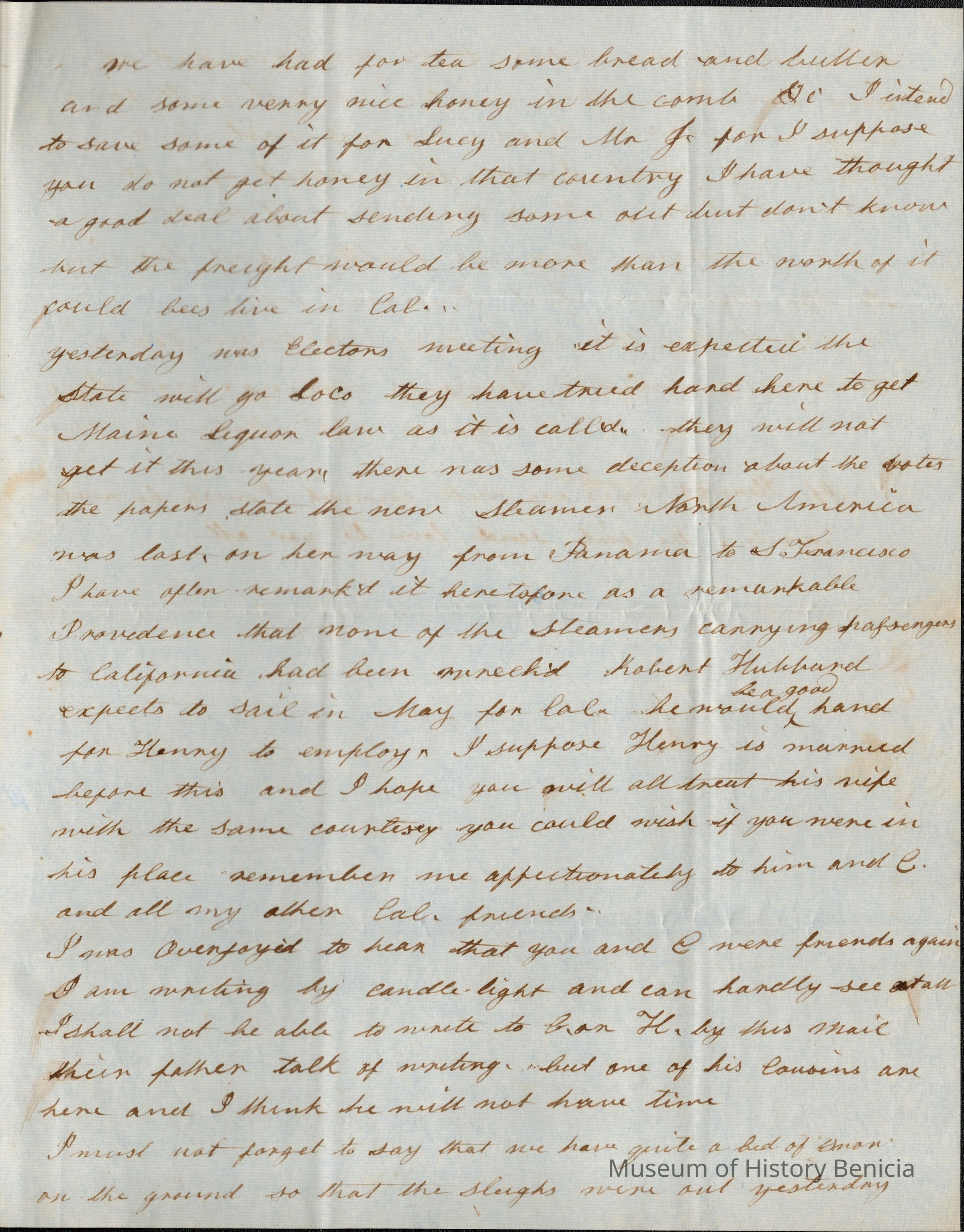 She mentions the upcoming elections and the fact that they won't be able to pass the "Maine Liquor Laws" (prohibition - see below). She also mentions her son Henry (1828 - 1899) who is mining in California.