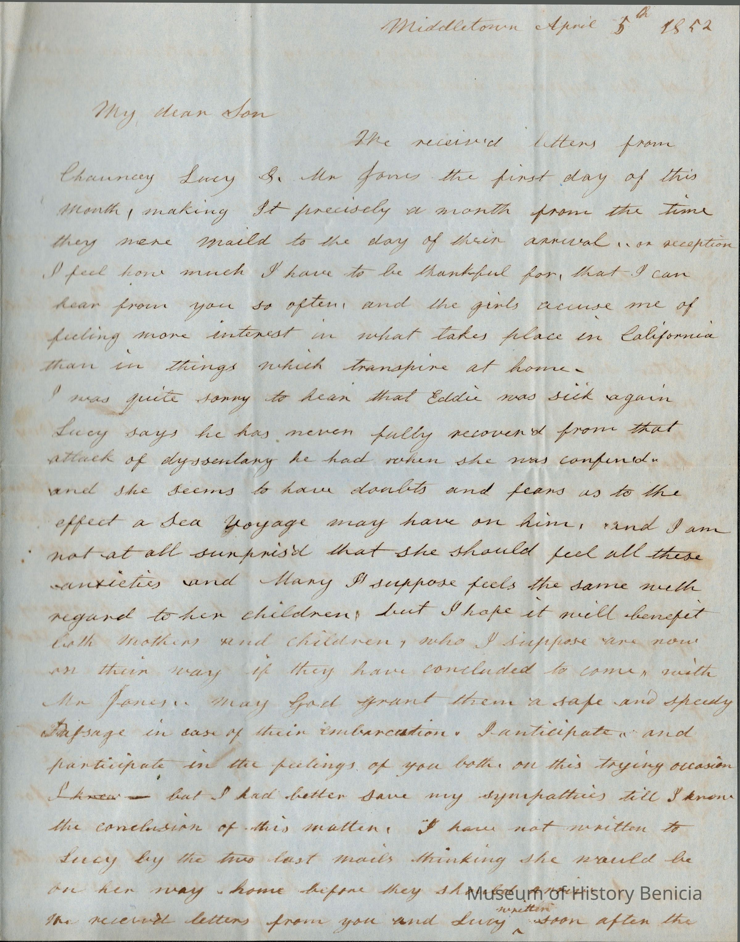 This is a letter dated 04/05/1852 from Mother Rebecca Hubbard Wetmore (1795 - 1885) to Samuel Gray regarding family matters. She mentions their son Edward's (1849 - 1920) health and the expected visit from her daughter Lucy (1820 - 1879). She is anxious to see Lucy and her grandchild and wishes they wouldn't go to New York first.
