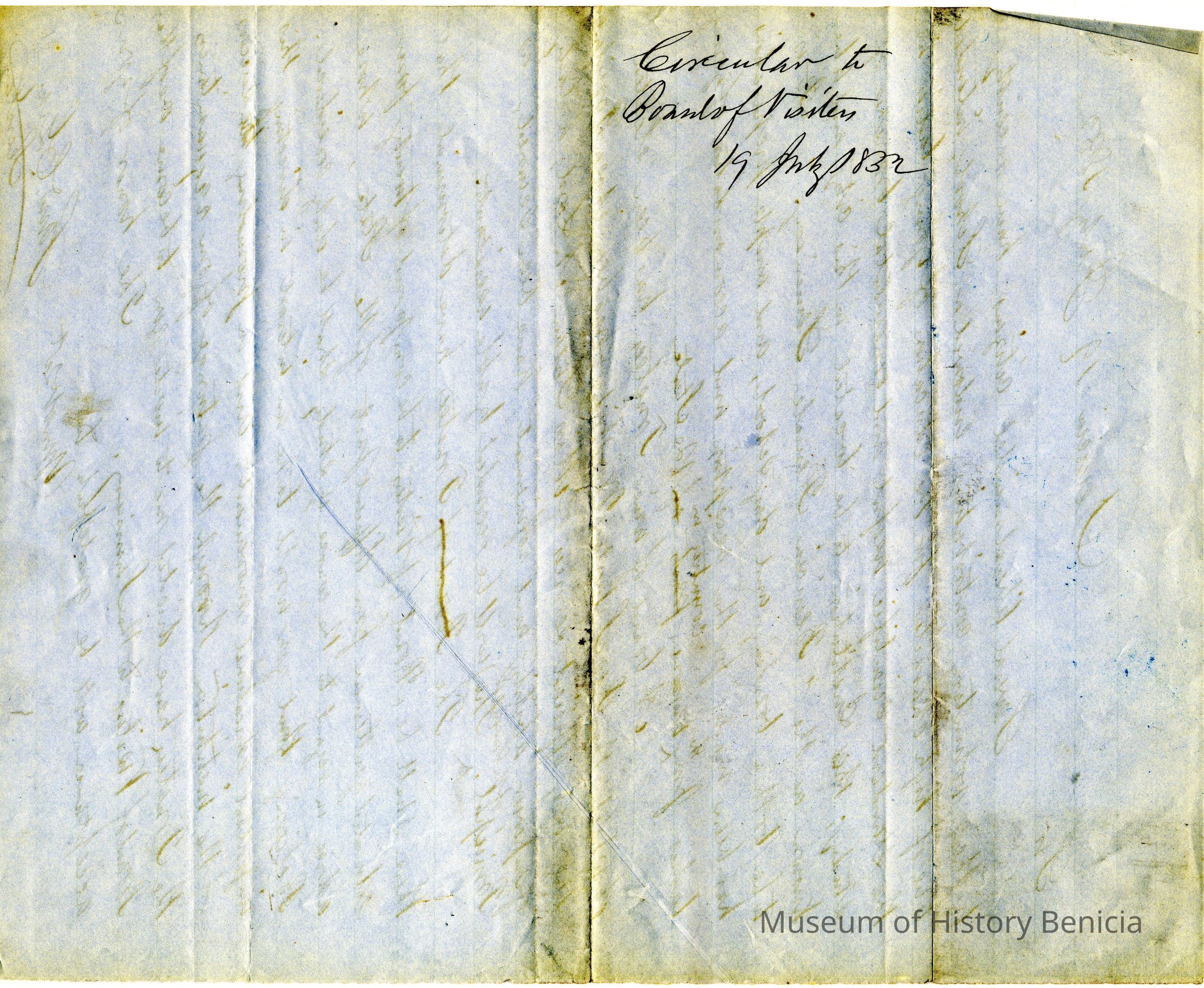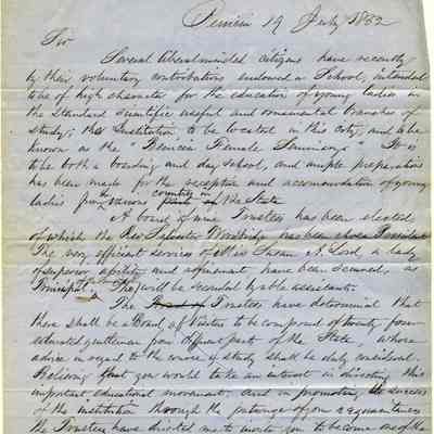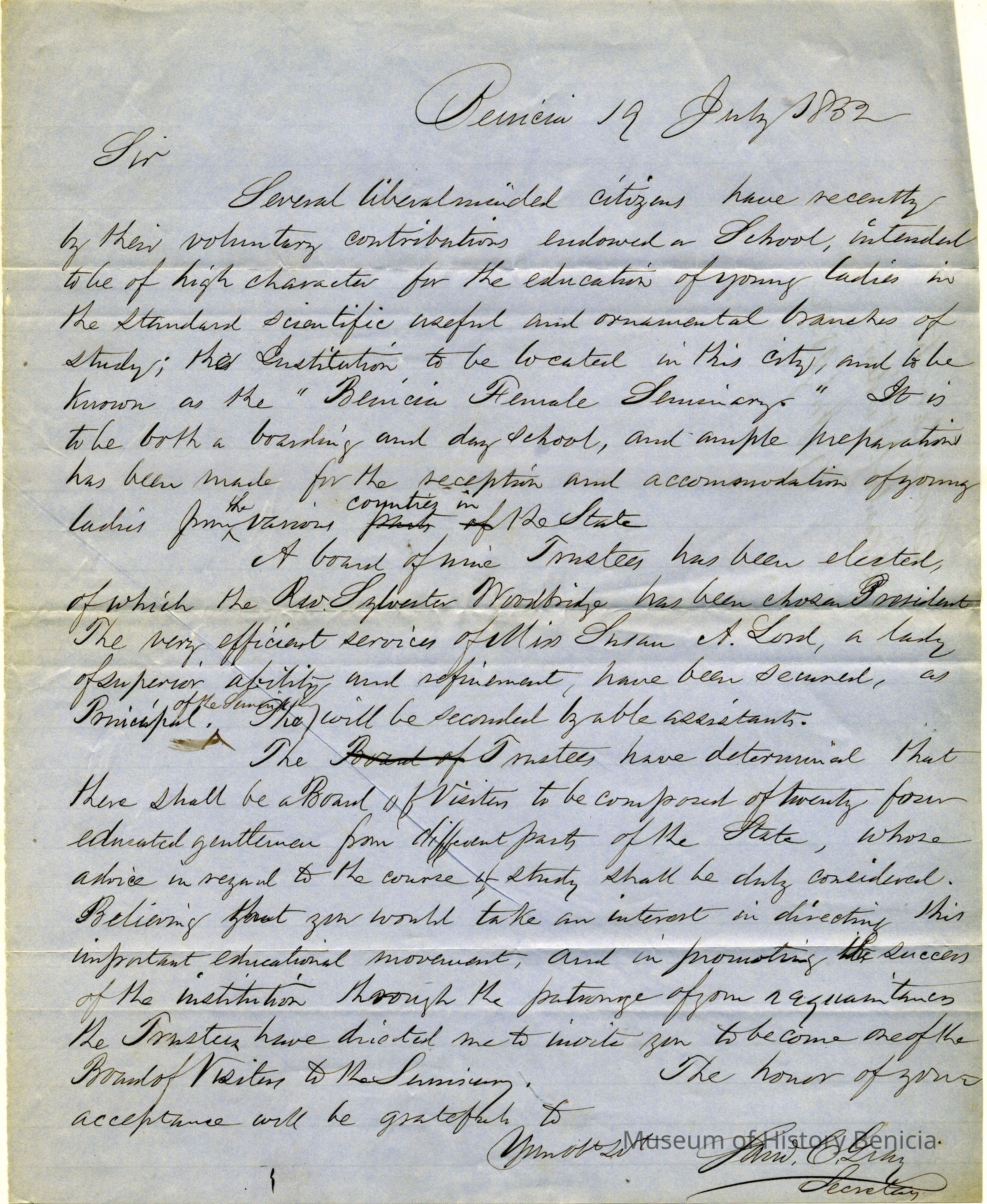The image depicts an 1852 letter from Saml. C. Gray, the Secretary, inviting a recipient to join the Board of Visitors for the newly established Benicia Female Seminary, a school for young ladies in Benicia, California. The seminary is described as being of high character, focusing on both standard scientific educational branches and ornamental studies, planned to operate as a boarding and day school. The institution owes its founding to the contributions of liberal-minded citizens, with a board of nine trustees led