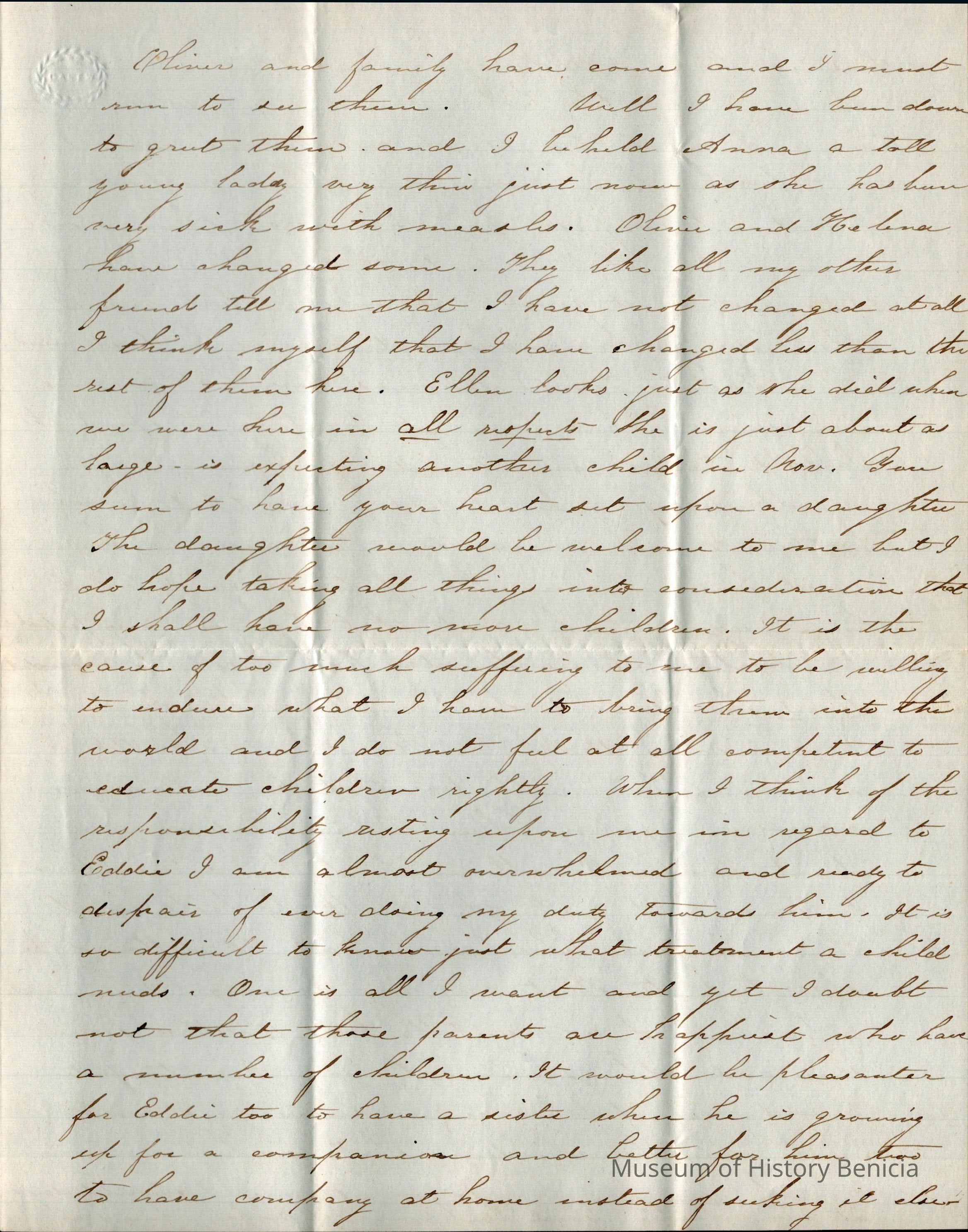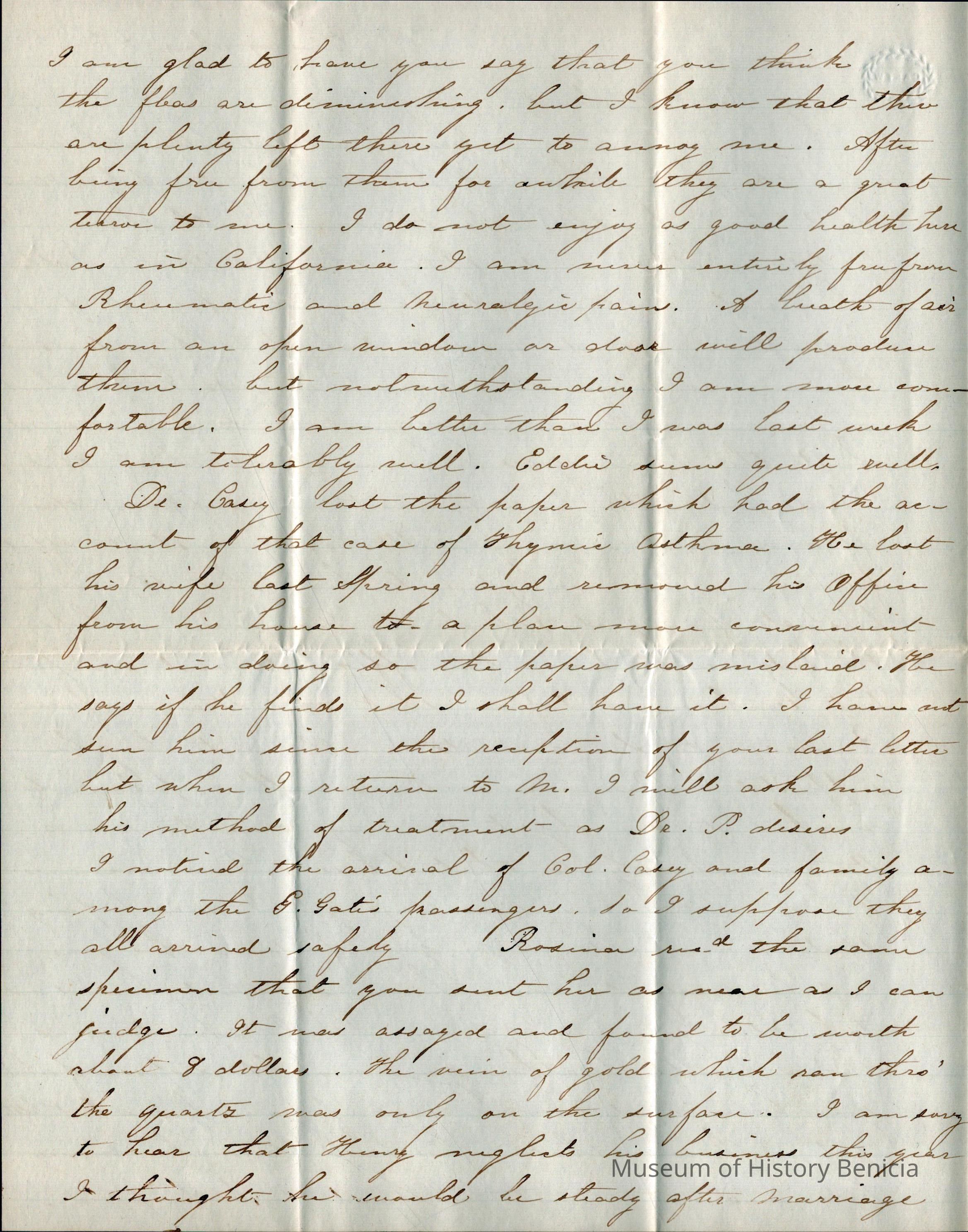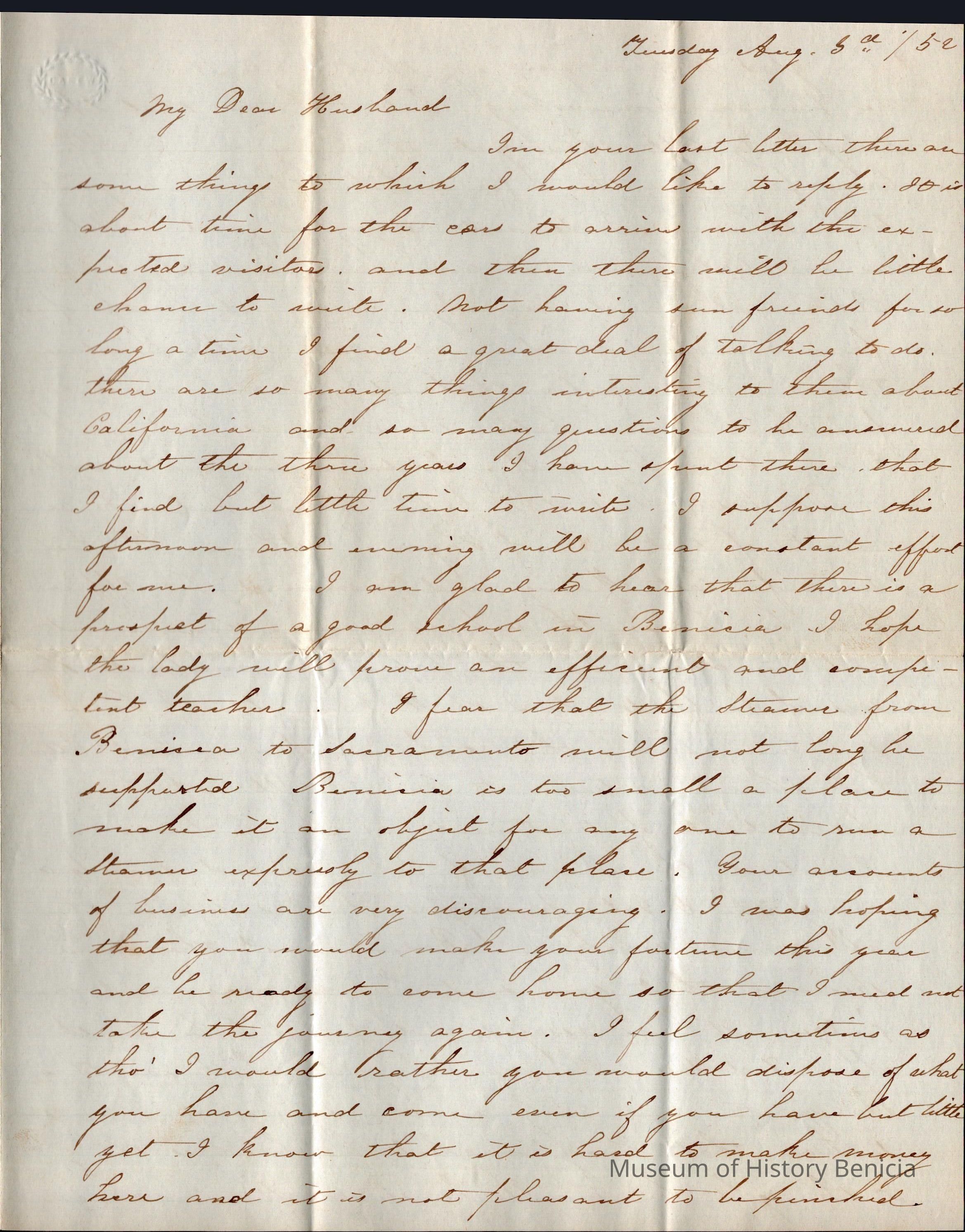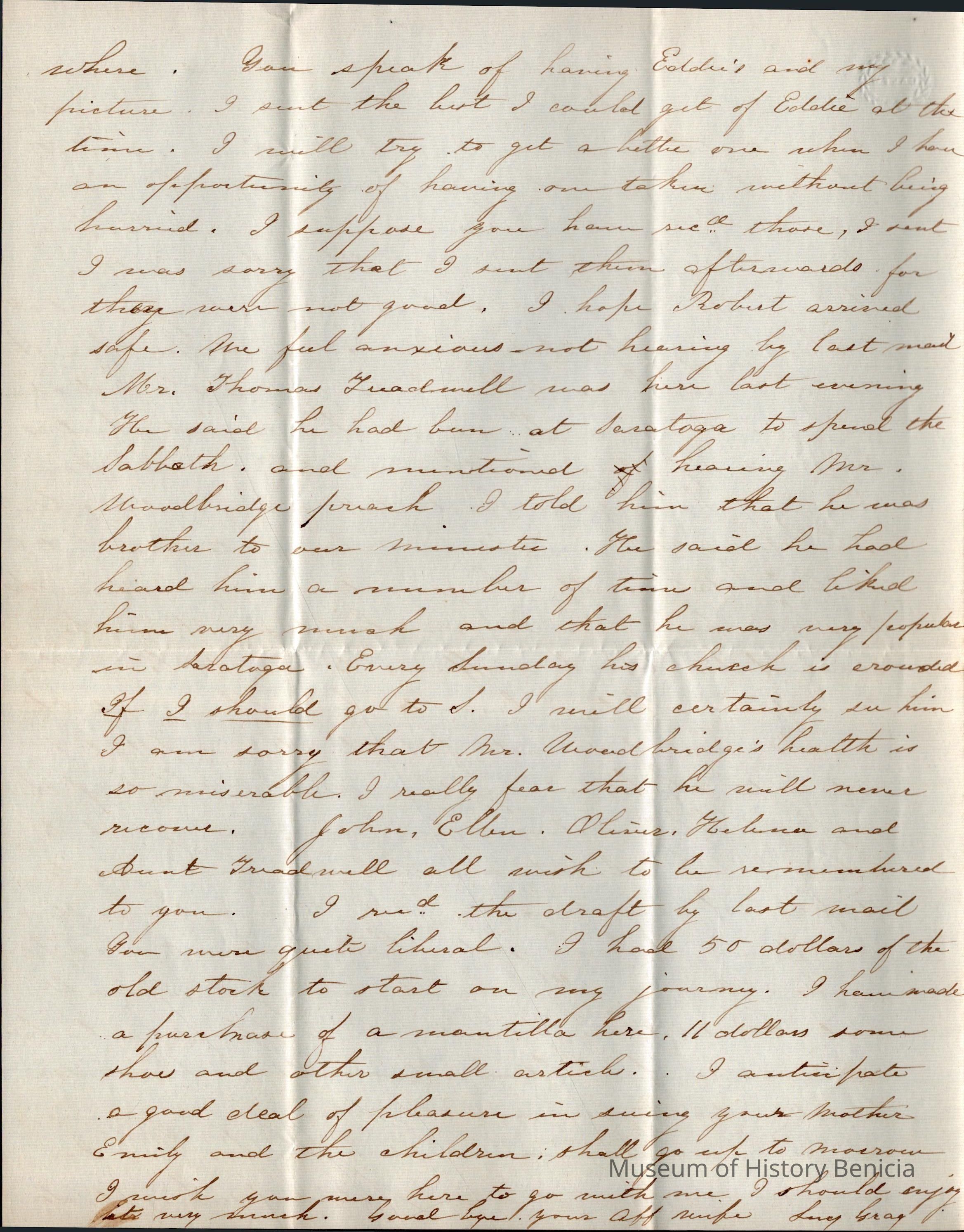 This is a letter from Lucy Wetmore Gray on the East Coast to her husband Samuel C Gray in Benicia.