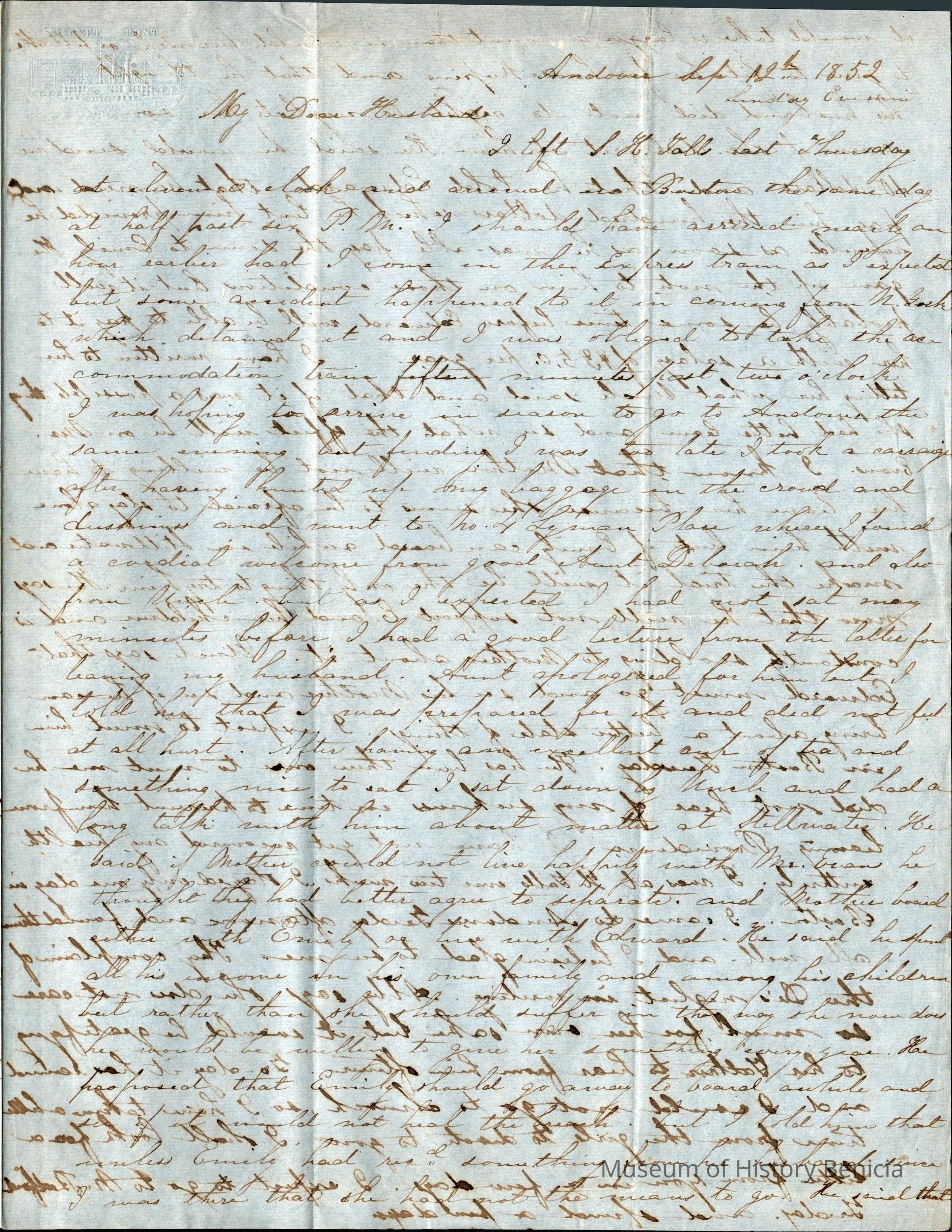 This is a letter from Lucy Wetmore Gray in Andover to her husband Samuel C Gray dated 09/12/1852. She talks of her travels to Andover and arriving at her Aunt Deborahs. She says that her Uncle gave her a lecture for "leaving her husband". (note: These letters from Lucy on the East Coast have indicated that Samuel and she were having marital problems, but this is the first direct indication of them being separated.)