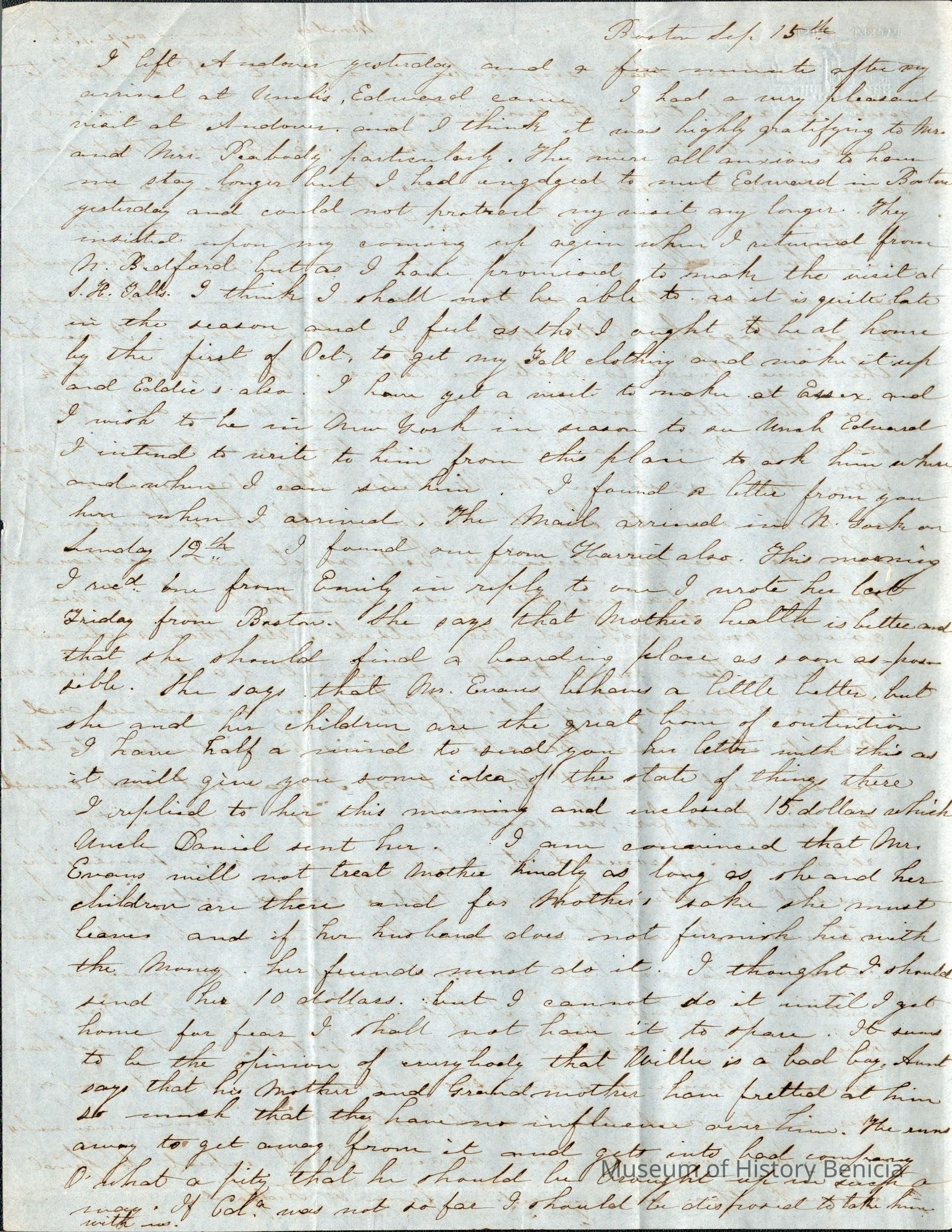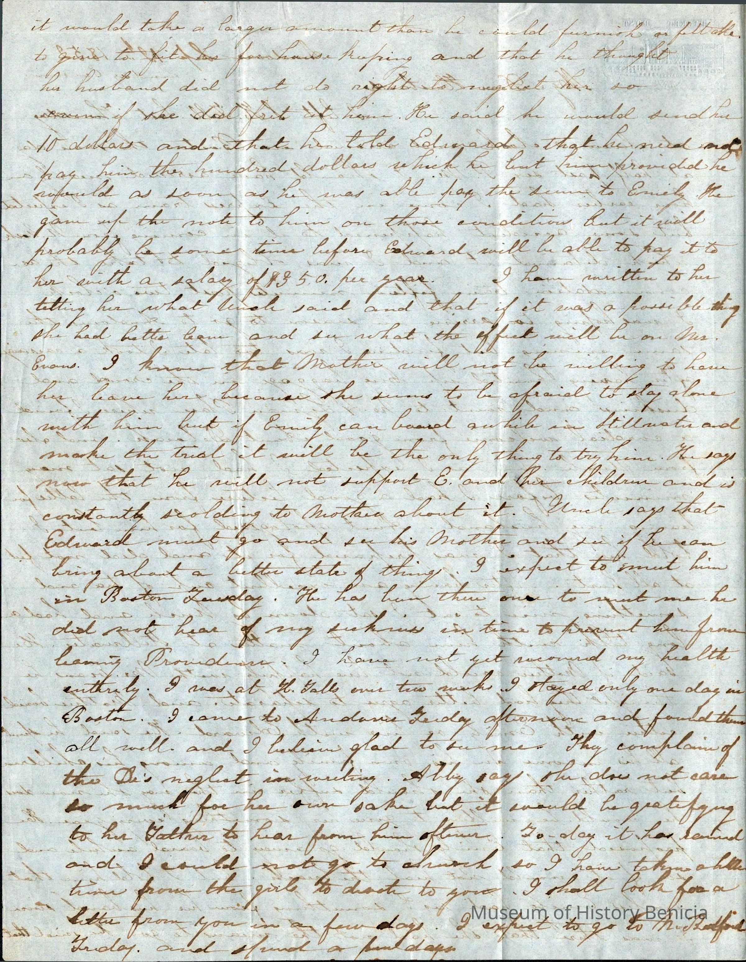 The letter then talks of "Mother's" situation in Stillwater and her problems with Mr. Evans. (note: I think this is Samuel's mother who is married to Mr. Evans.)