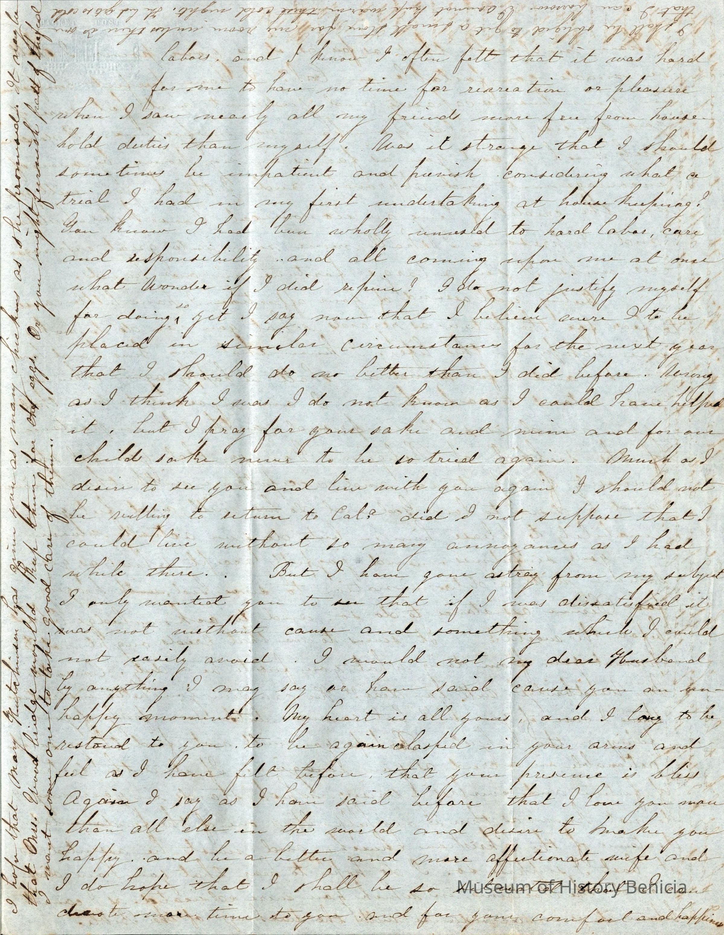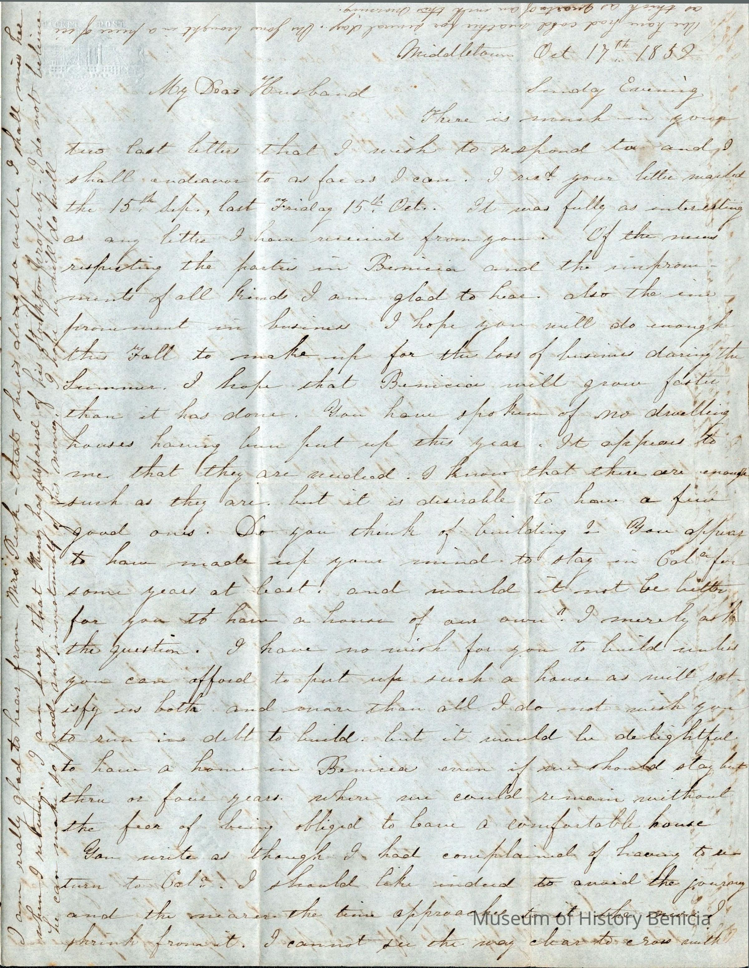 This is a letter from Lucy Wetmore Gray on the East Coast to her husband Samuel C Gray in Benicia dated 10/17/1852.