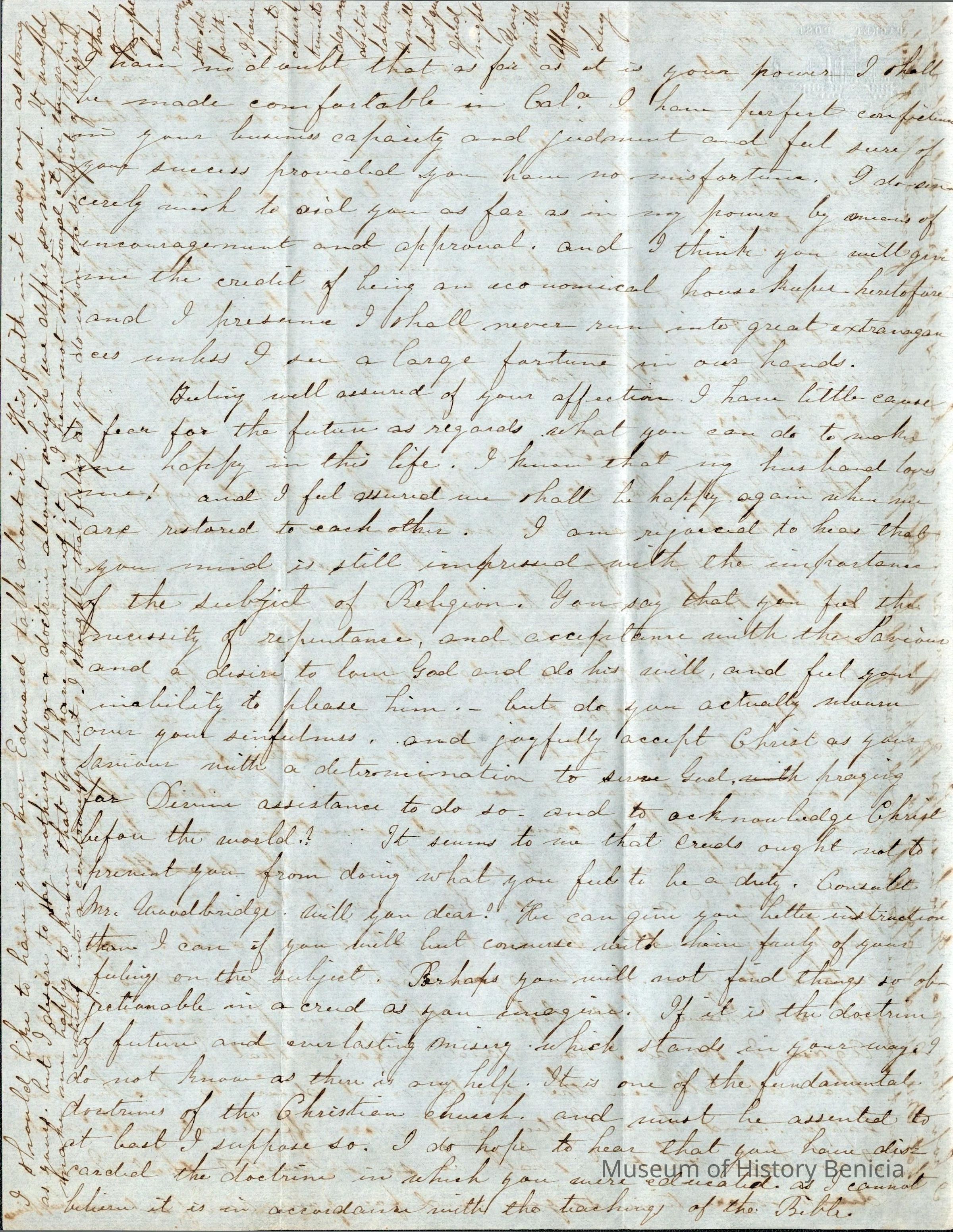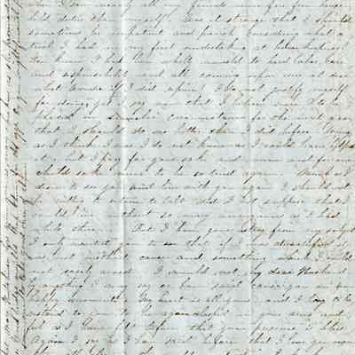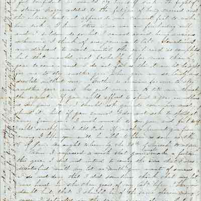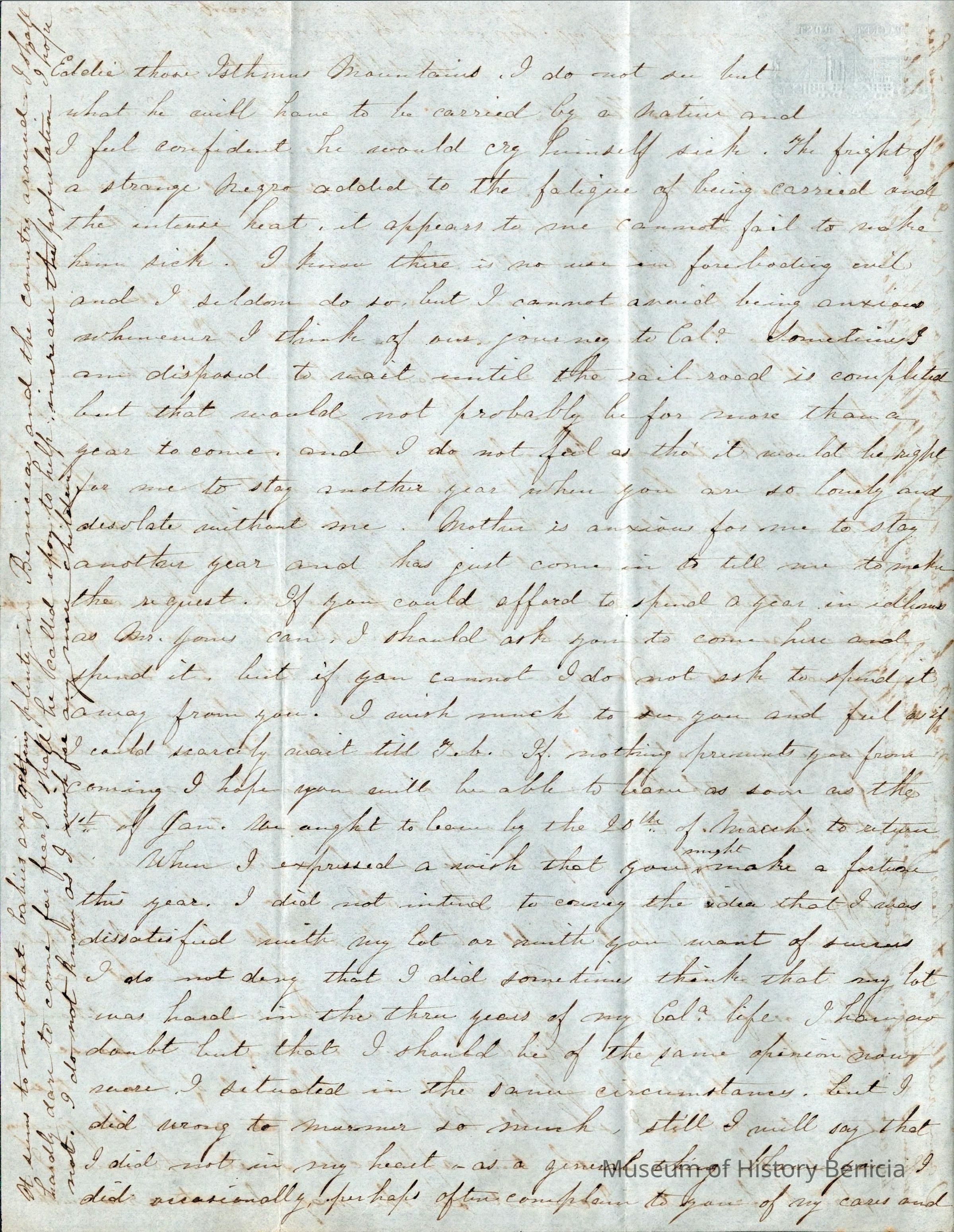 She says that Samuel's ;ast letter seemed that he thought she didn't want to return to California. She does say that she is not looking forward to crossing the Isthmus with her small son. She expects the only way he can make the crossing is to be carried by "some strange Negro" which she expects will frighten him and make him sick. She does wish that she could wait for the train to be finished but knows that would be another year and she doesn't want to be away from him that long. She does wish that Samuel could come East and spend a year in idleness but seems to dismiss the idea as impractical.