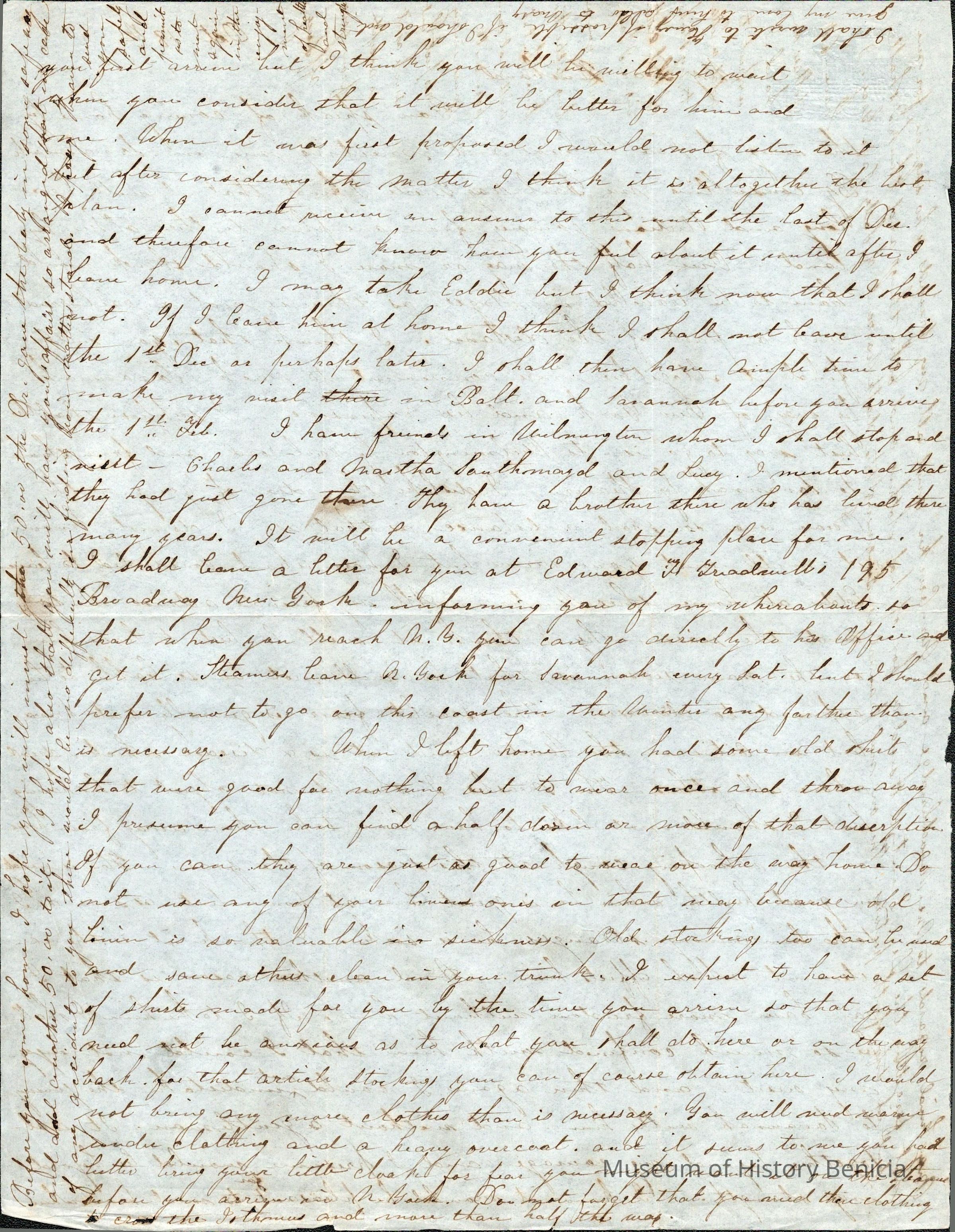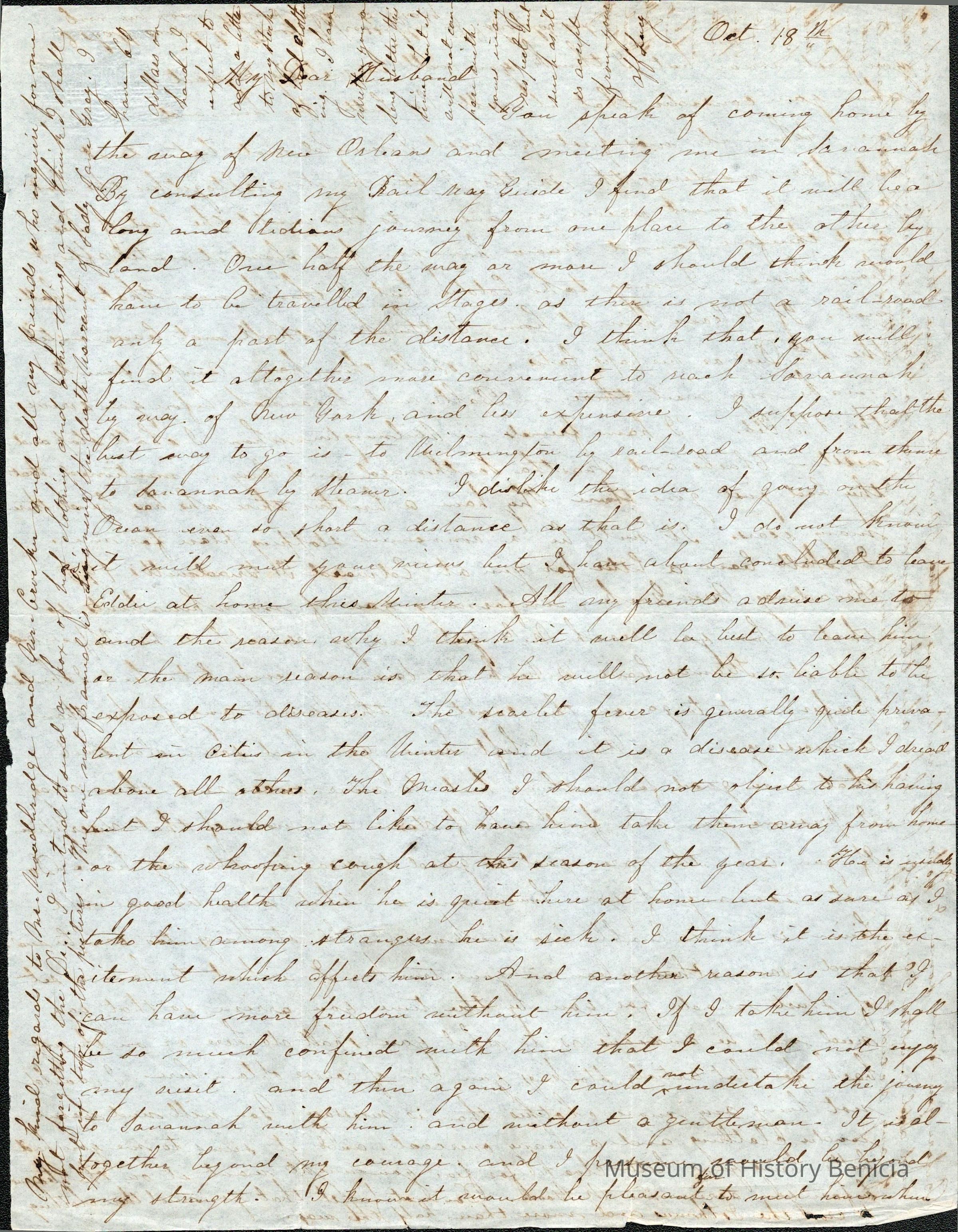 This is a handwritten letter from Lucy Wetmore Gray to her husband Samuel, dated October 18 (year unspecified), discussing travel plans from New Orleans via railroad for part of the journey. She suggests traveling through New York to Savannah, emphasizing discomfort with the current season and concern about her son’s health, who often falls ill in winter. Her preference leans towards staying at home to avoid potential health issues for him and to manage personal affairs. The writing is dense, filling the page with little margin left