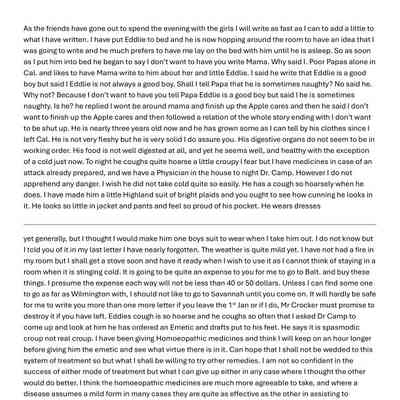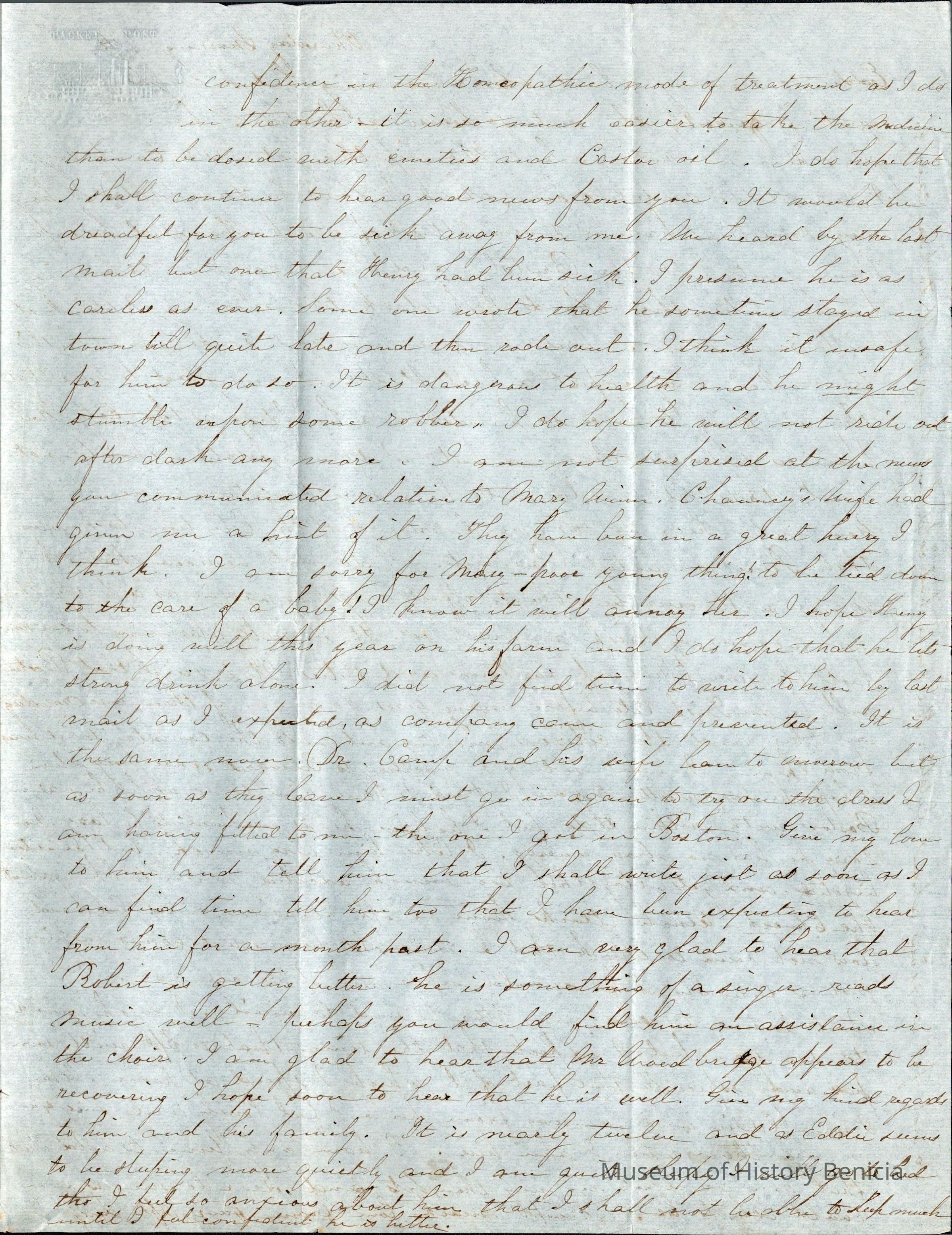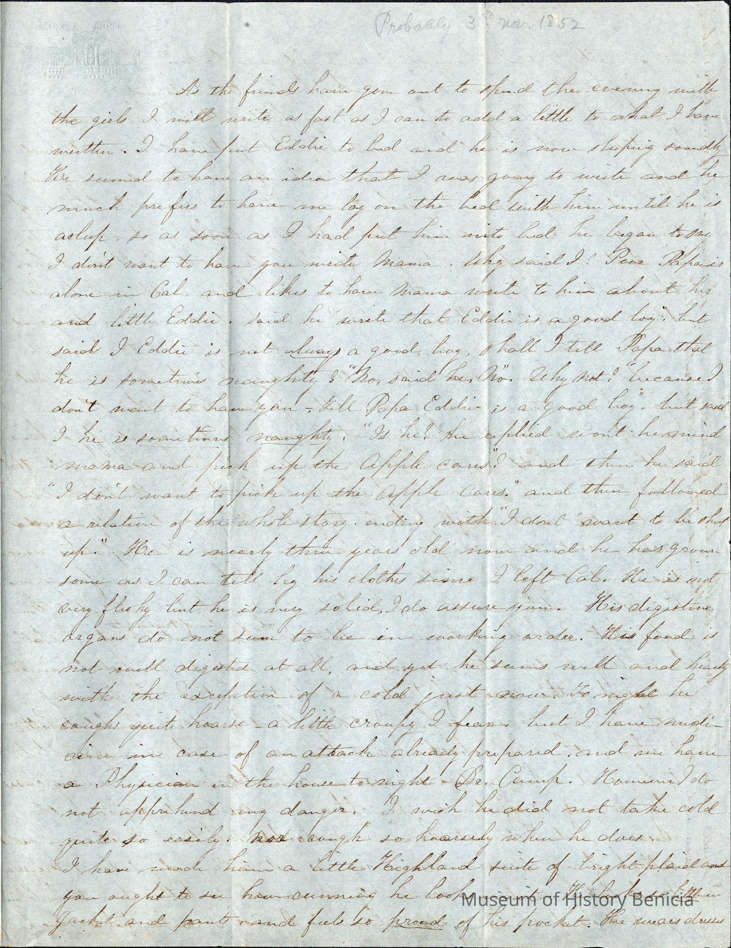 This is a letter from Lucy Wetmore Gray on the East Coast to her husband Samuel C Gray in Benicia dated 11/03/1852. She talks about their son Eddie and his health problems. She seems to prefer Homeopathic medicines than those prescribed by a doctor.
