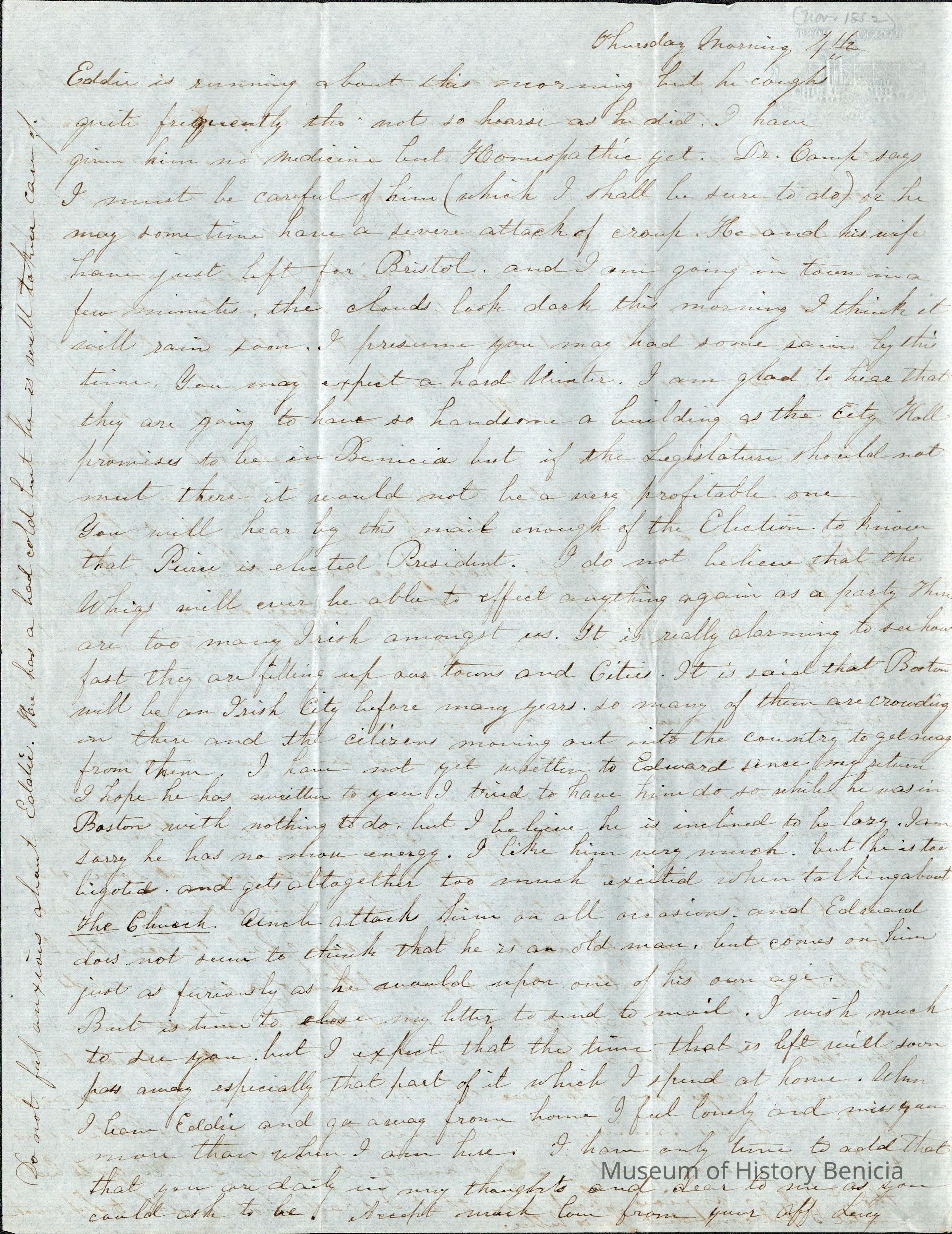 At the end of the letter she mentions that Pierce has won the Presidency. She also expresses concern for the Whig party as it is being taken over by the Irish. She mentions that Boston may soon become an "Irish" city as they keep moving in and others leave to get away from them.