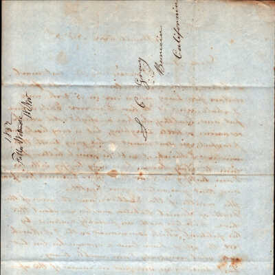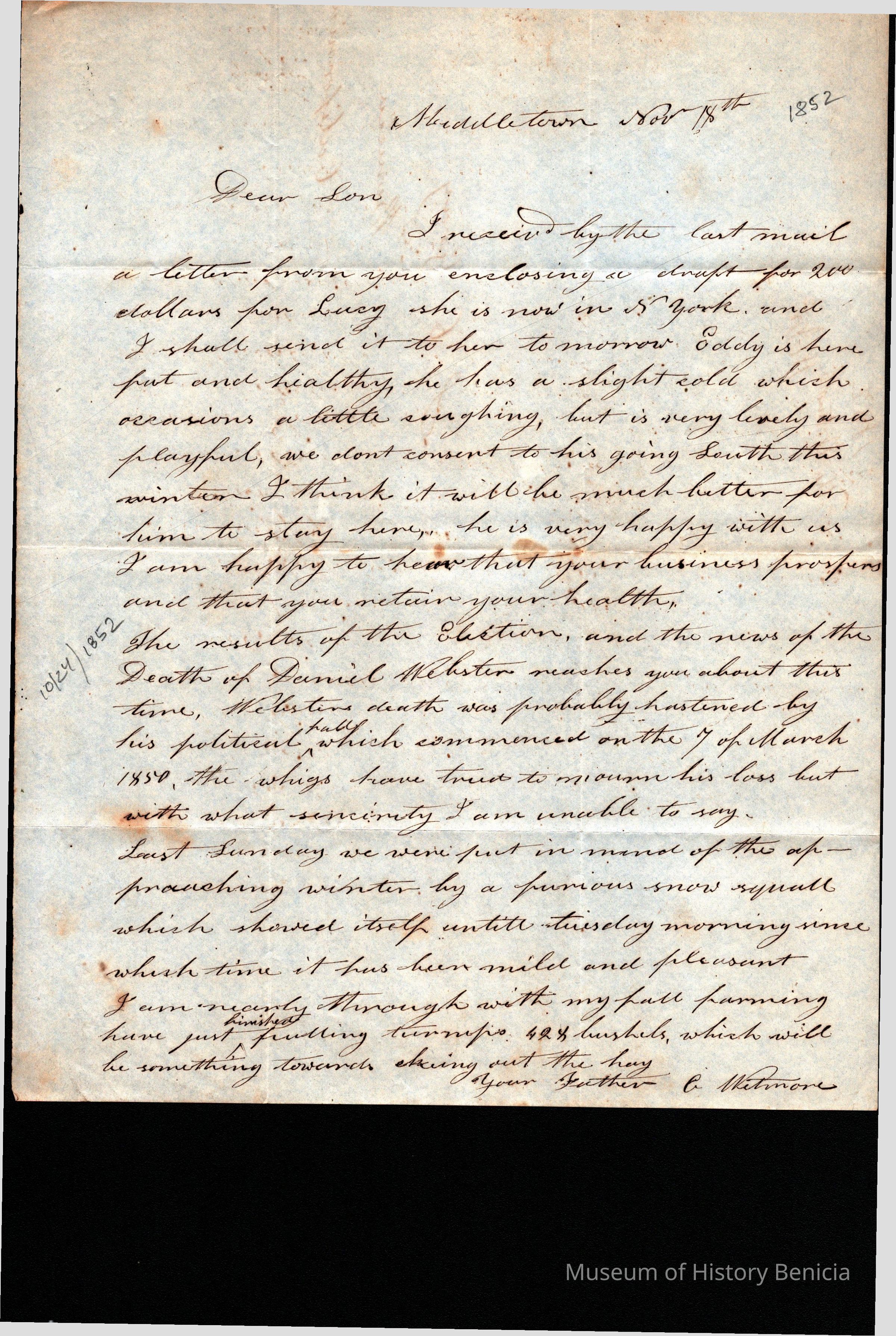 This is a letter dated 11/18/1852 from Chauncey Wetmore (1790 - 1872) to his son-in-law Samuel C Gray regarding family business. He starts by acknowledging the receipt of $200 for Lucy Wetmore Gray who was in New York at the time. He also comments on the recent election and the death of Daniel Webster who he says started his political fall in 03/07/1850.