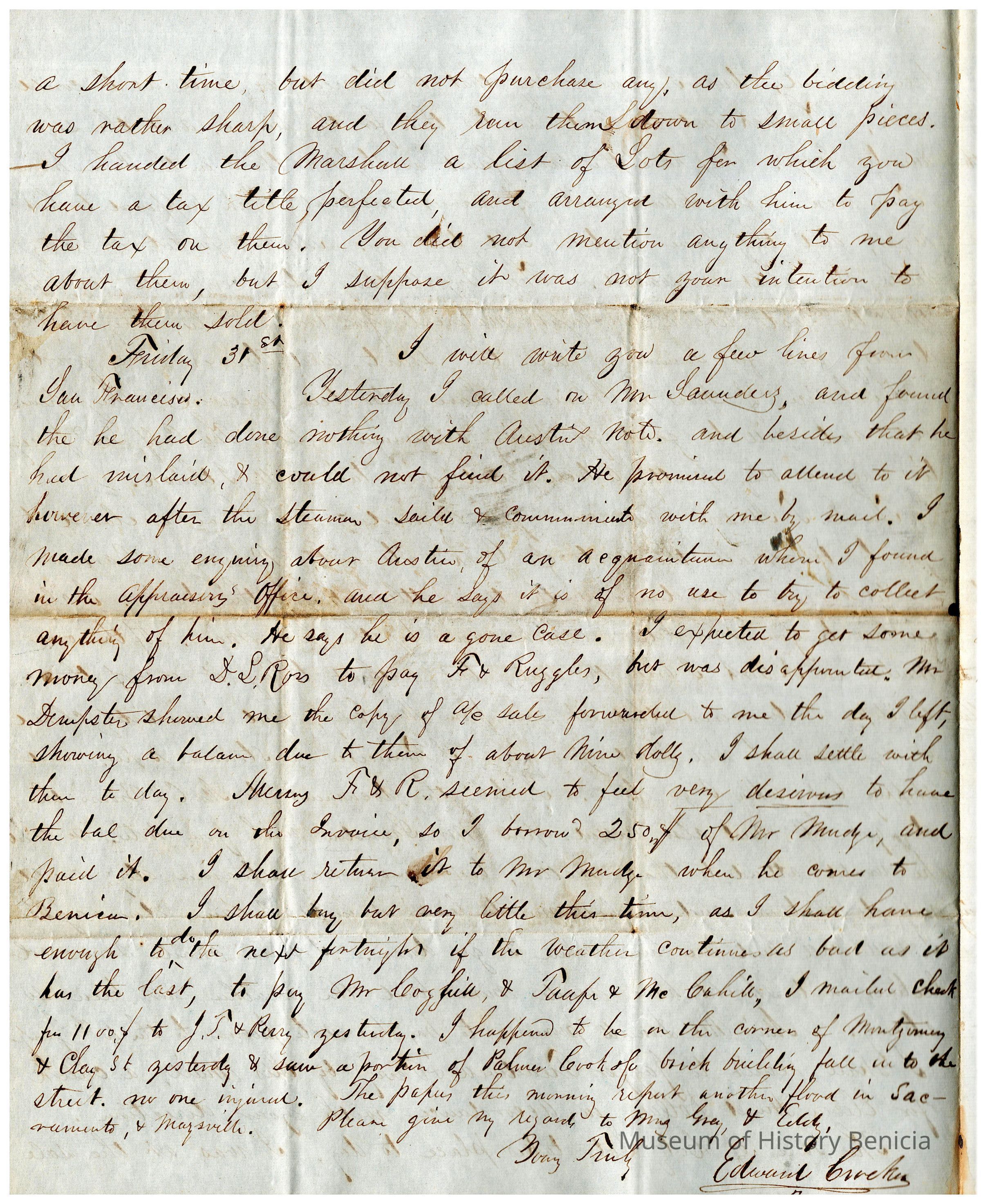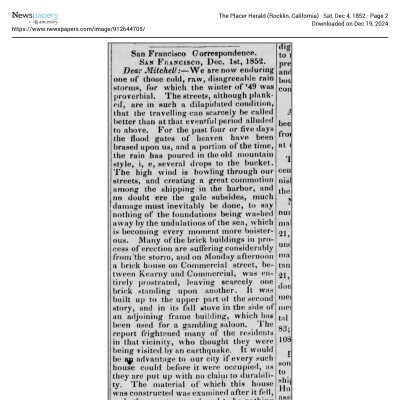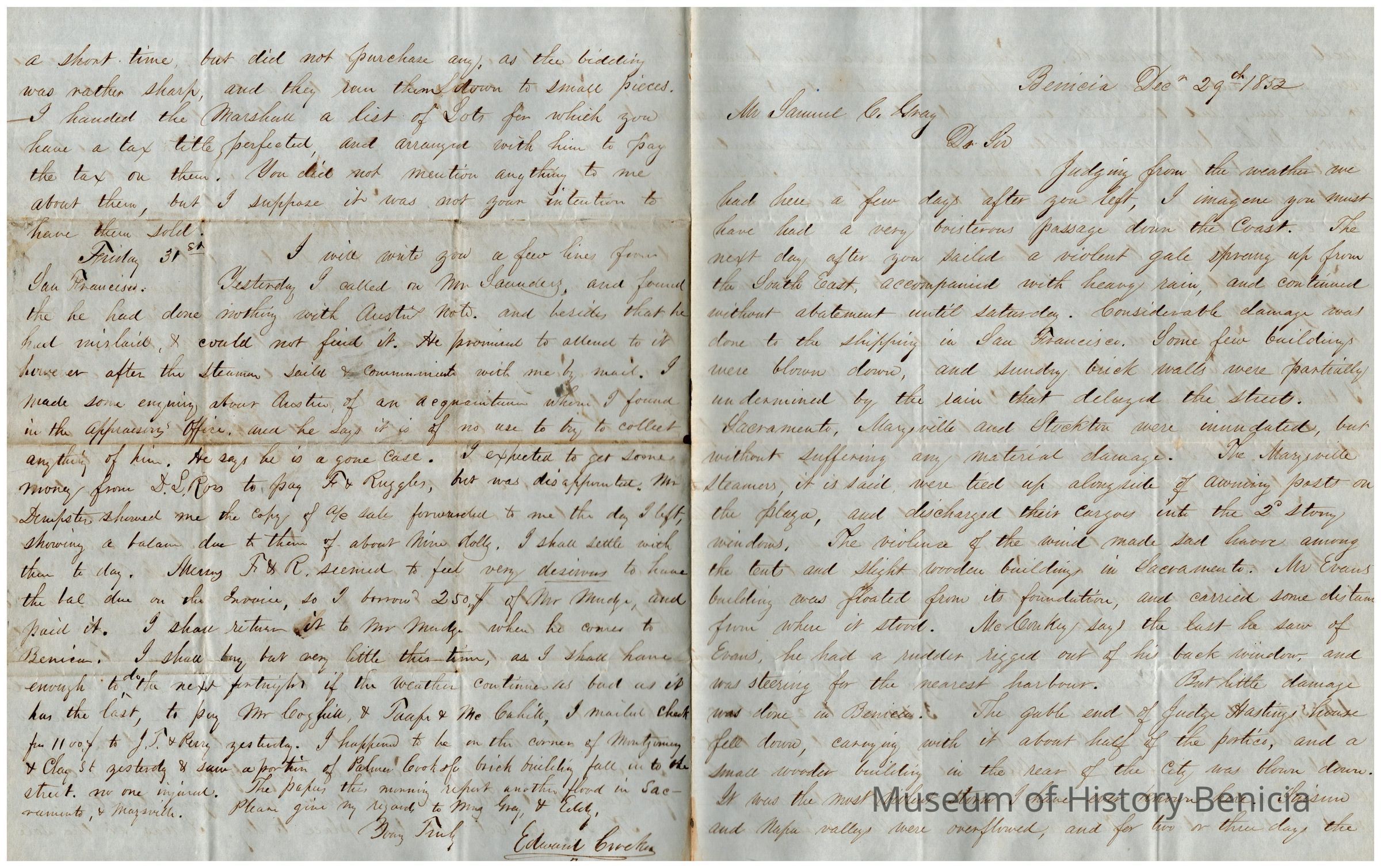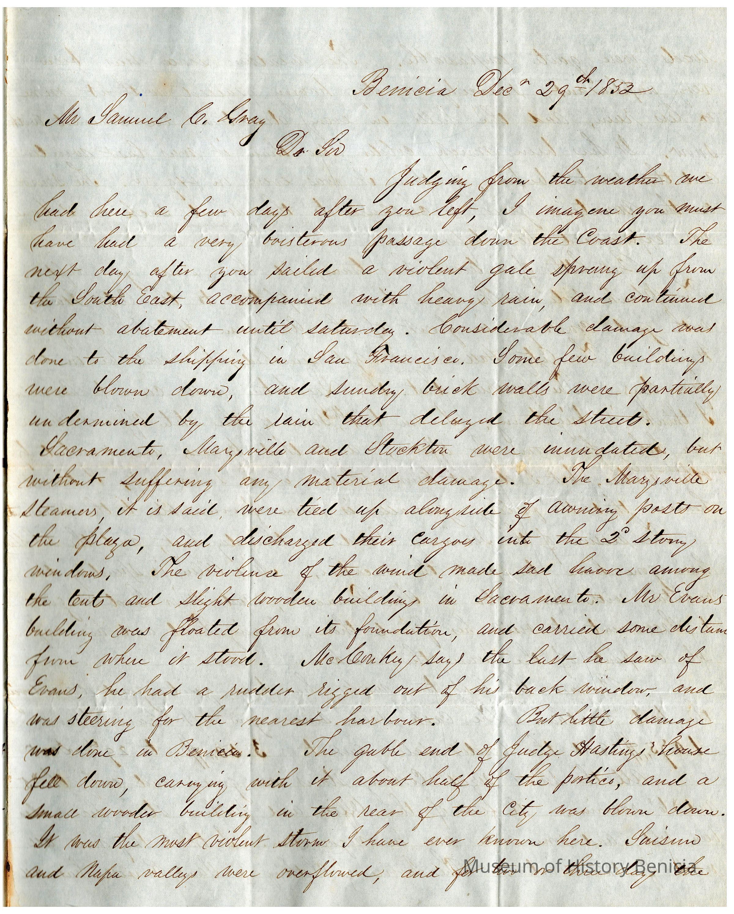 The image depicts a handwritten letter from Crocker to Gray, dated December 29, 1852, from Benicia. The letter discusses severe weather conditions and the aftermath of a significant storm which impacted San Francisco, referencing damage to buildings and vessels. Crocker vividly describes the storm's intensity, mentioning how some buildings were blown over, ships were tied up to avoid further damage, and debris was scattered. The detailed narrative highlights the challenges faced by the residents during the winter storm, marking it as one of the most severe events experienced in the area around that time.