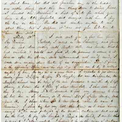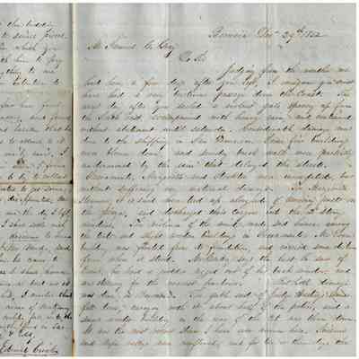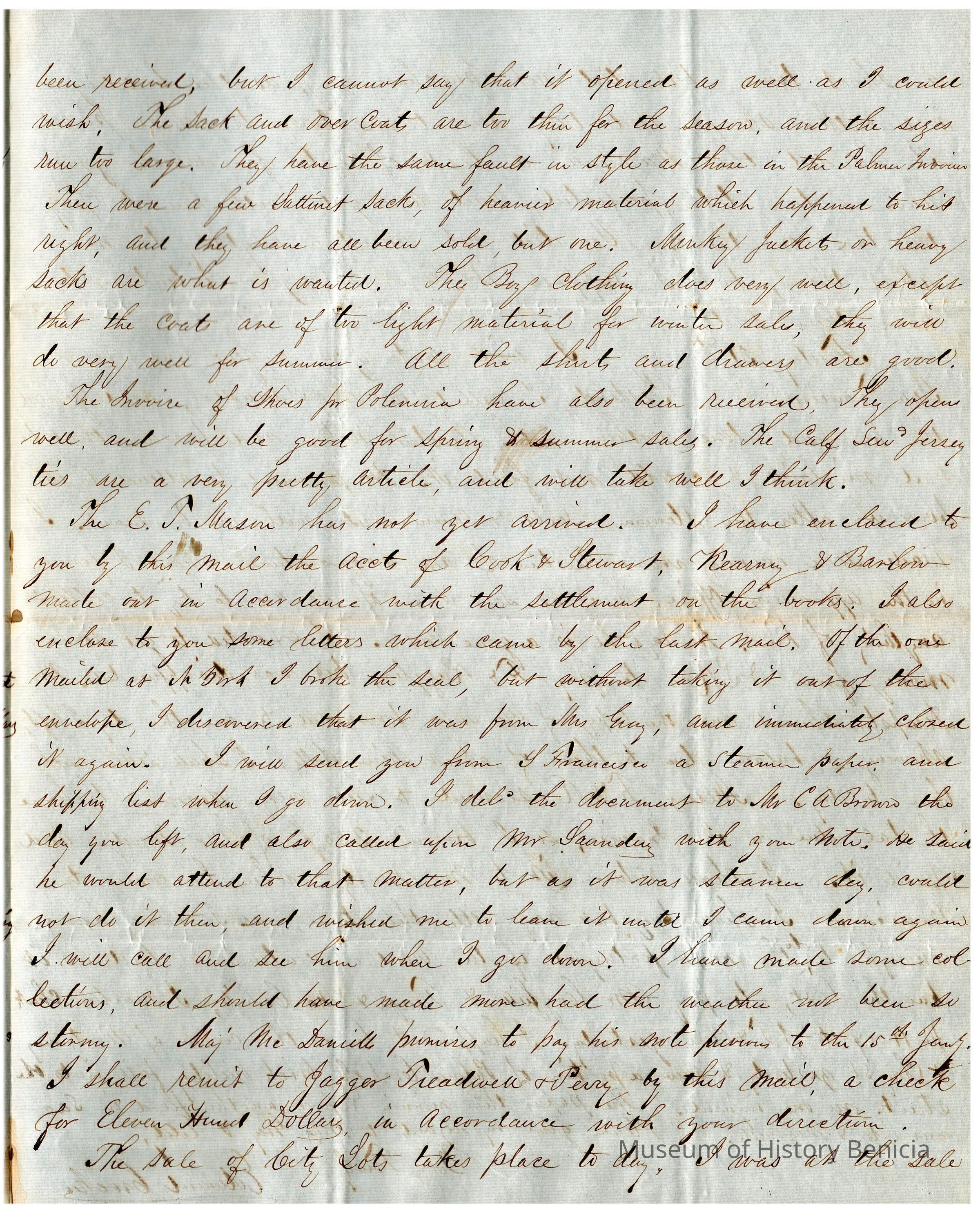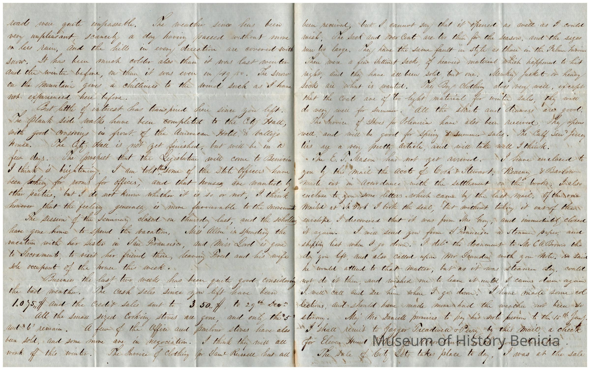 The image depicts a handwritten letter from Crocker to Gray, dated December 29, 1852, from Benicia. The letter discusses severe weather conditions and the aftermath of a significant storm which impacted San Francisco, referencing damage to buildings and vessels. Crocker vividly describes the storm's intensity, mentioning how some buildings were blown over, ships were tied up to avoid further damage, and debris was scattered. The detailed narrative highlights the challenges faced by the residents during the winter storm, marking it as one of the most severe events experienced in the area around that time.