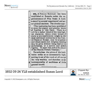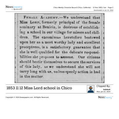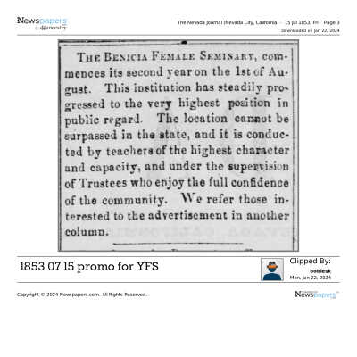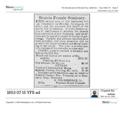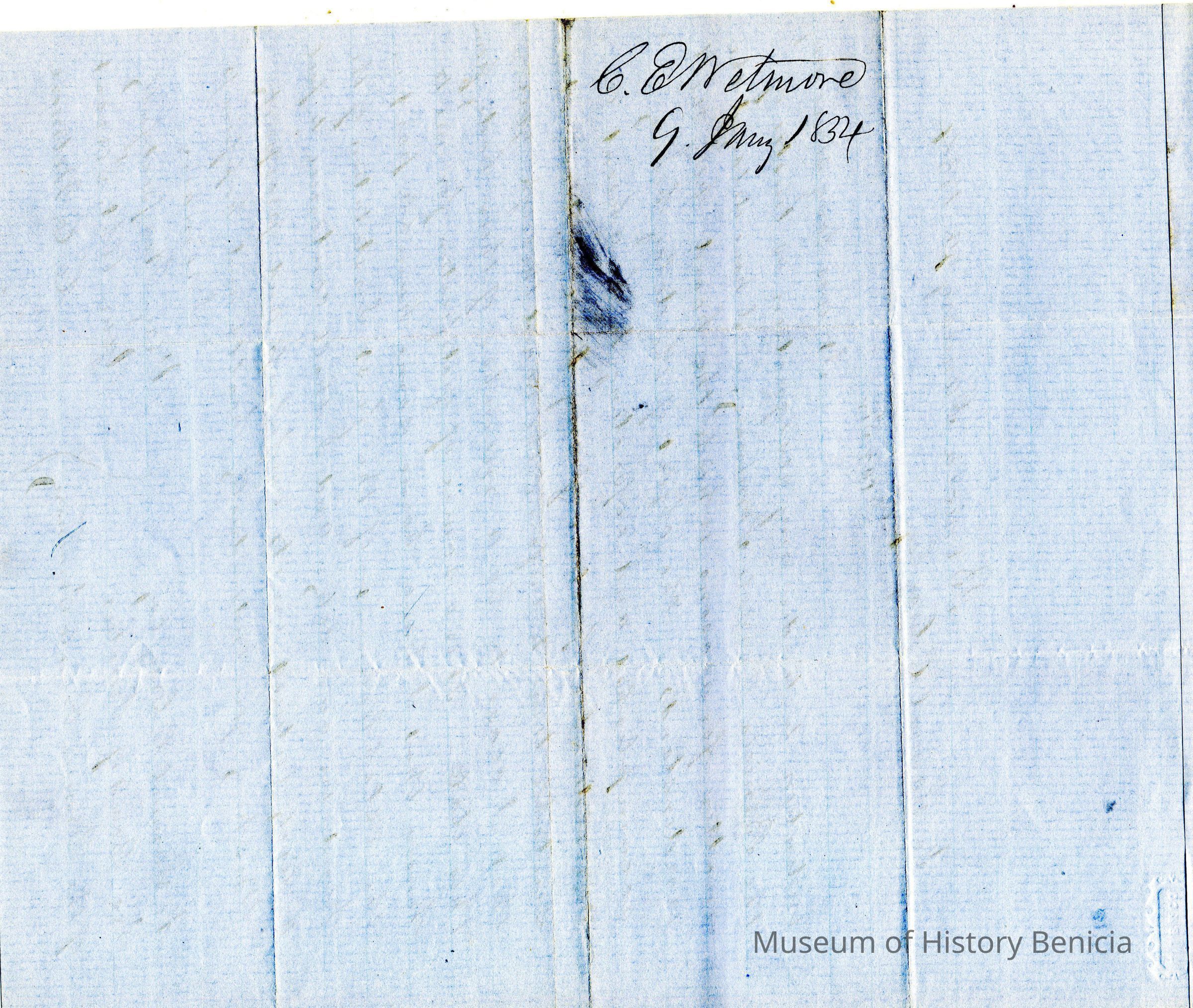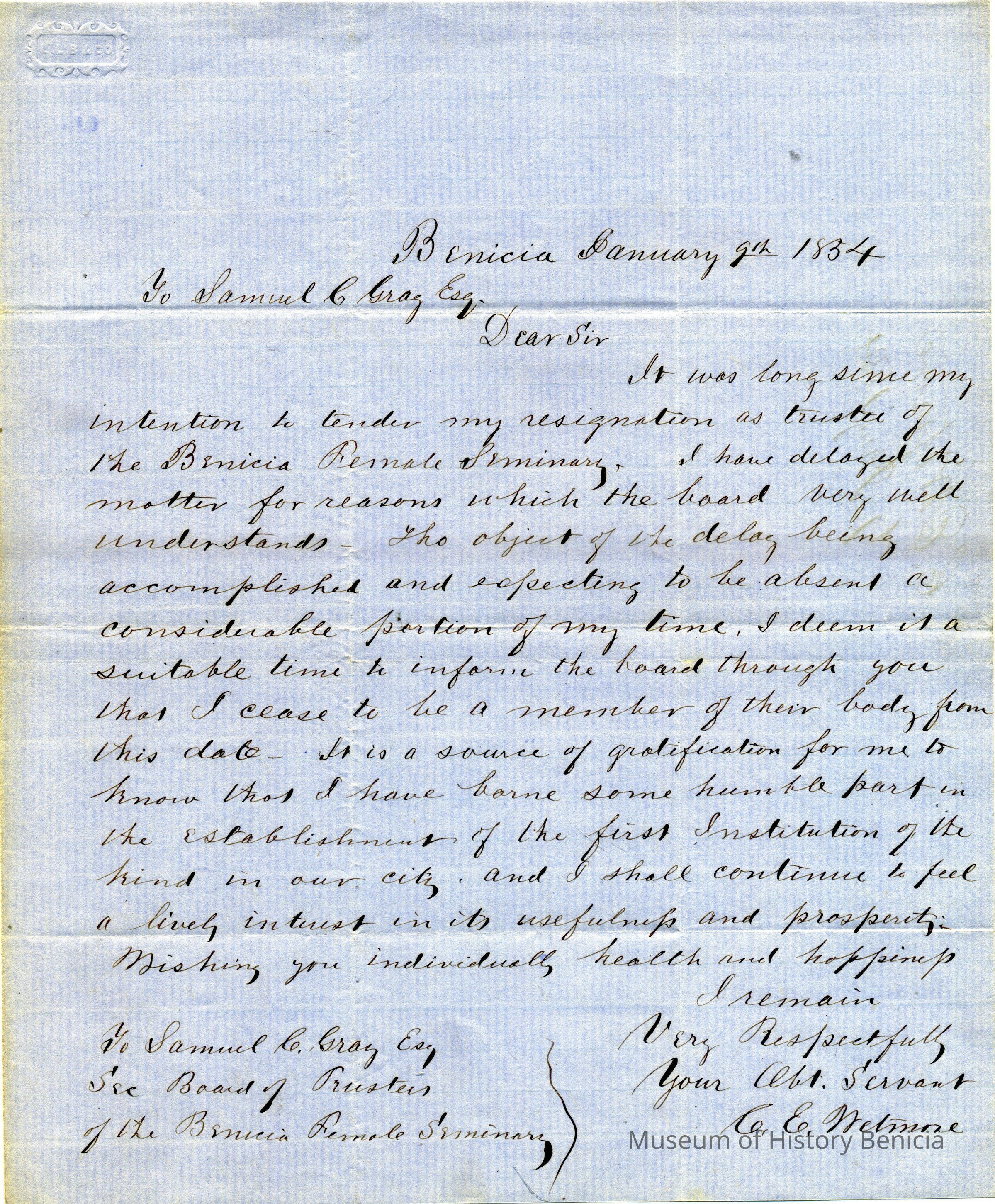 This is a letter to Samuel Gray from Chauncey Wetmore in Benicia dated 01/09/1854. Mr. Wetmore is tendering his resignation from the Board of the Benicia Female Seminary (Young Ladies Seminary). Mr. Wetmore and Samuel Gray along with other prominent Benicians started the Benicia Female Seminary in 1852.Collection