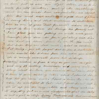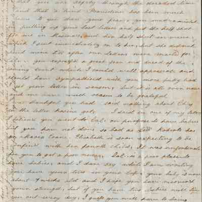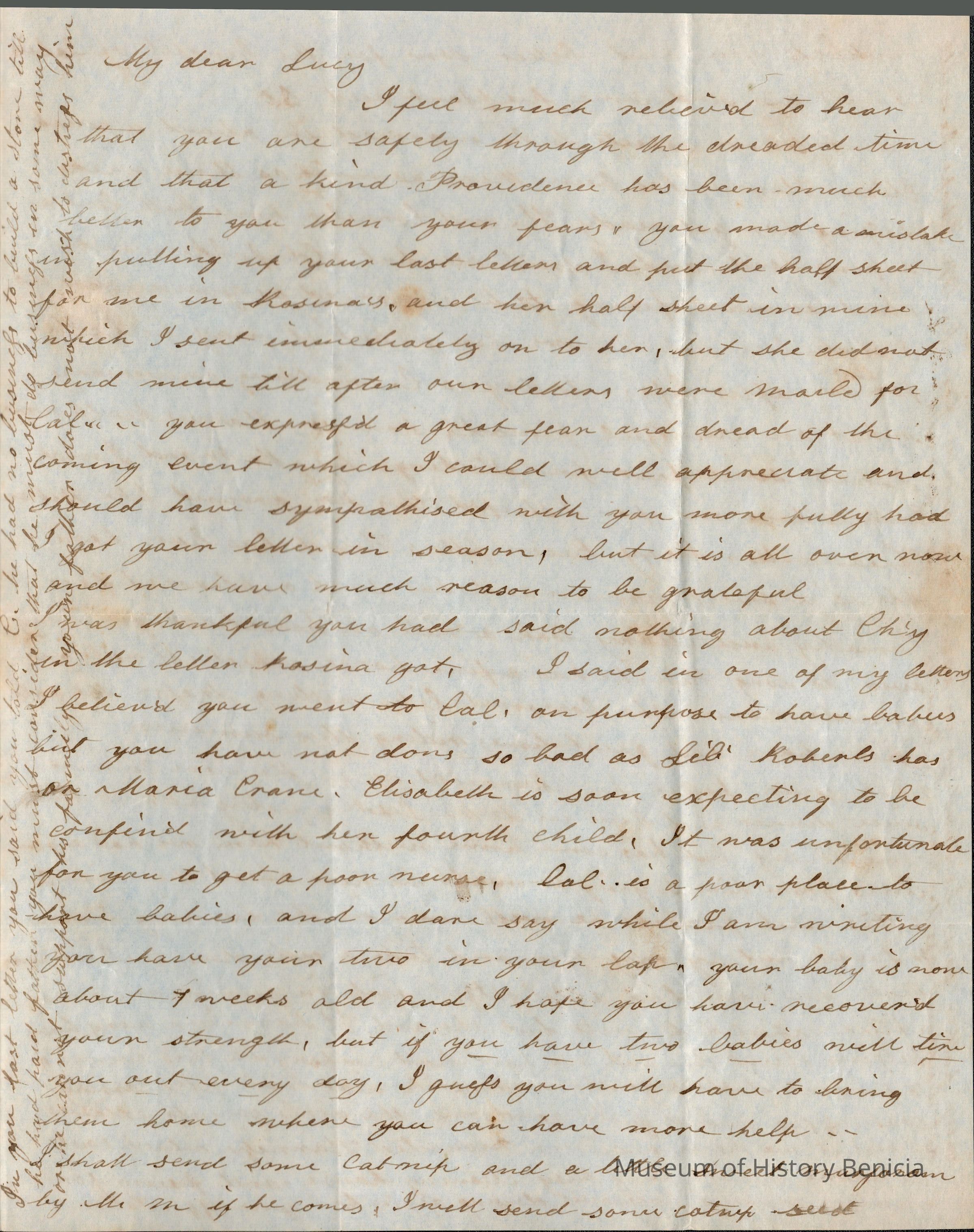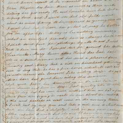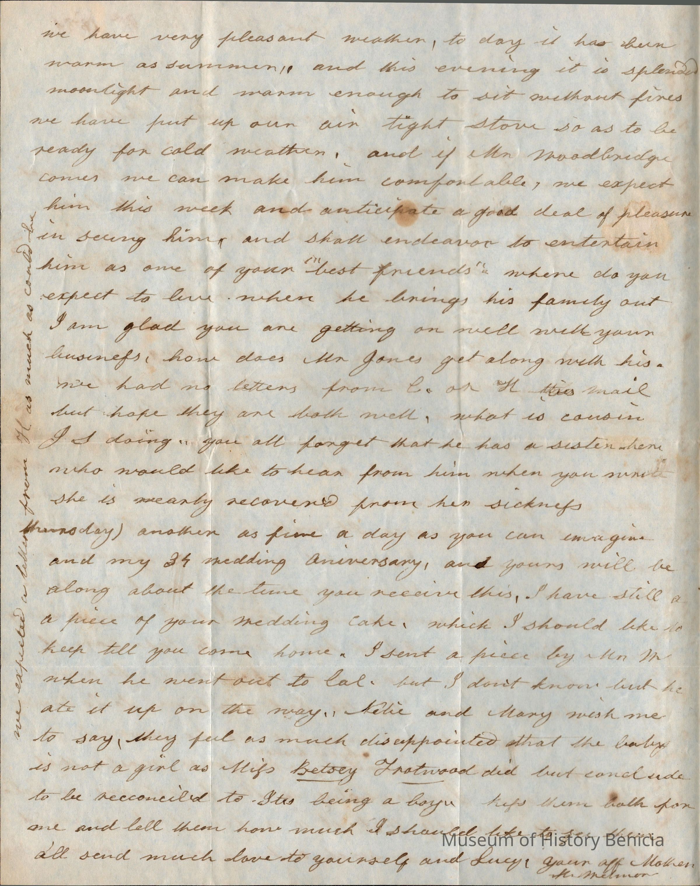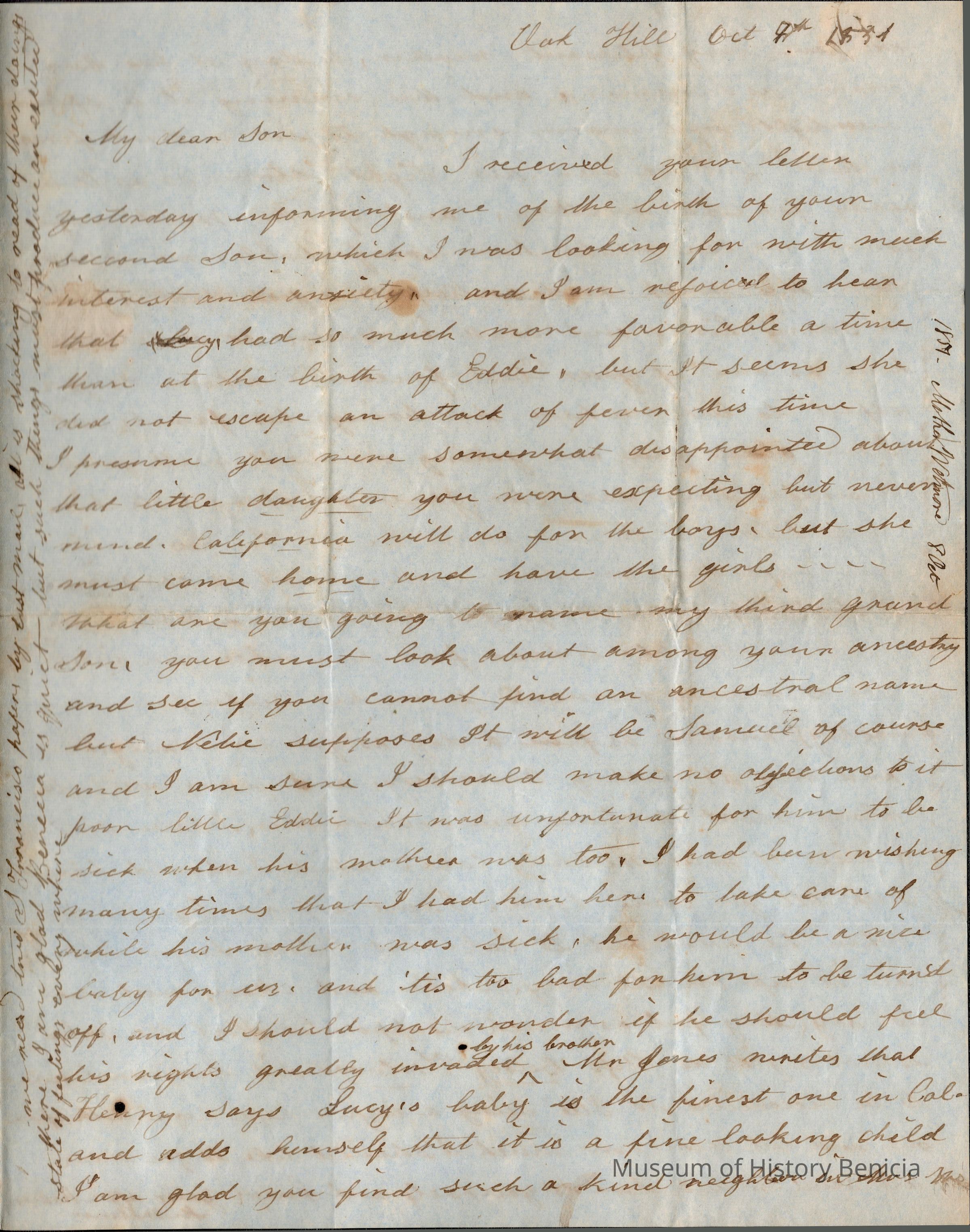 This is a letter dated 10/07/1854 from Mother Rebecca Hubbard Wetmore to Lucy and Samuel Gray regarding family matters. She congratulates both of them on the birth of their second son, Samuel Arthur Gray (11/24/1853 * 1921). (In her previous letter she mentioned the loss of their son Franklin: 08/20/1851 - 01/16/1852.) She writes to Lucy about taking care of herself with two children to raise and says she will send some "catnip".
