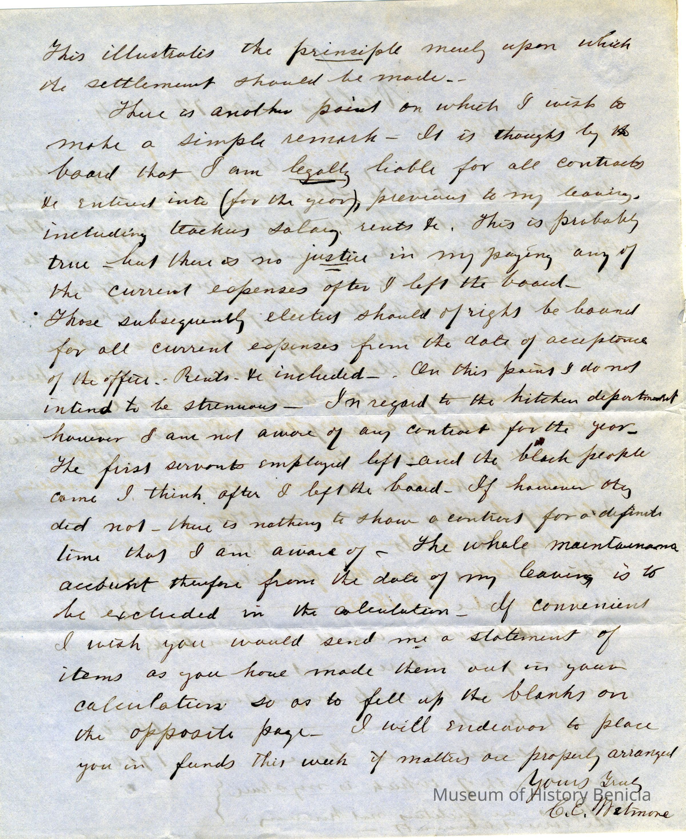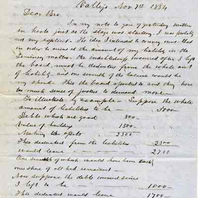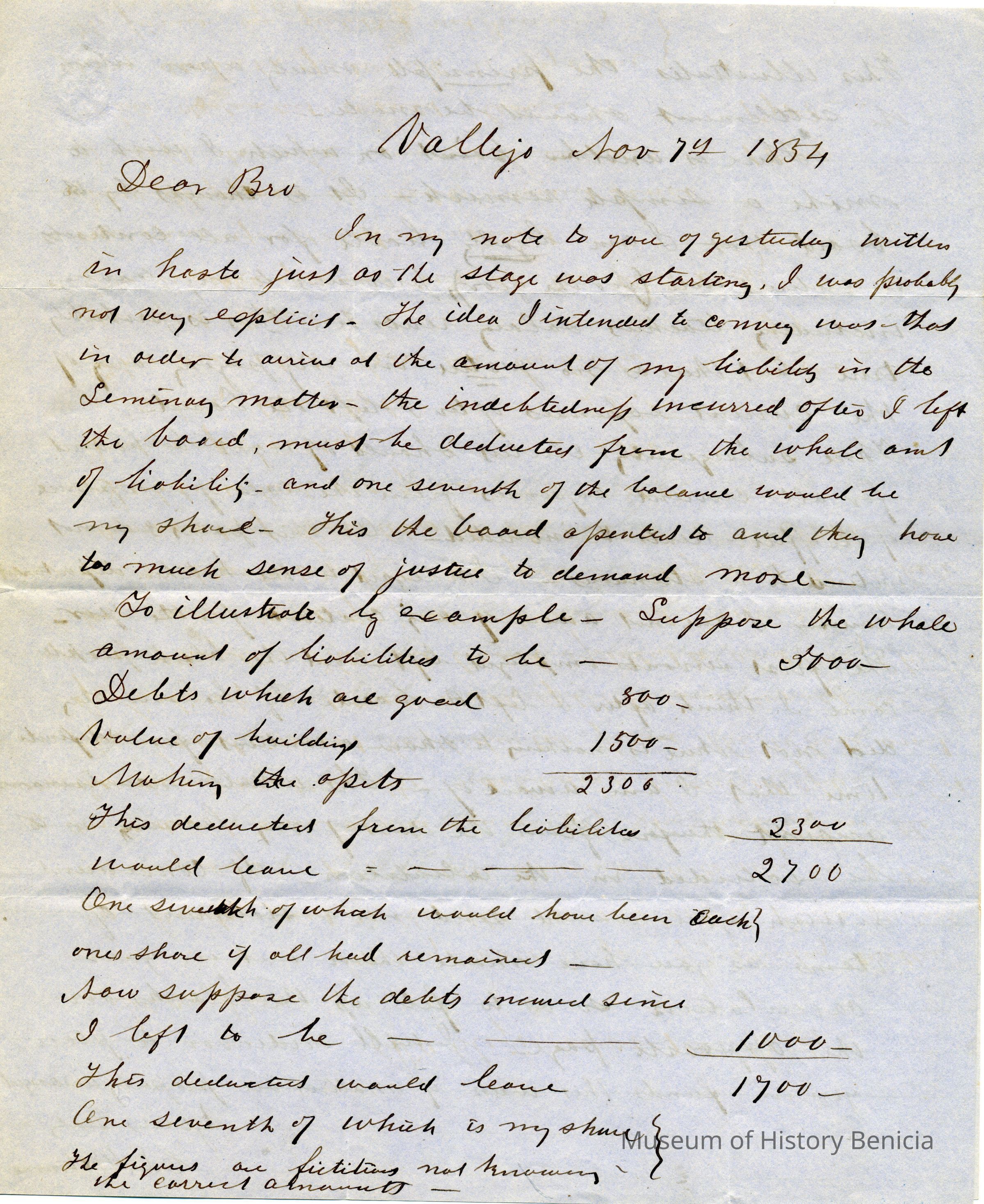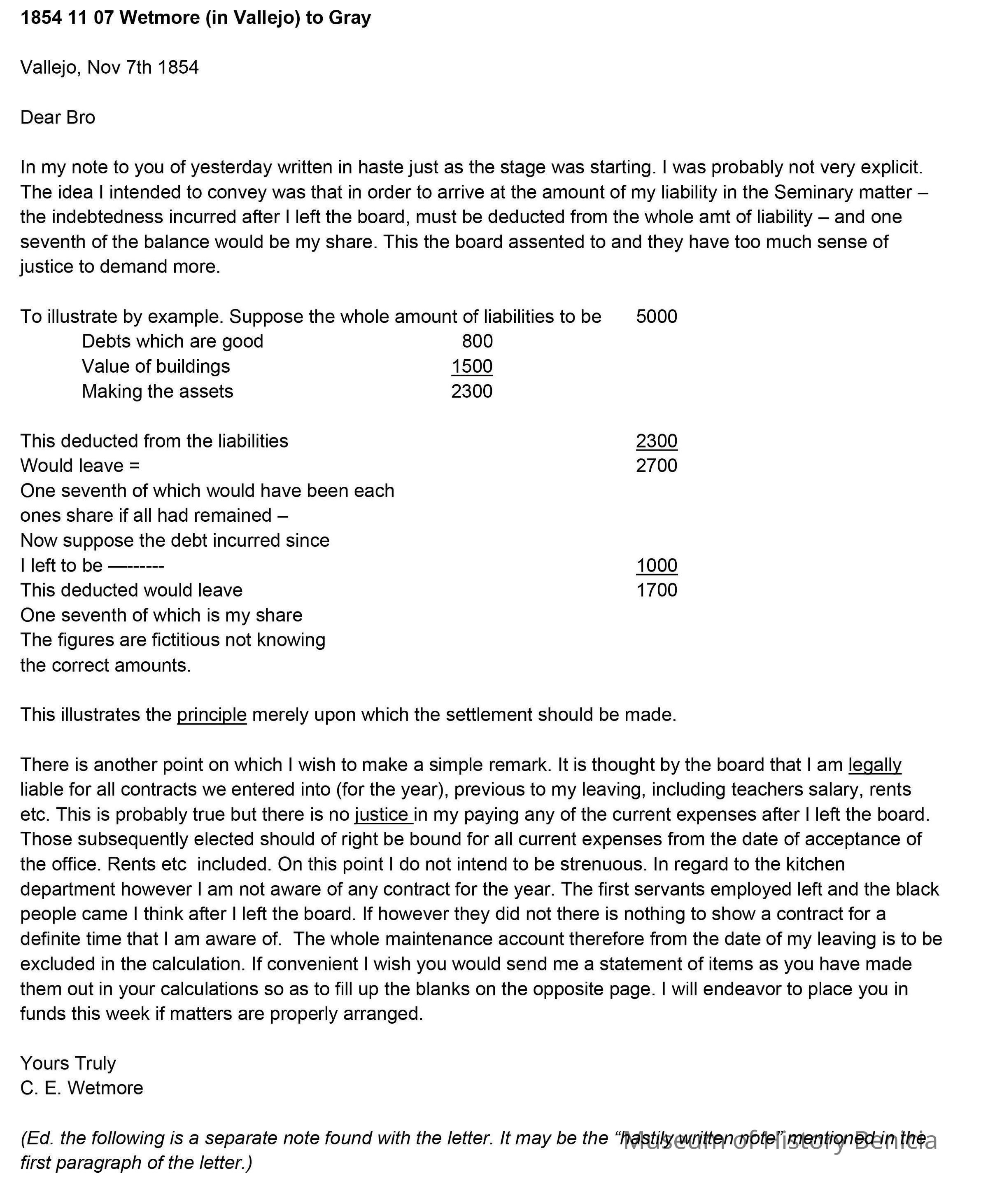 This is a letter to Samuel Gray from Chauncey Wetmore in Benicia dated 11/07/1854. This is a follow-up letter to his one from 11/06 and gives more details about how his share of the Seminary debt should be calculated.
