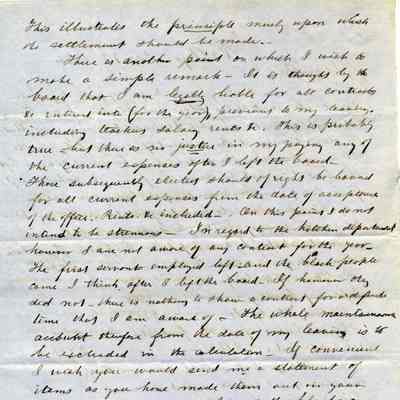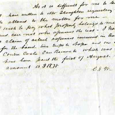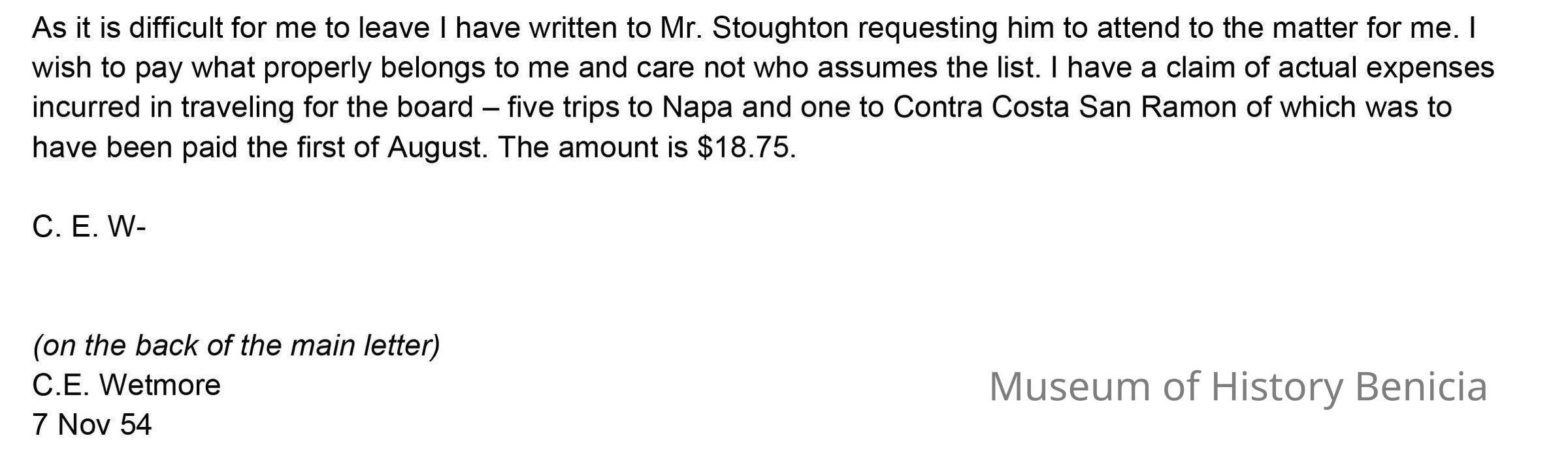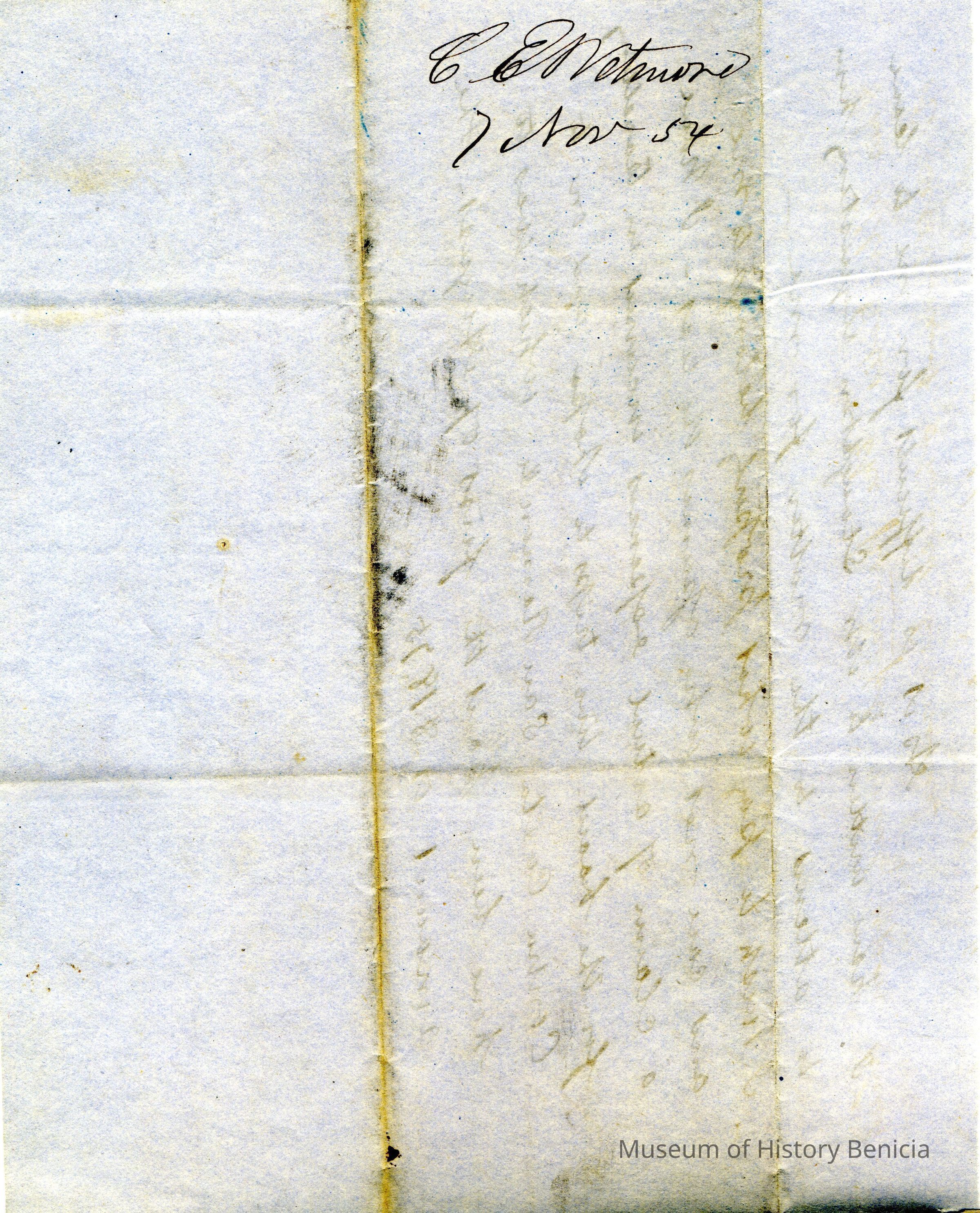 This is a letter to Samuel Gray from Chauncey Wetmore in Benicia dated 11/07/1854. This is a follow-up letter to his one from 11/06 and gives more details about how his share of the Seminary debt should be calculated.