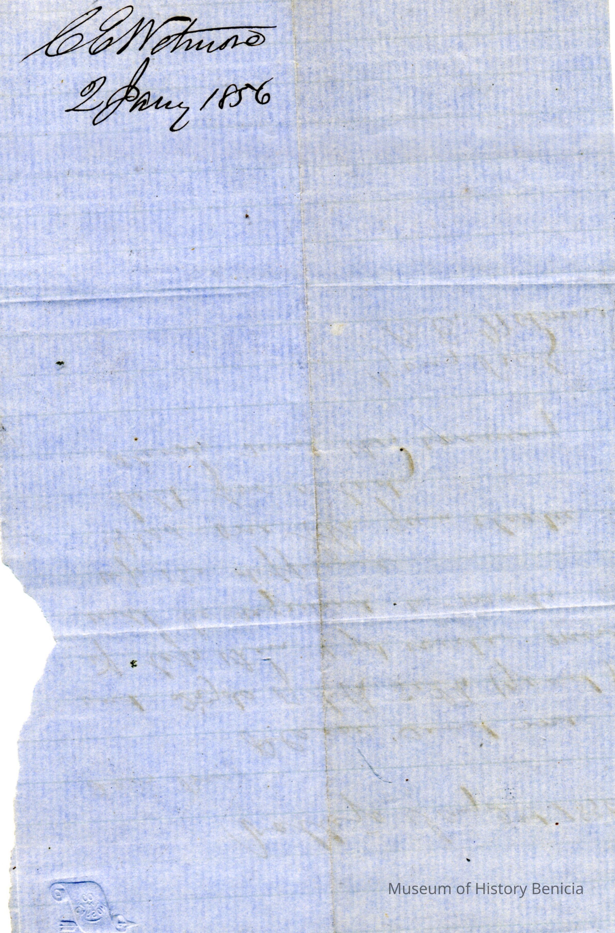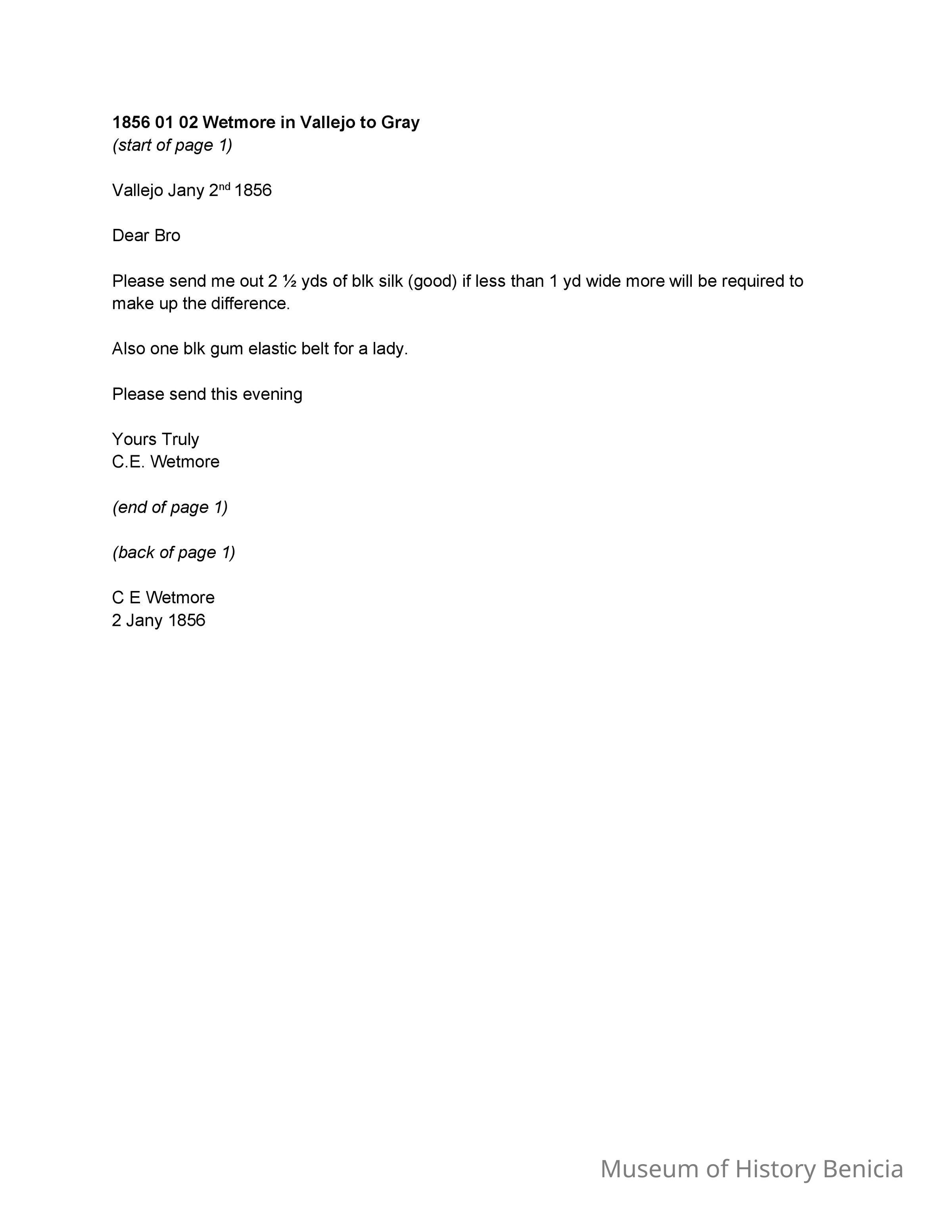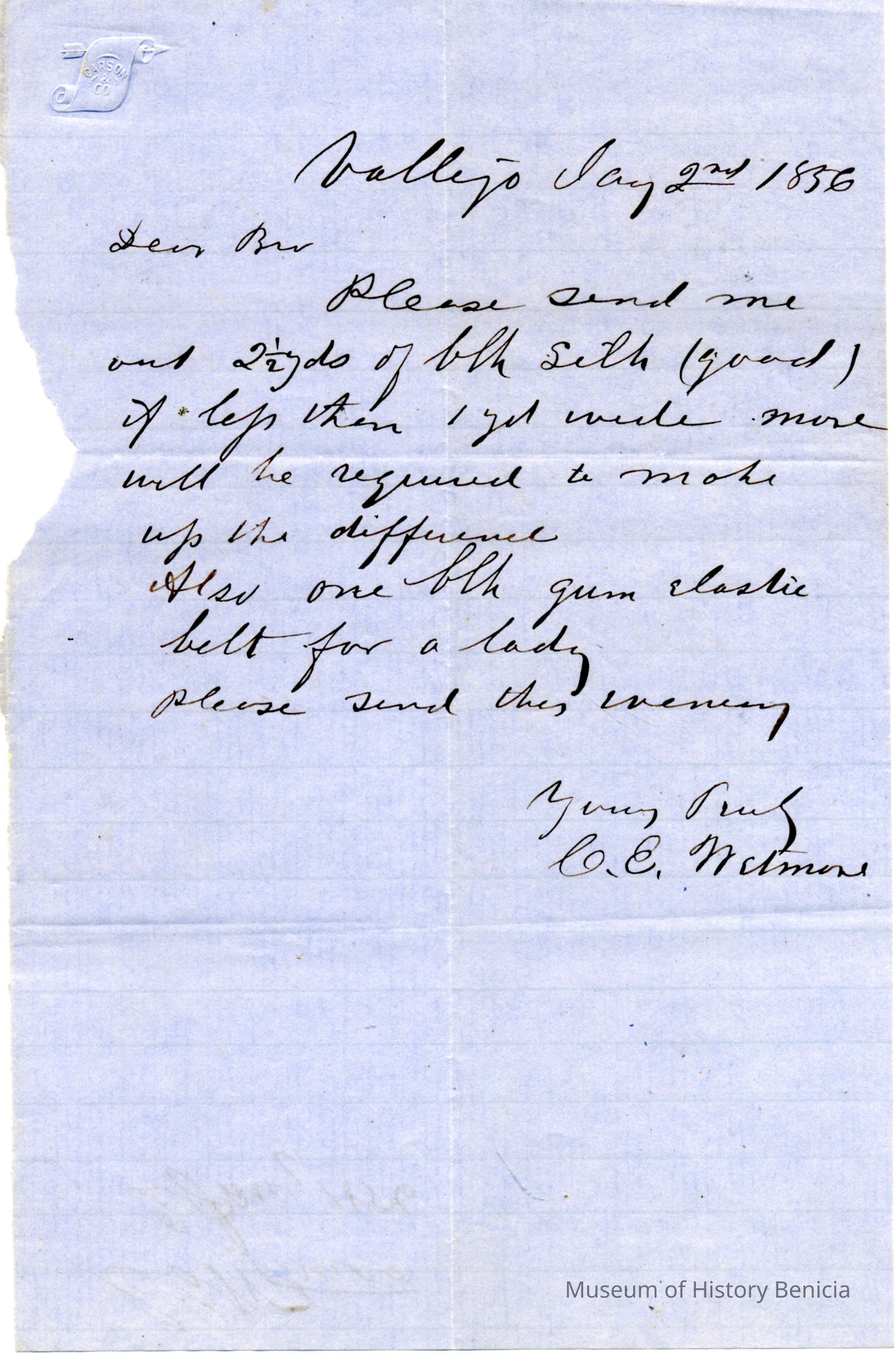 This is a letter from C.E. Wetmore in Vallejo to Samuel Gray in Benicia dated 01/02/1856. (This is after they dissolved their partnership.) The letter asks Mr. Gray to send Mr. Wetmore 2.5 yards of silk and a black gum elastic woman's belt.Collection