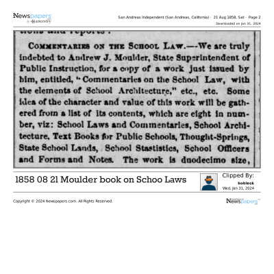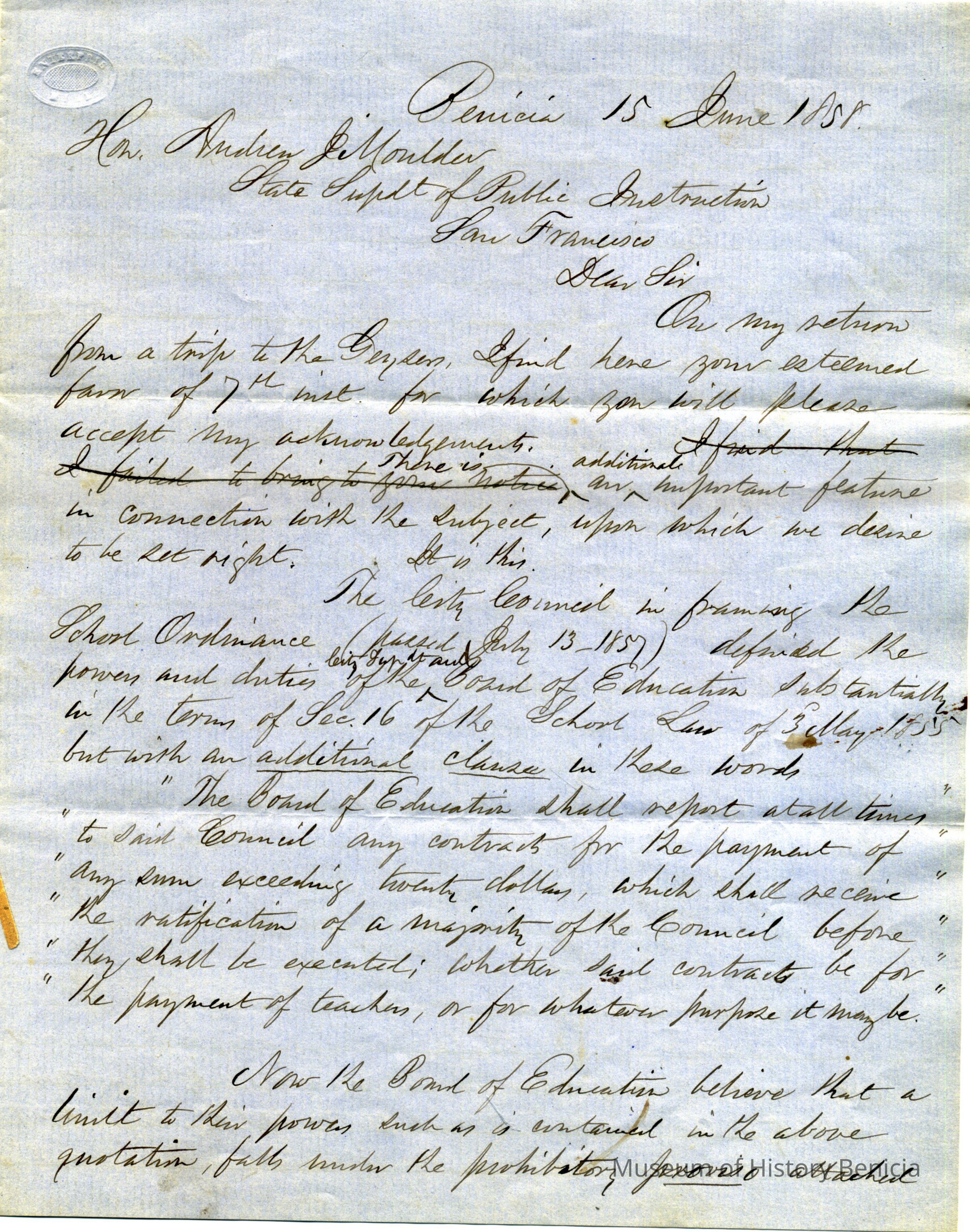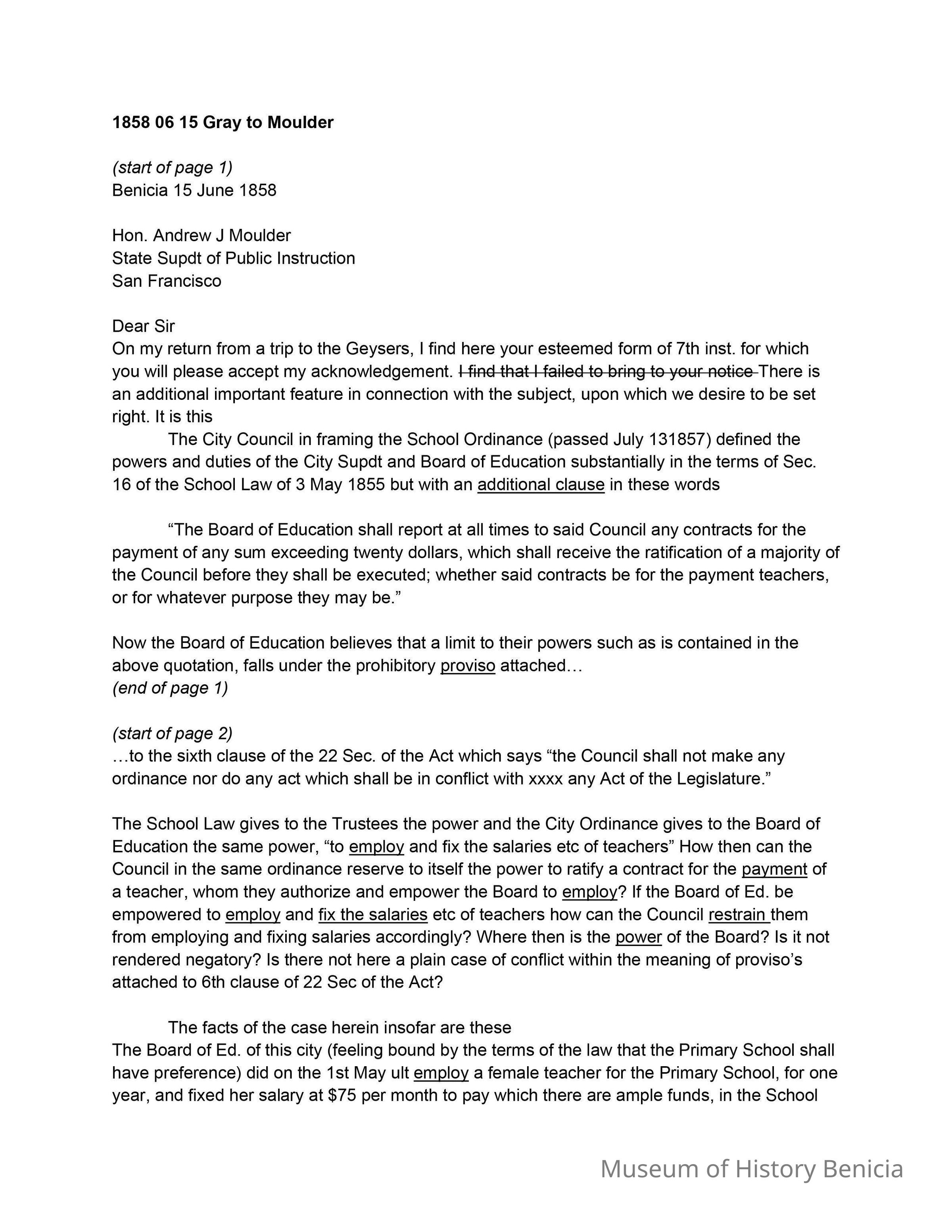 The image displays a draft letter dated June 15, 1858, from Samuel Gray to Honorable Andrew J. Moulder, the State Superintendent of Public Instruction in San Francisco. Gray discusses issues related to school policy, specifically regarding the powers and duties of the City Superintendent and the Board of Education as defined by a School Ordinance from July 1857. He notes an additional clause related to contract approvals by the City Council and raises concerns about potential conflicts with the existing School Law and City Ordinance, particularly about the employment and salary determination of teachers. Furthermore, he details a specific case regarding the hiring of a female teacher at a fixed salary.