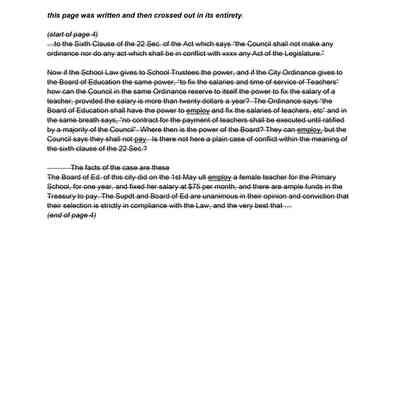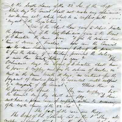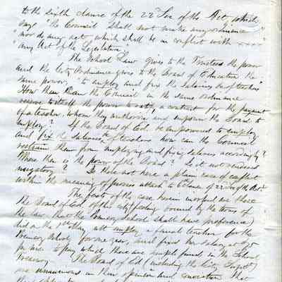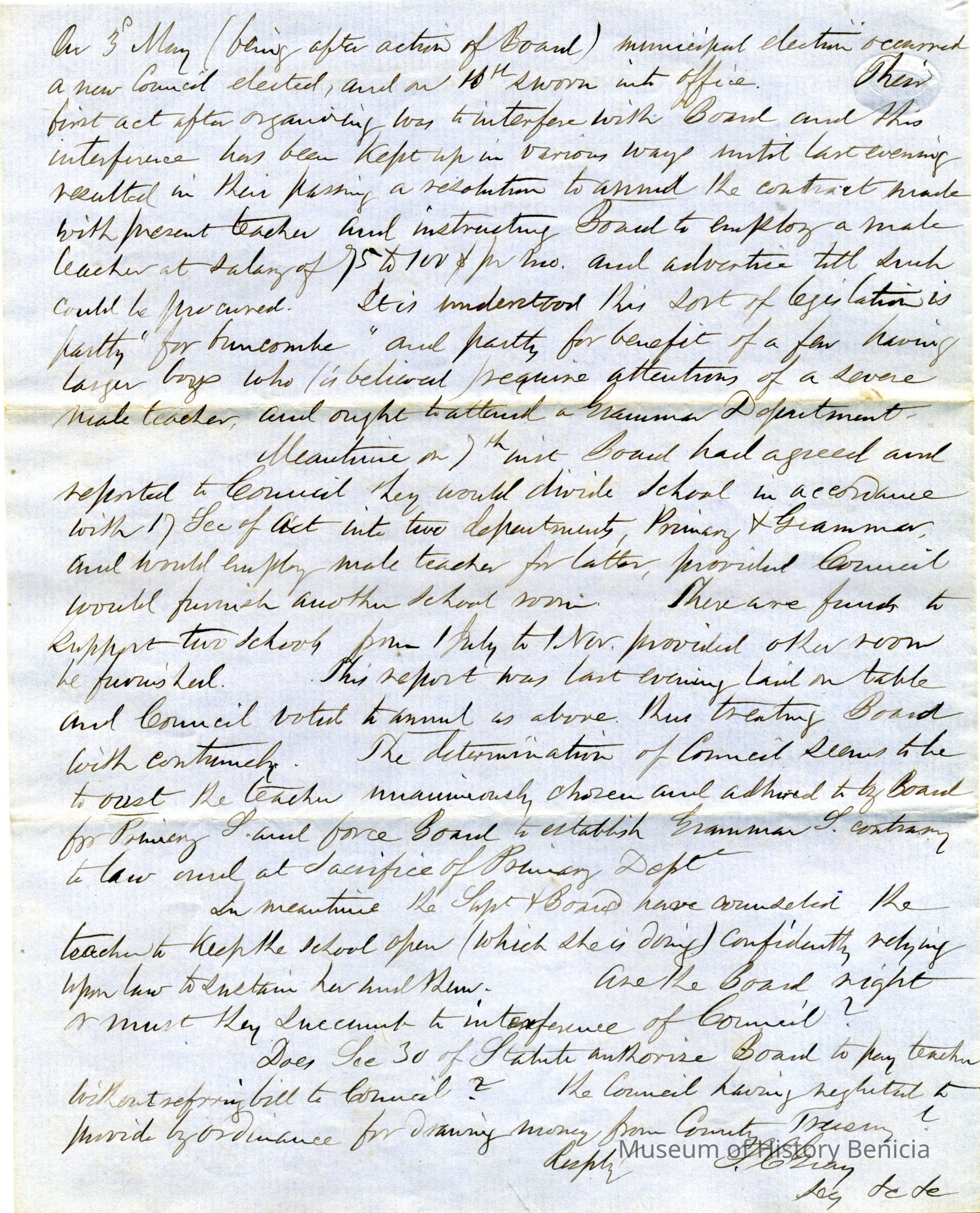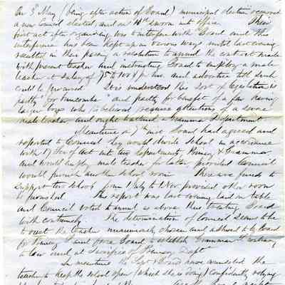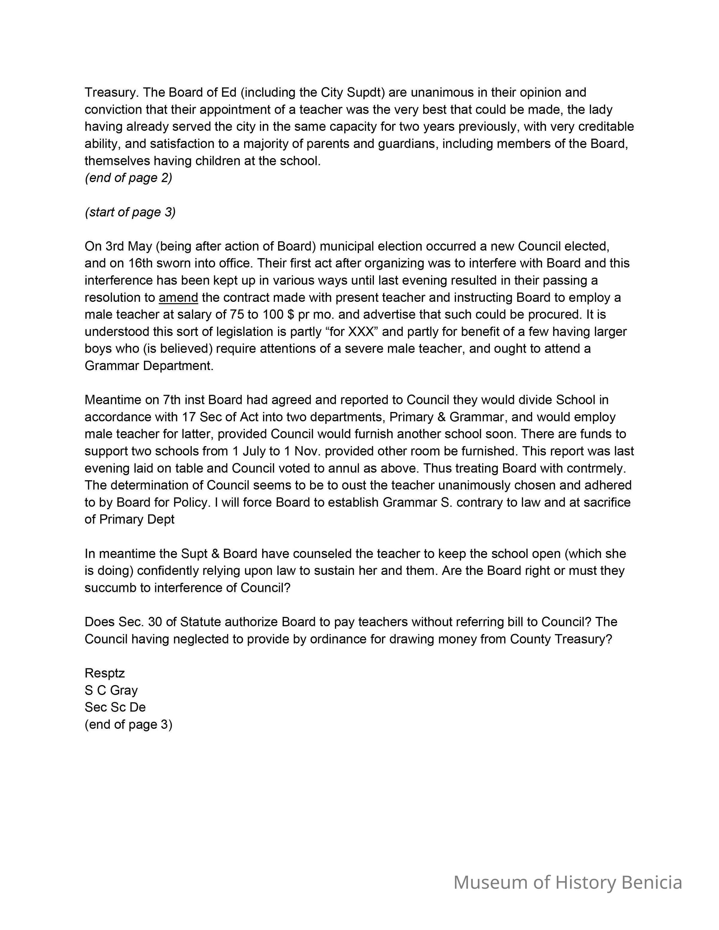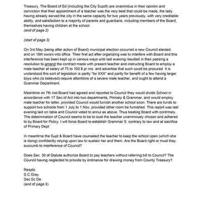 On the third page of the letter he discusses a conflict between a Board of Education and a newly elected Council following a municipal election on May 3rd. The Council attempted to modify an existing contract with a teacher, advocating for hiring a male teacher and rearranging school departments. The writer, Samuel Gray, is questioning whether the Board should adhere to the Council’s decisions, especially regarding financial responsibilities outlined in the statute. The letter concludes with the writer’s initials and titles, indicating urgency and concern about the situation.Collection