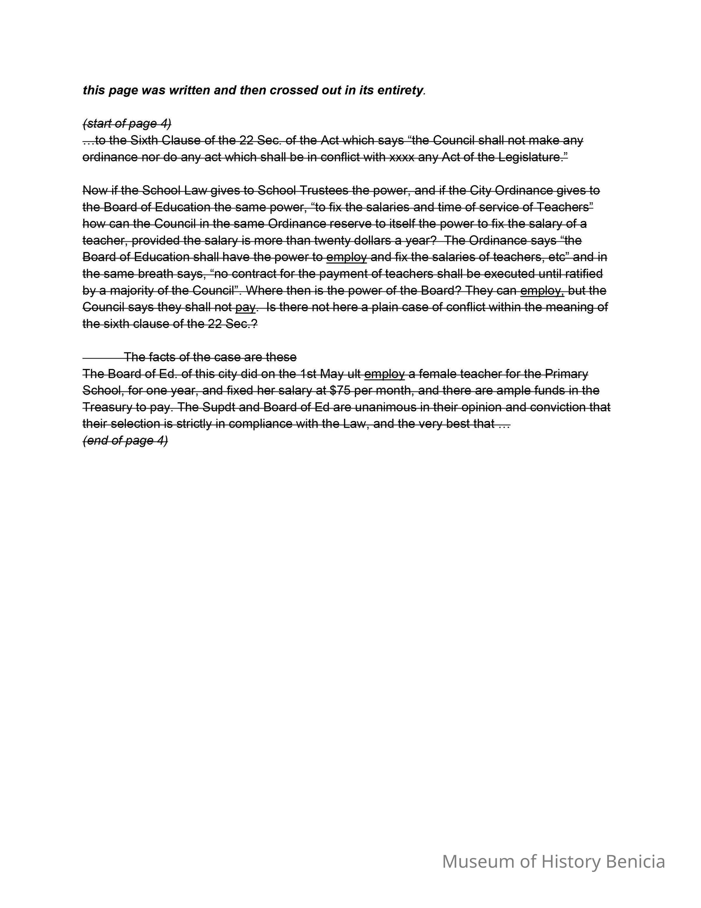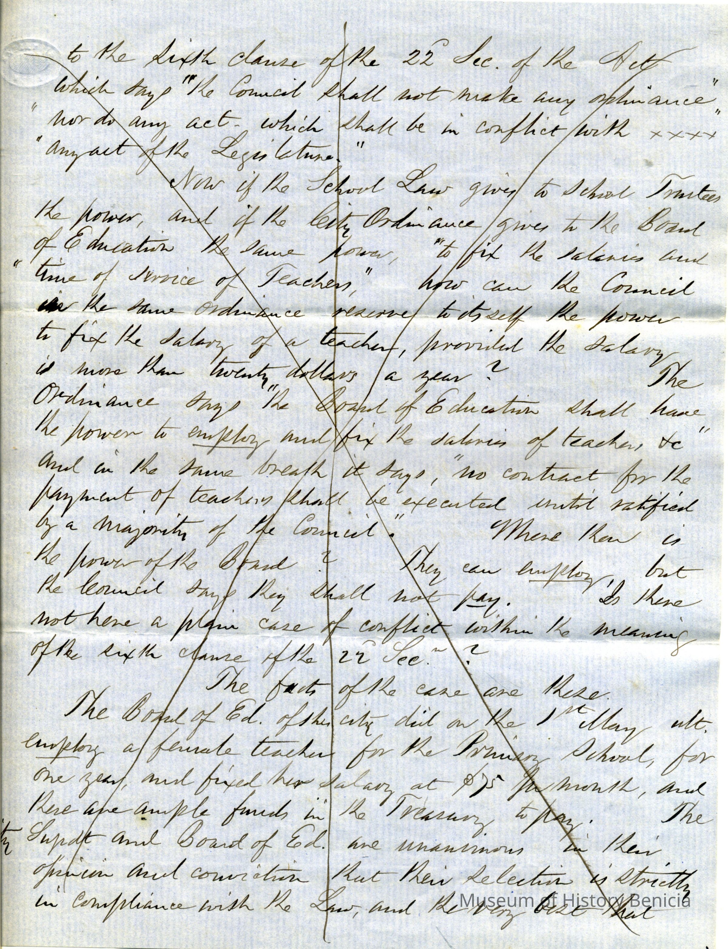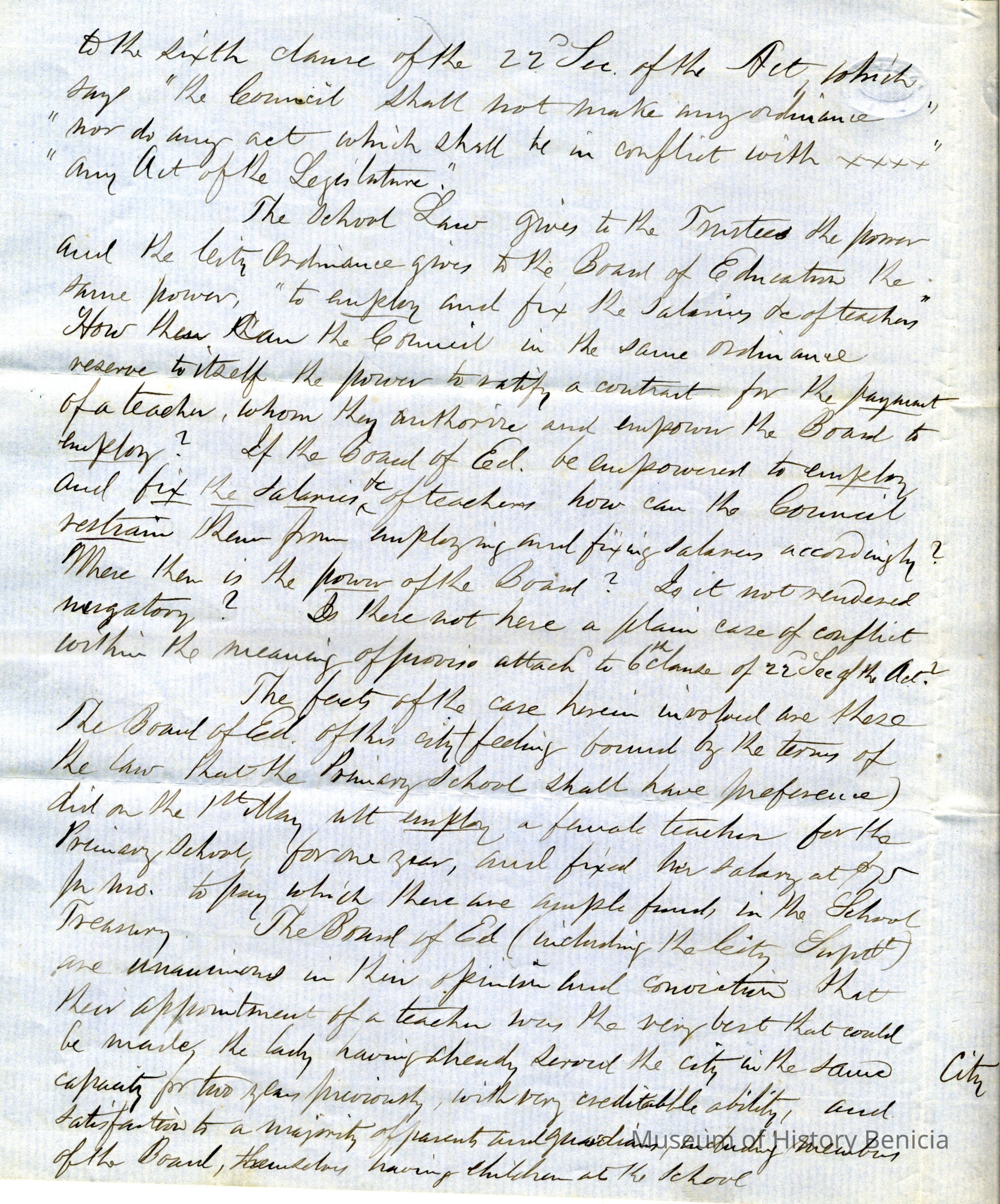 On the third page of the letter he discusses a conflict between a Board of Education and a newly elected Council following a municipal election on May 3rd. The Council attempted to modify an existing contract with a teacher, advocating for hiring a male teacher and rearranging school departments. The writer, Samuel Gray, is questioning whether the Board should adhere to the Council’s decisions, especially regarding financial responsibilities outlined in the statute. The letter concludes with the writer’s initials and titles, indicating urgency and concern about the situation.Collection