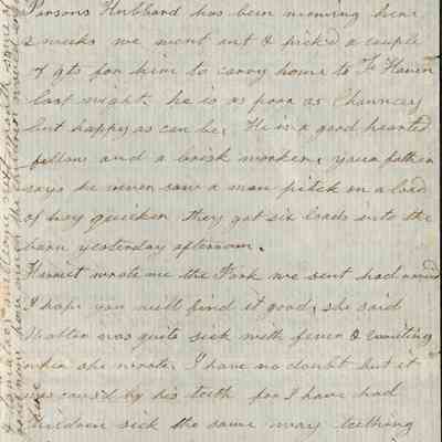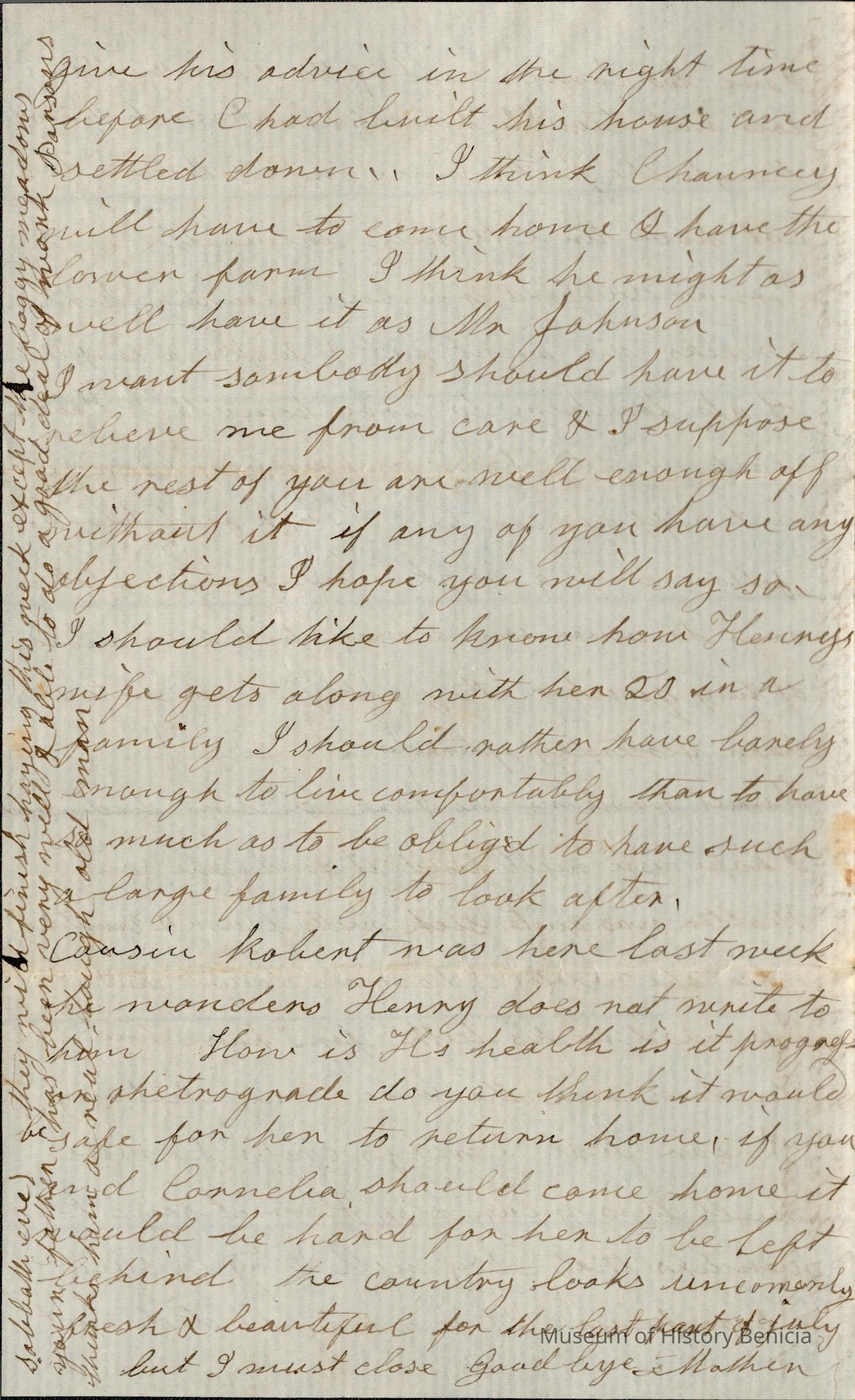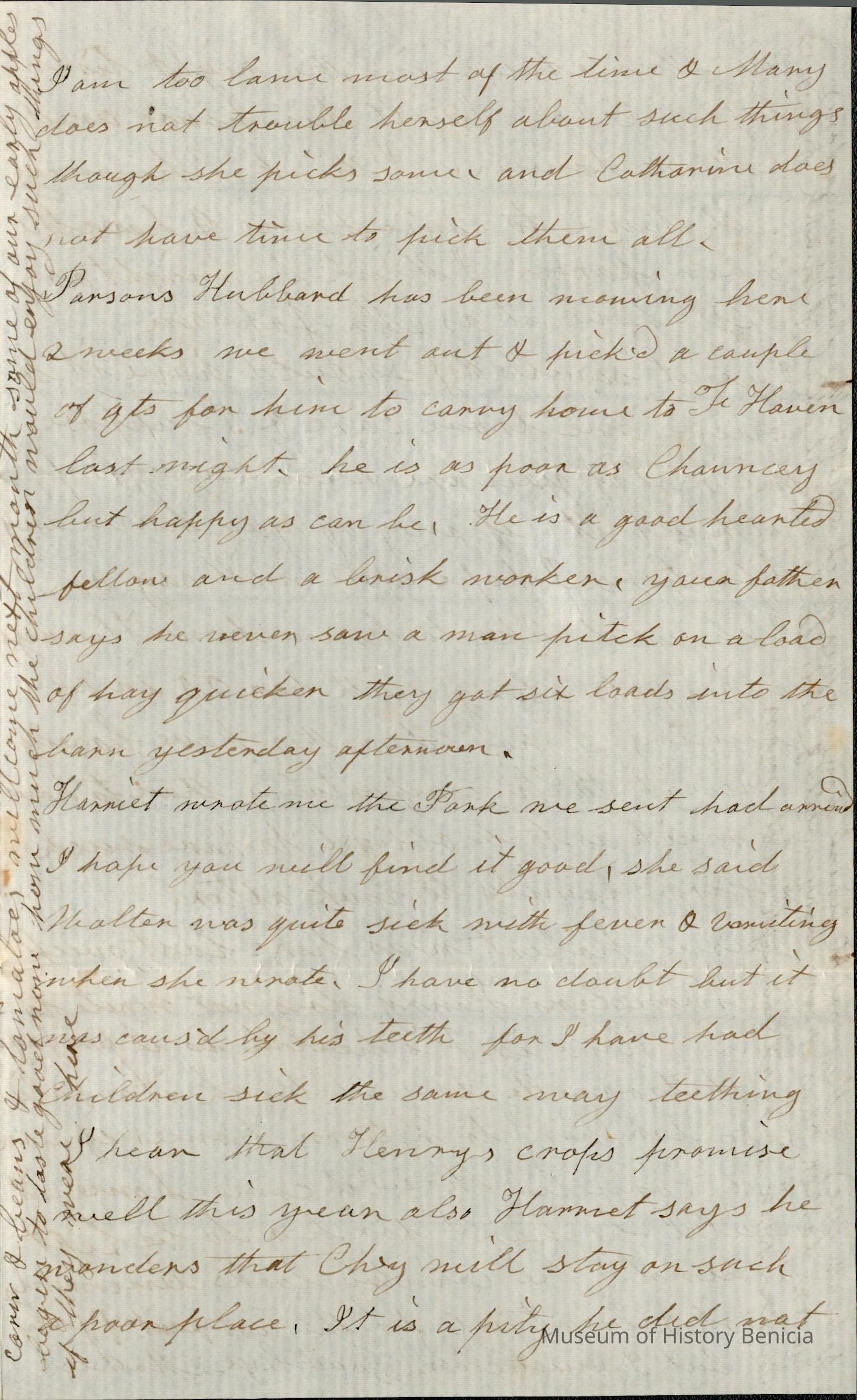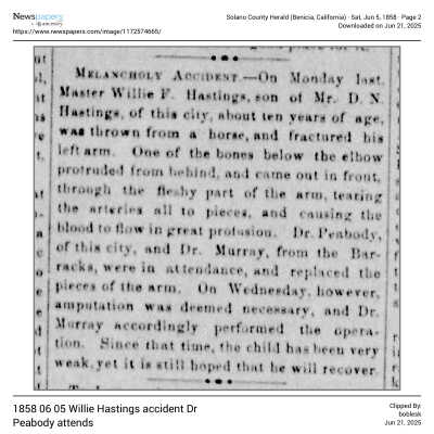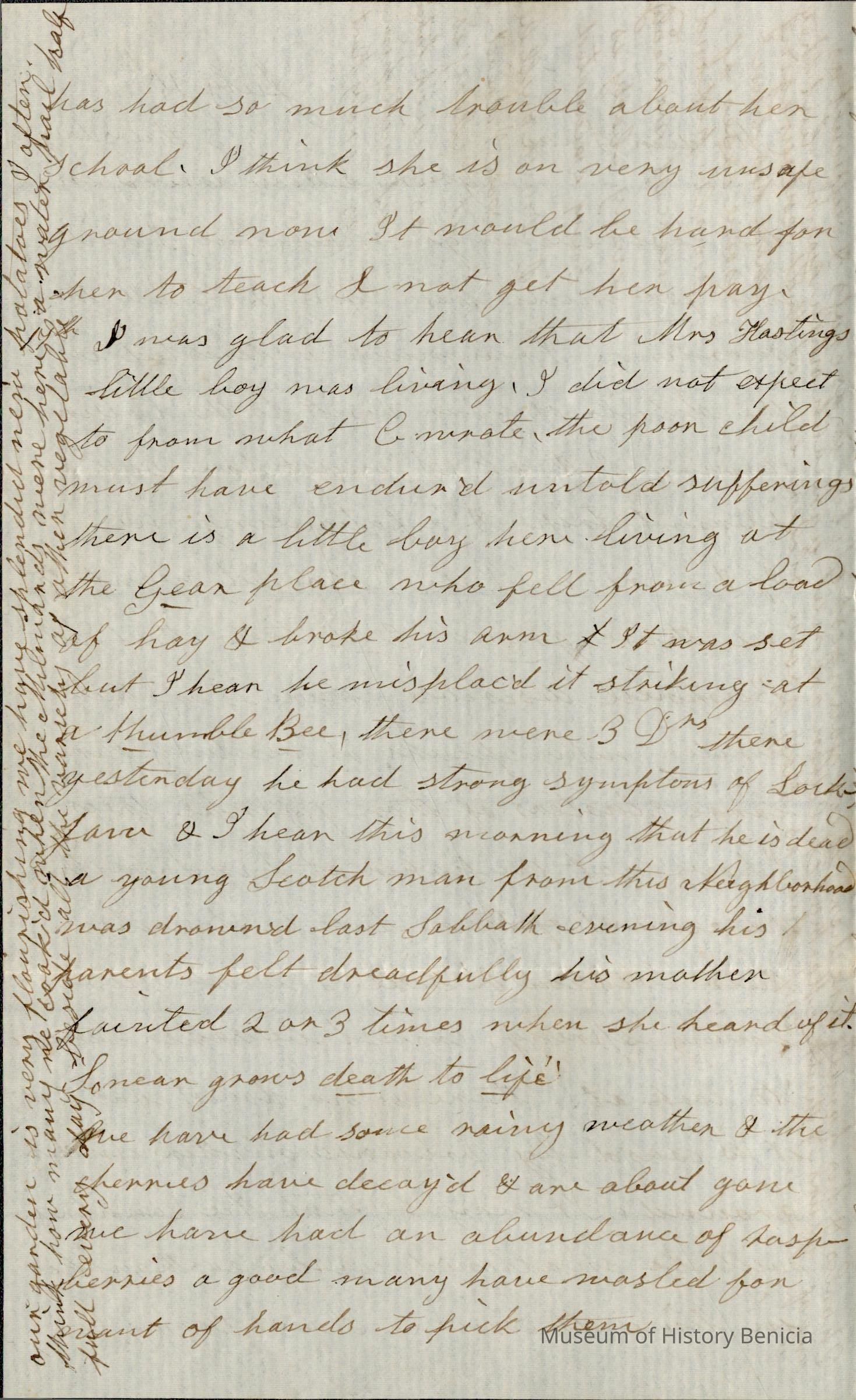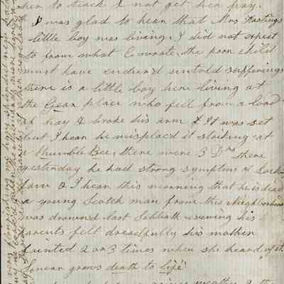 She says she thinks her son Chauncey will have to come home because of his financial situation. She proposes giving him a farm they own if none of the other children object. In passing she mentions that she is glad that the Hastings boy is O.K. (This is probably referring to the riding accident that 10 year old Willie Hastings had in June of 1858. see news clipping below.) The accident and the fact that the letter is dated Thursday, July 15th, makes the year 1858.