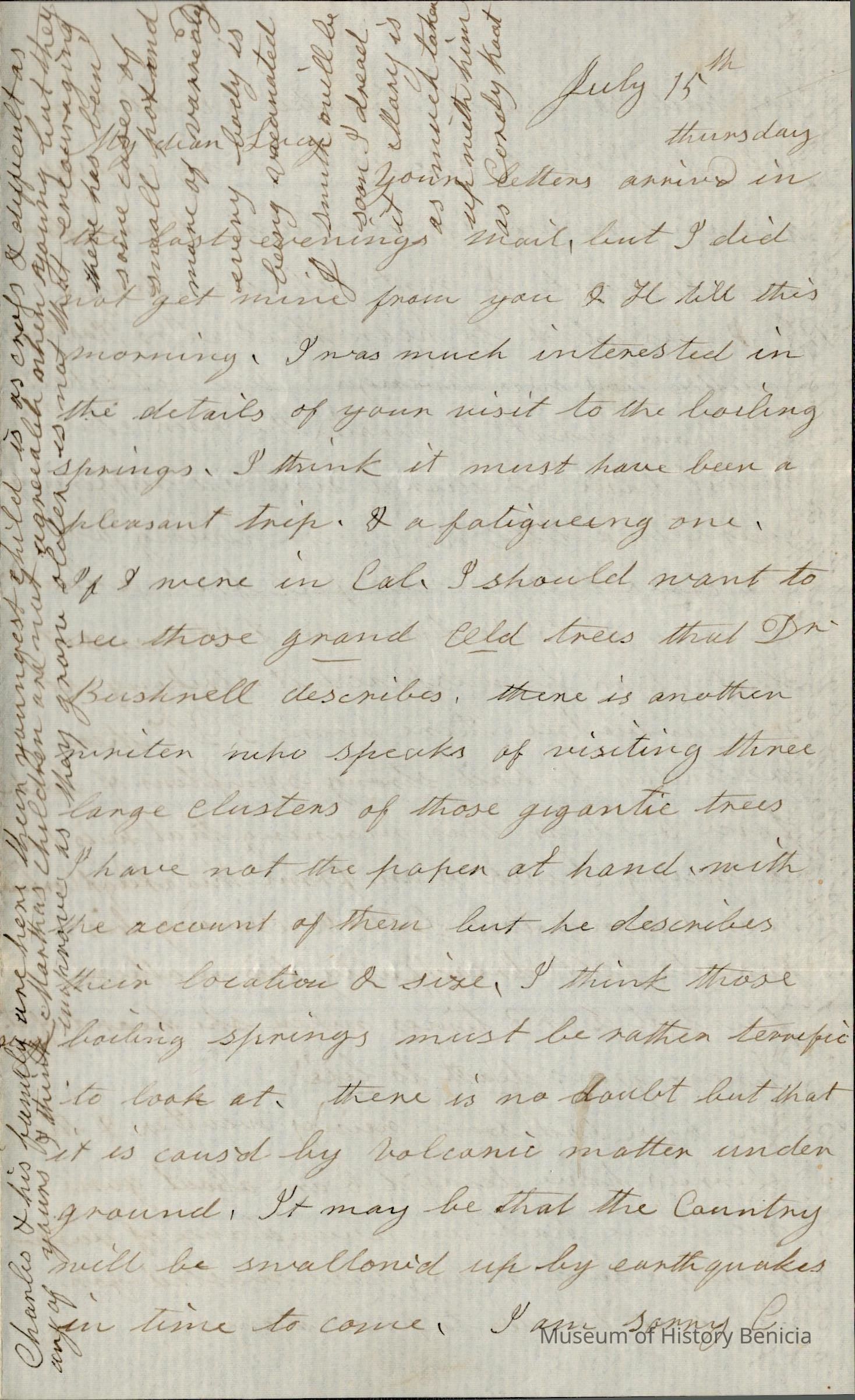 This is a letter, year unknown, but dated Thursday, 07/15 from Mother Rebecca Hubbard Wetmore to Lucy Gray in Benicia. Rebecca mentions a trip Lucy took to the bubbling or boiling springs which could be a spa somewhere in Northern California. She also mentions having read about the large trees (Redwoods) that she would like to visit.