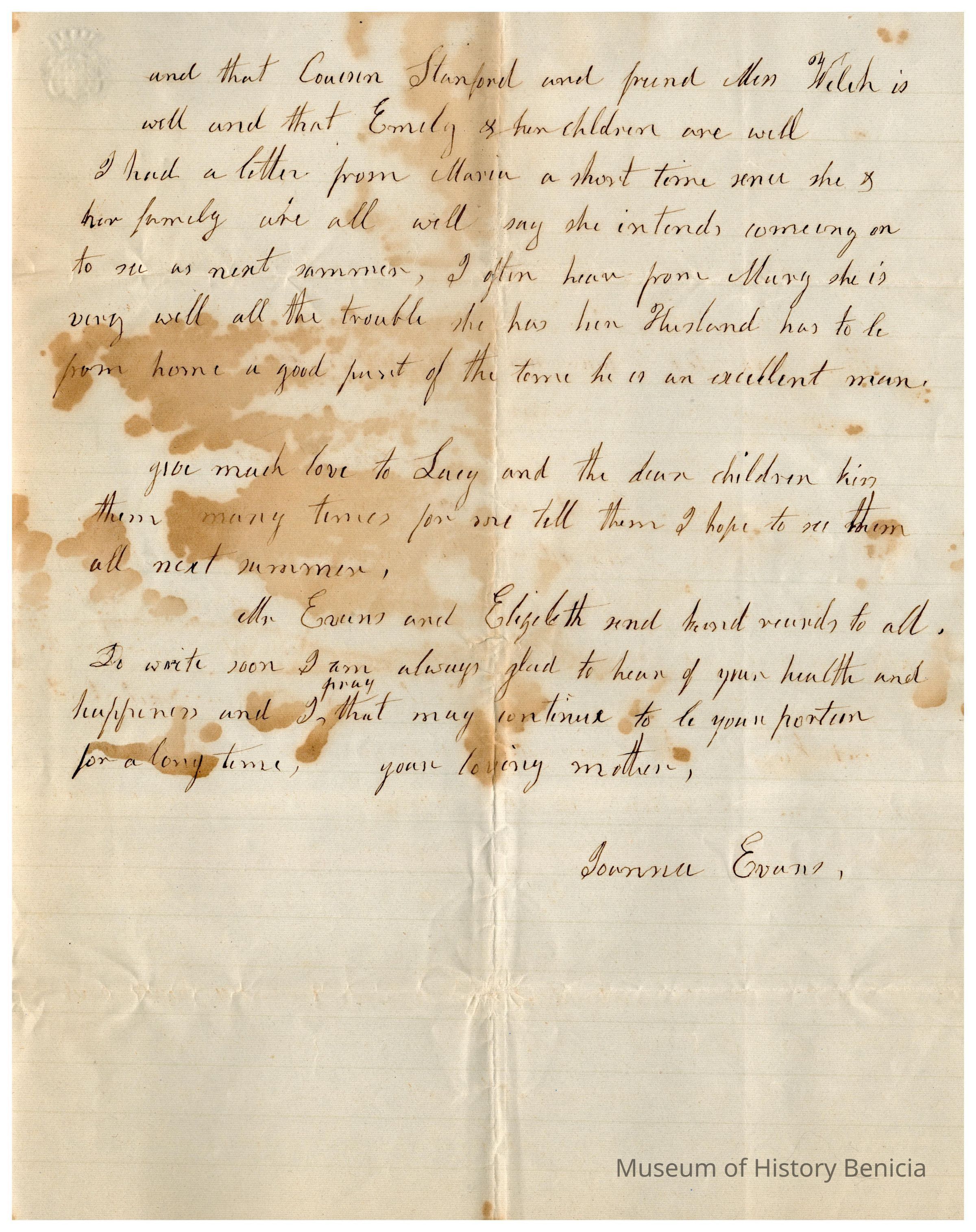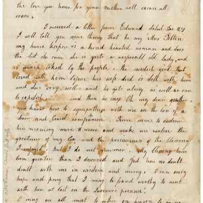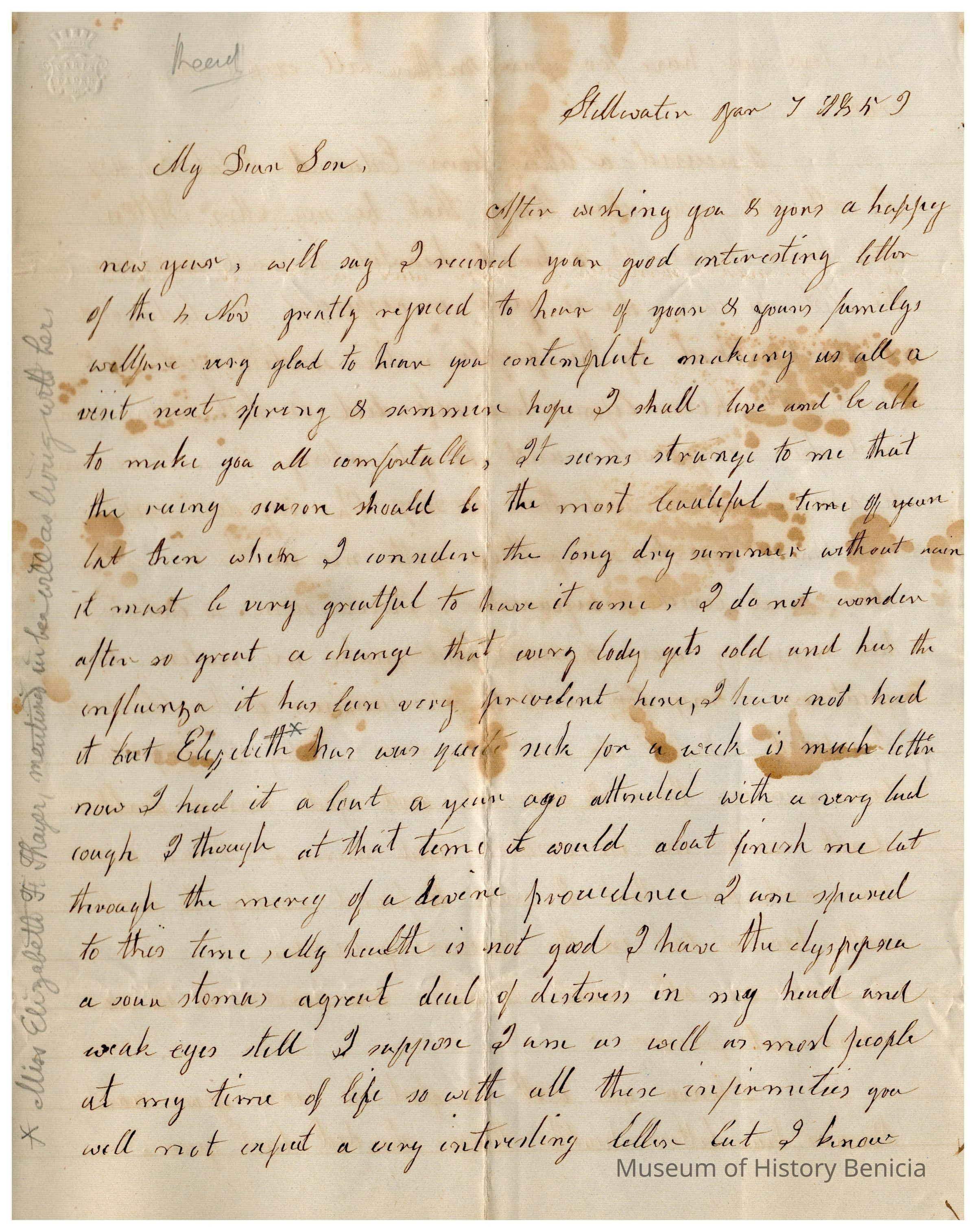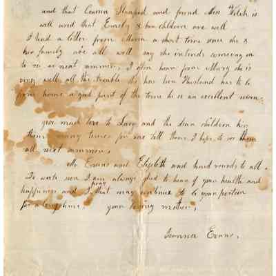 This is a letter to Samuel C Gray in Baltimore from his mother, Joanna Gray Evans, dated 01/07/1859. The letter begins with Joanna expressing her wishes for a happy new year and mentioning her joy in receiving an interesting letter from Samuel. She is pleased to hear about his and his family’s welfare. Joanna discusses her hopes of being together in the upcoming spring and summer. The letter reflects on changes brought by the weather, mentioning people catching colds. Joanna shares her health struggles, noting that she experienced a severe cough recently. Despite her health issues, she maintains a hopeful tone, highlighting her gratitude for life and her correspondence with Samuel.Collection