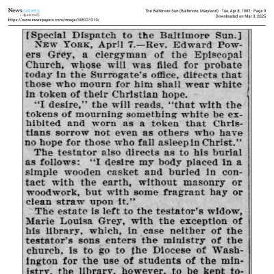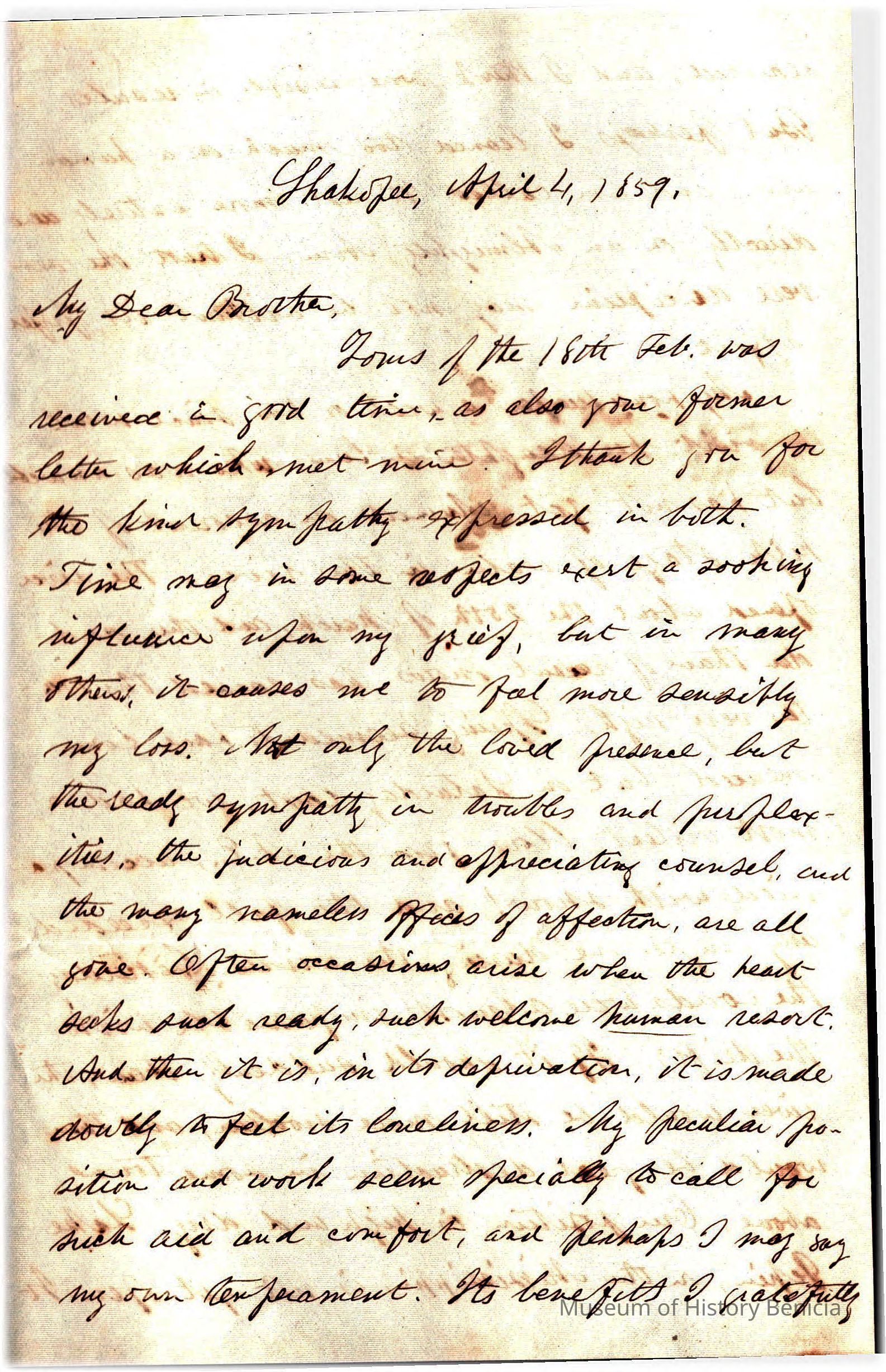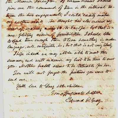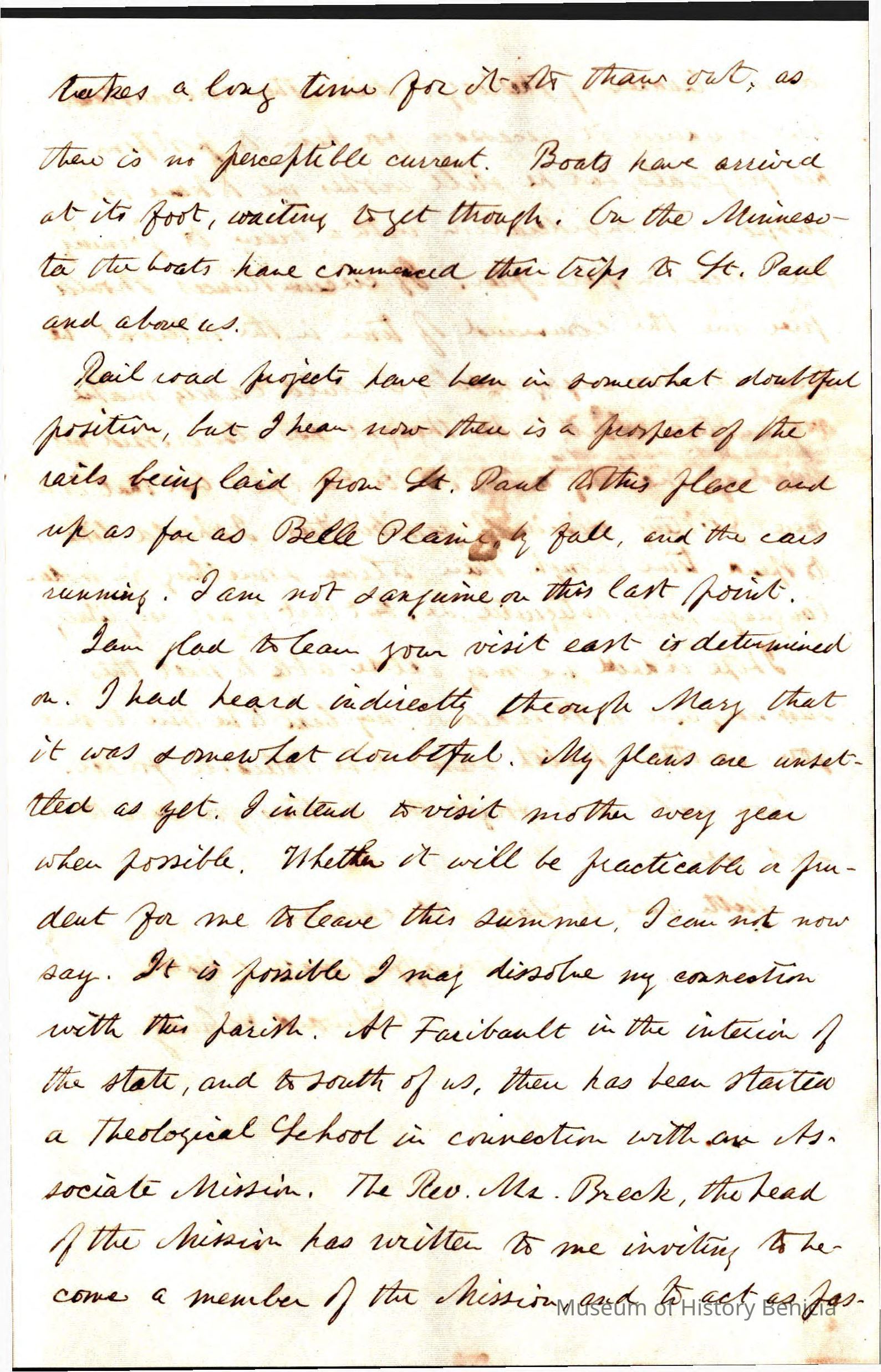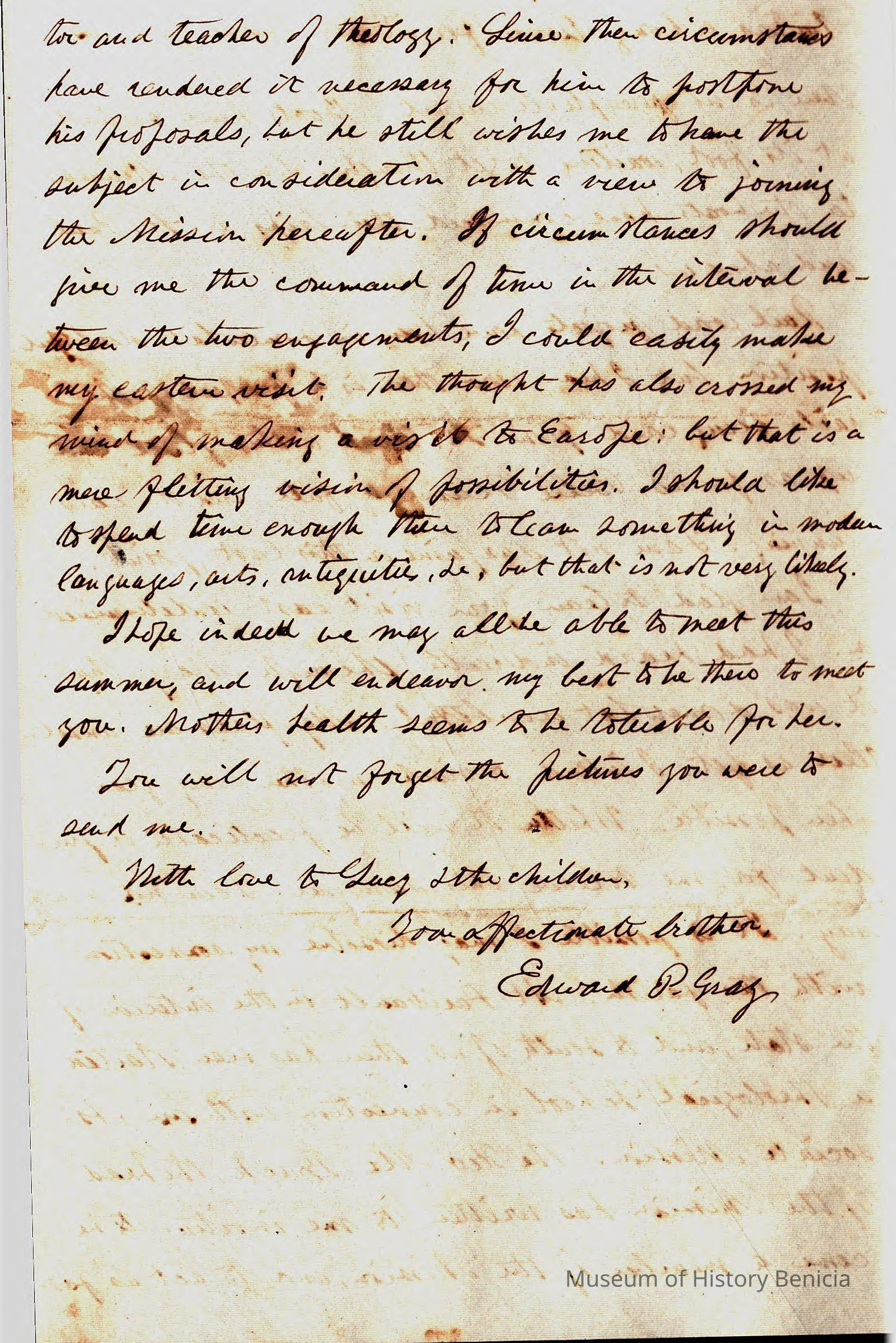 This is a letter from Rev. Edward Powers Gray (1822 - 1902) to Samuel C Gray, his brother dated 04/04/1859 from Shakopee, MN. He is talking about some great tragedy in his life and what he will do going forward. One option is to join Rev. Breck at his theological school. (note: This is the same Mr. Breck who started St. Augustine's and St' Mary's in Benicia.)Collection