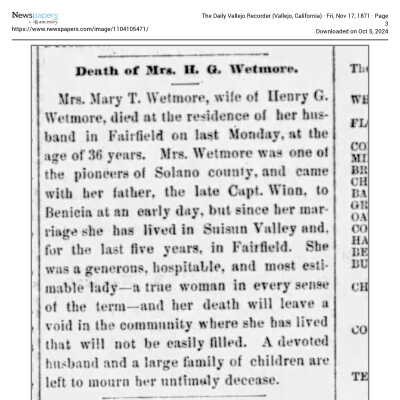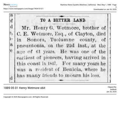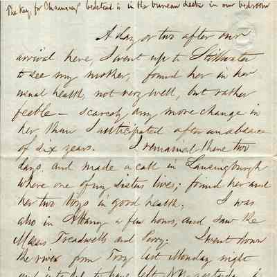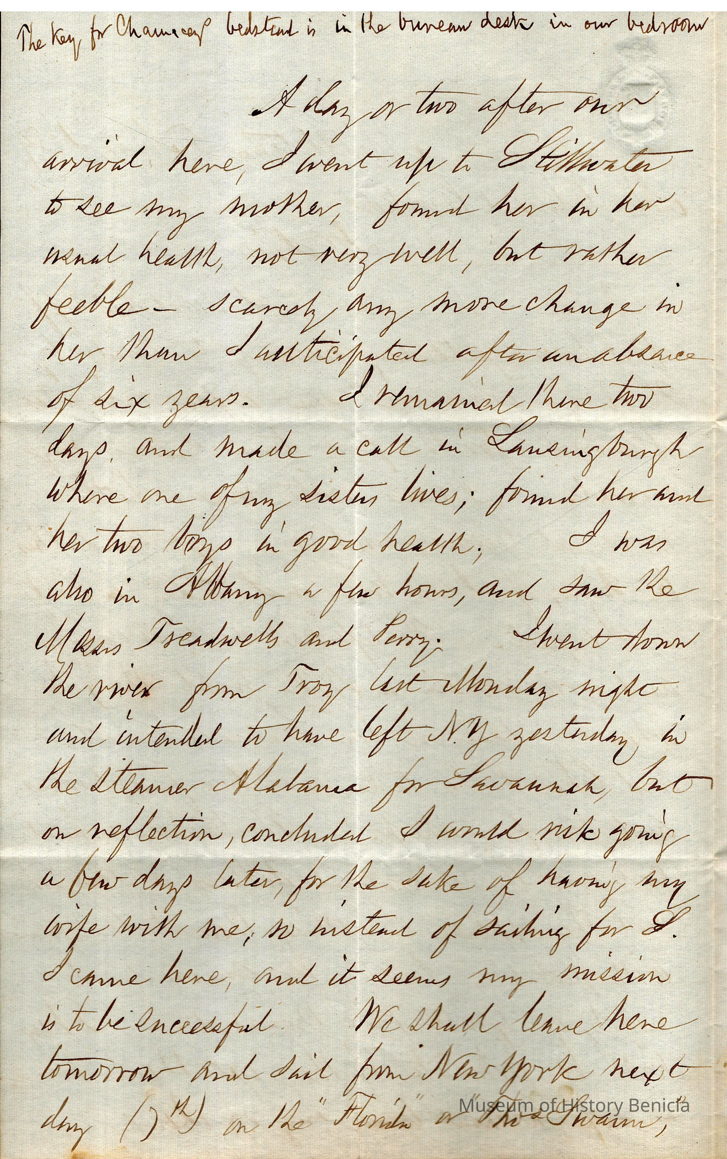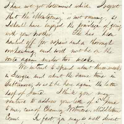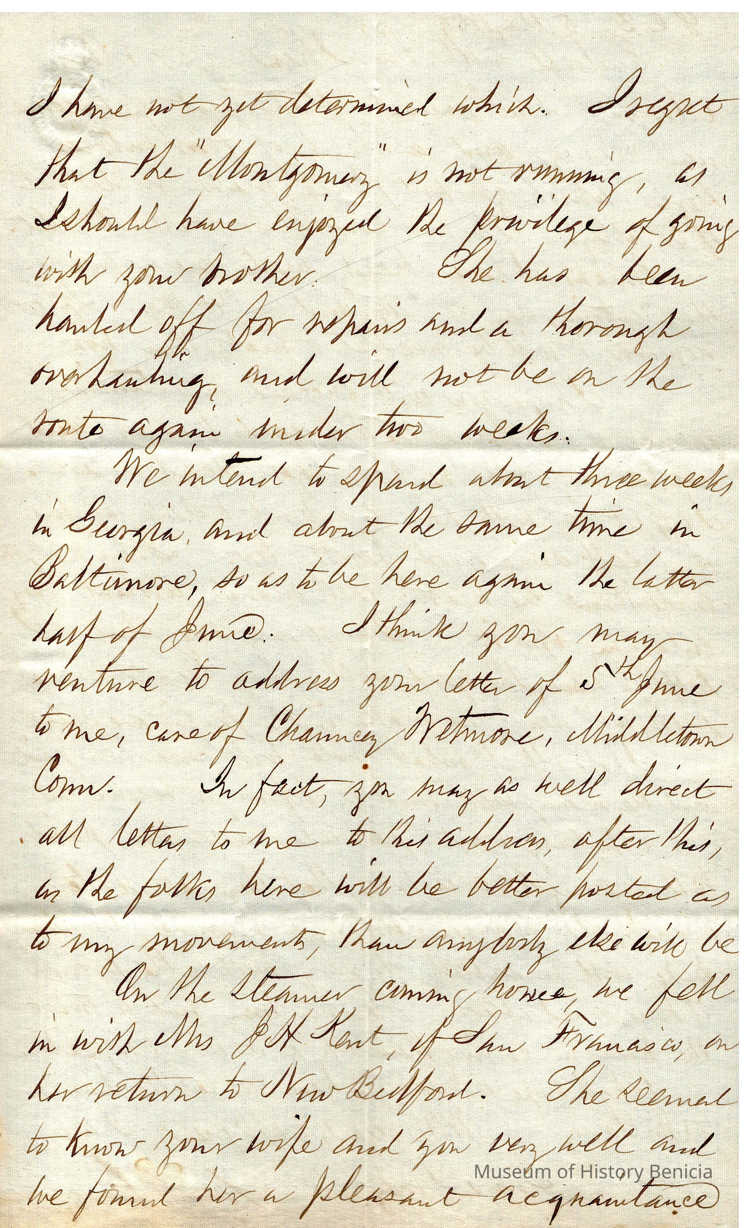 He says they expect to stay about three weeks in Baltimore and three weeks in Georgia. Suggests that mail be sent to Chauncey Wetmore (senior) in Middletown, MD. The last part of the letter concerns business matters and the rental of their house in Benicia.Collection