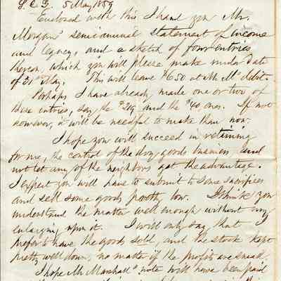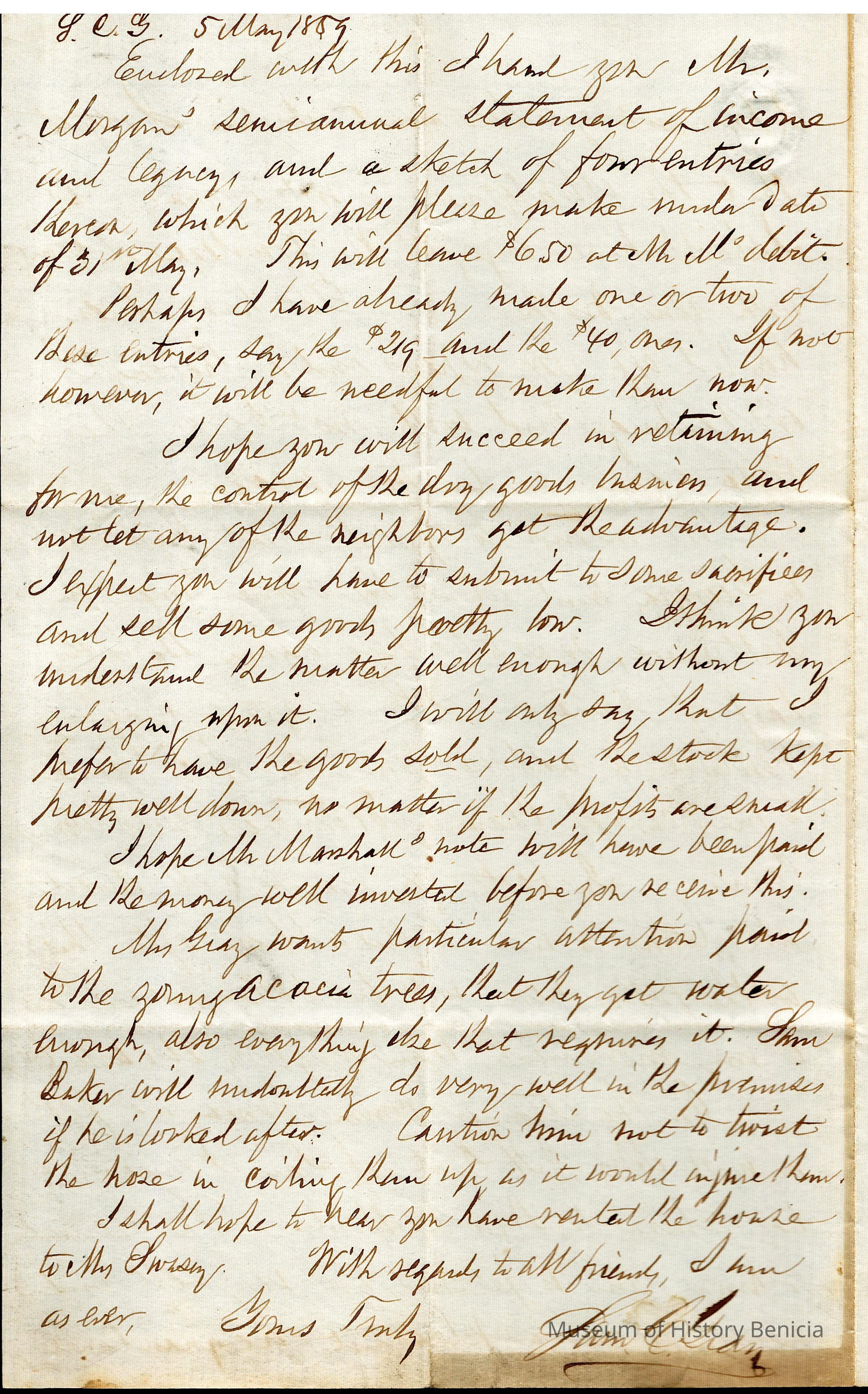 This is a letter from Samuel C Gray to Mr. Edward Crocker dated 05/05/1859. Mr. Gray is traveling and plans to send the letter by Henry Wetmore (1828 - 1889), Chauncey Wetmore's younger brother who lived in Fairfield at the time.