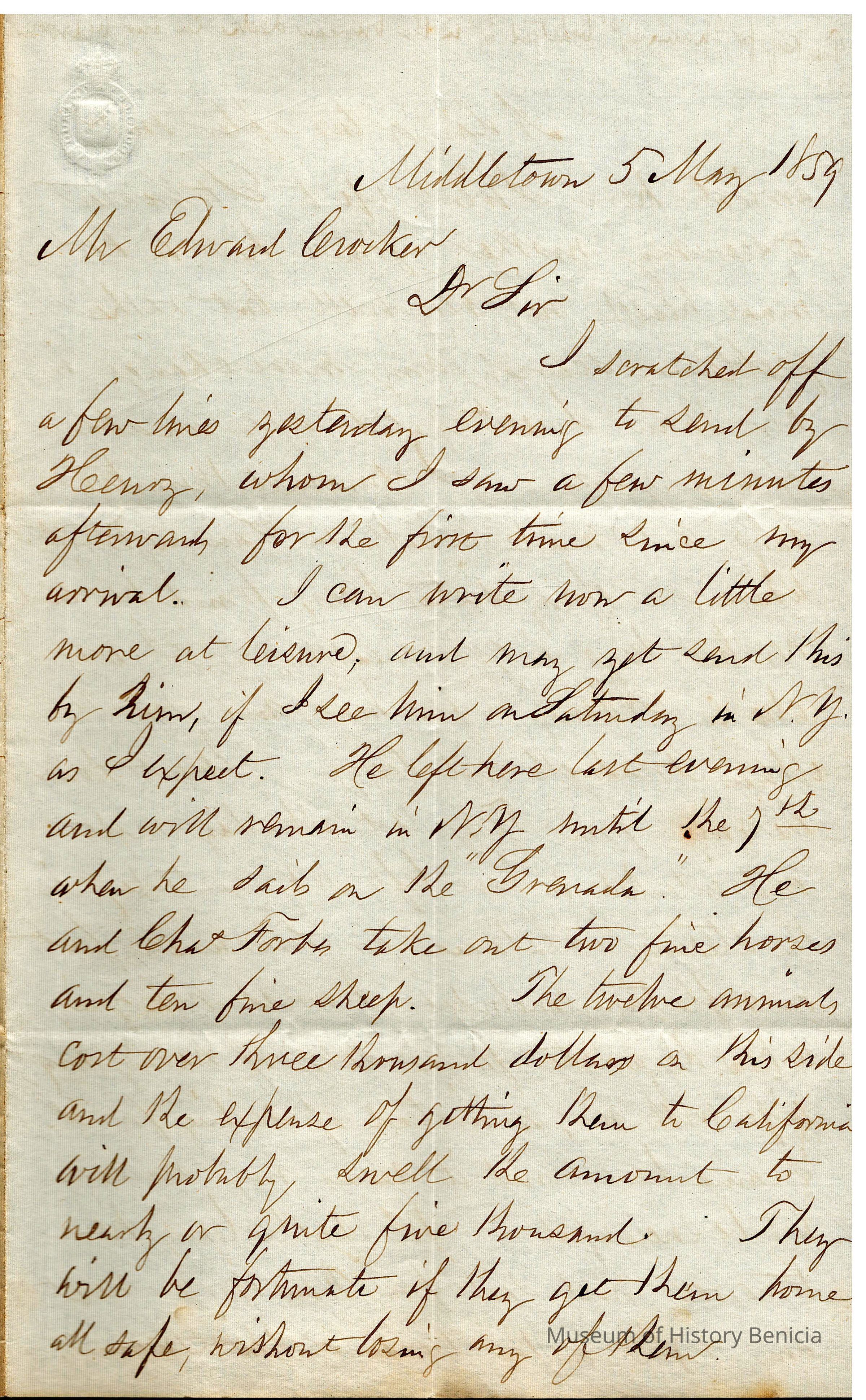 He talks about Henry transporting two horses and 10 sheep back to Solano County from New York. Mr. Gray doesn't think they will all arrive safely in California.
