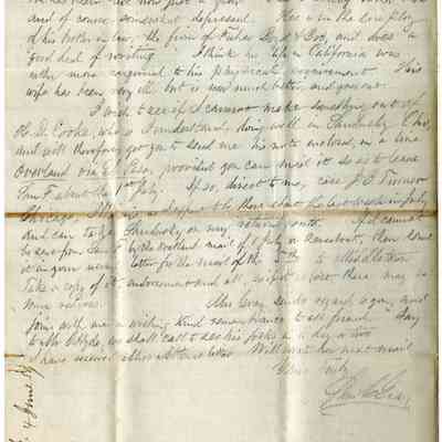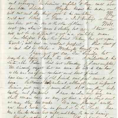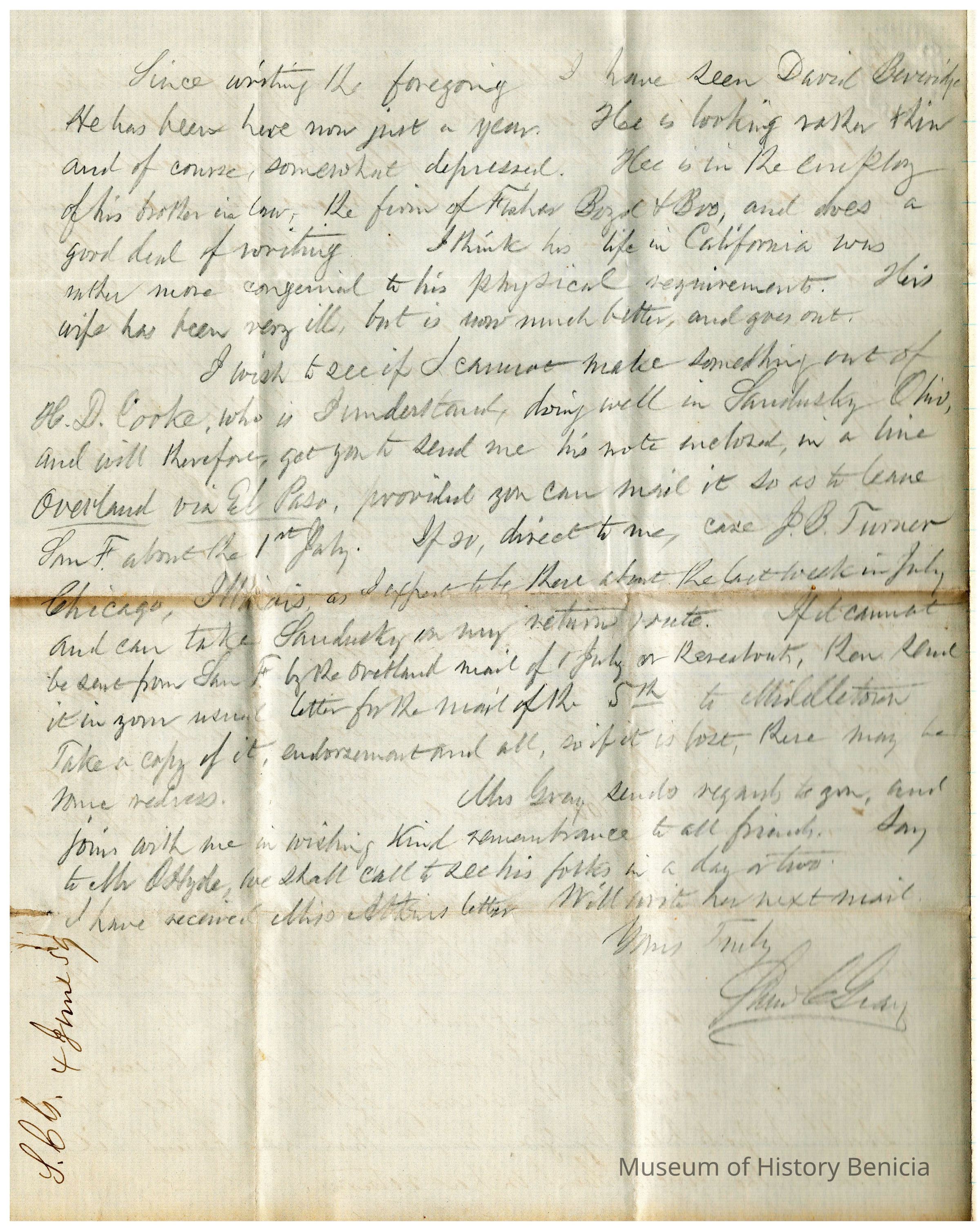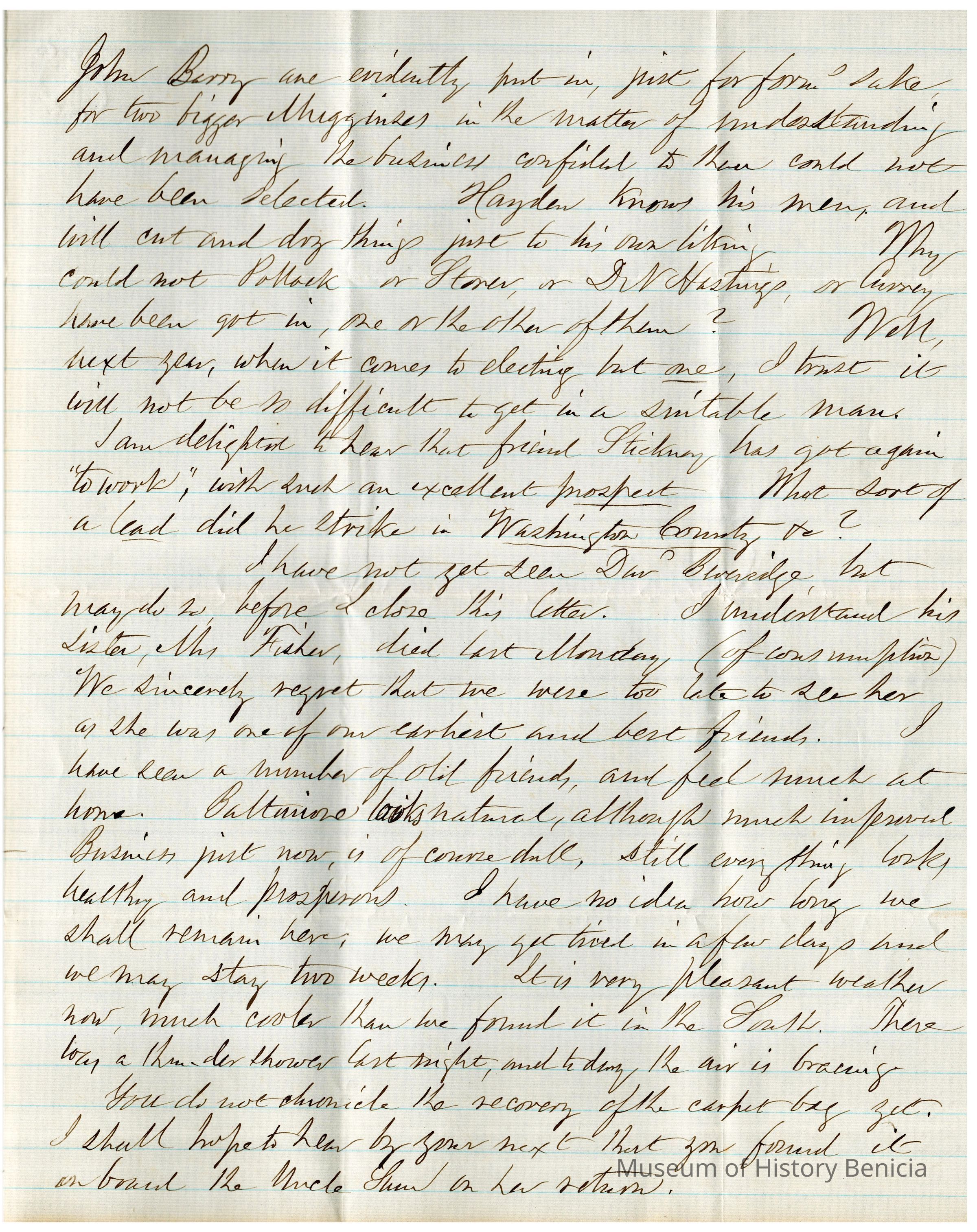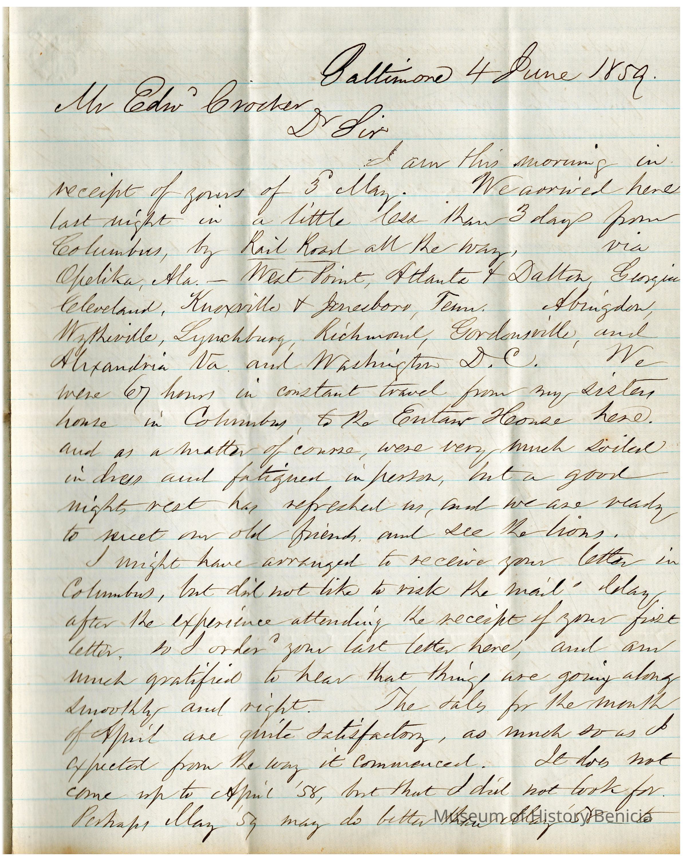 This is a letter from Samuel C Gray to Mr. Edward Crocker dated 06/04/1859. Mr. Gray is traveling. He notes that they arrived in Baltimore from Columbus, GA in 3 days via railroad. He mentions the recent Benicia elections and is not happy that C. W. Hayden was elected and not Stoner, D. W. Hastings, or Curry.Collection