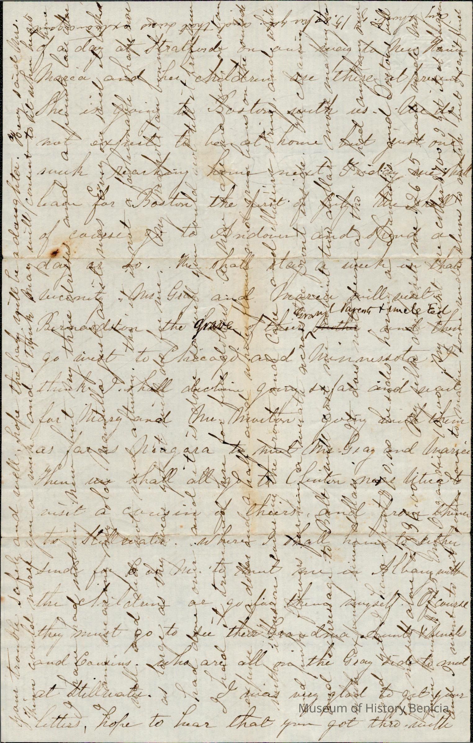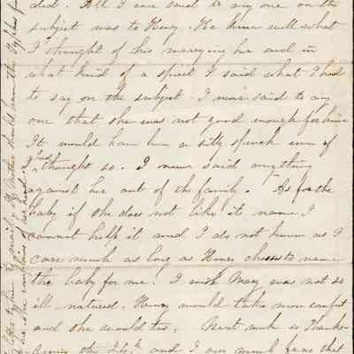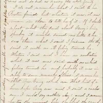 This is a letter probably from Rebecca Wetmore to Lucy Gray regarding family affairs. The letter is written in a cross-hatch fashion and the first two pages are very hard to read. The last two pages talk of Henry Wetmore's (1828 - 1889) wife Mary Winn (1835 - 1871). The letter writer has evidently expressed her feelings against Mary and she is trying to explain what she may have said and to whom.